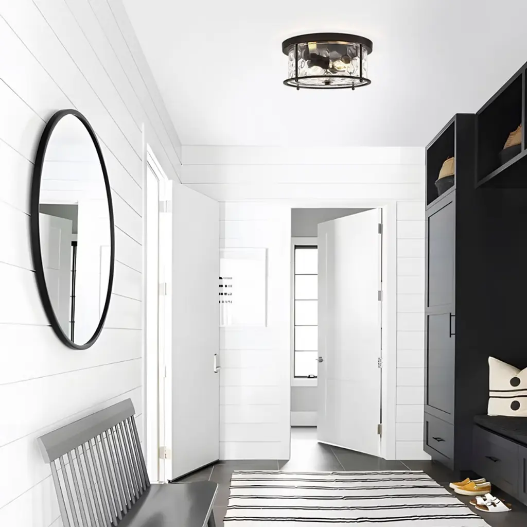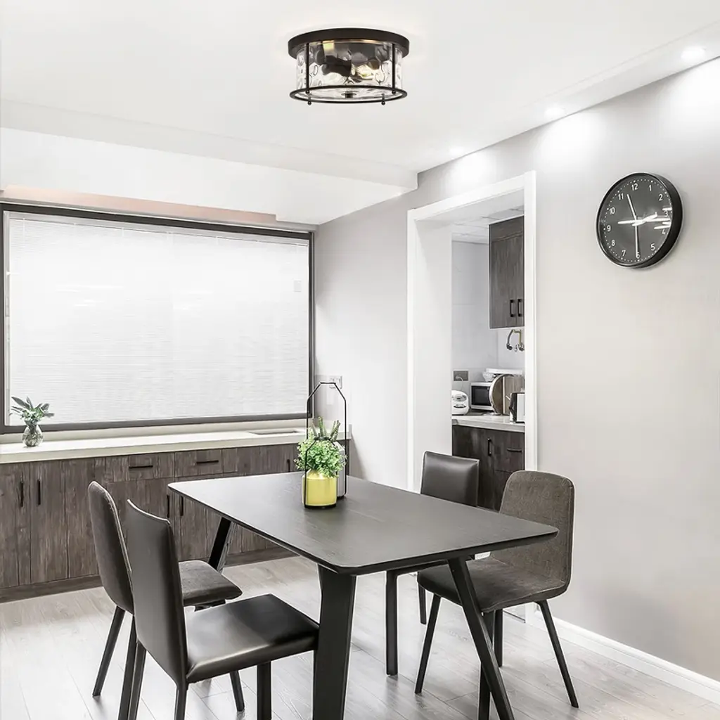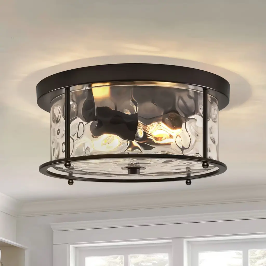 Lamqee Flush Mount Ceiling Light Black With Clear Hammered Glass Industrial 2-lights Farmhouse Close To Ceiling Light Fixtures