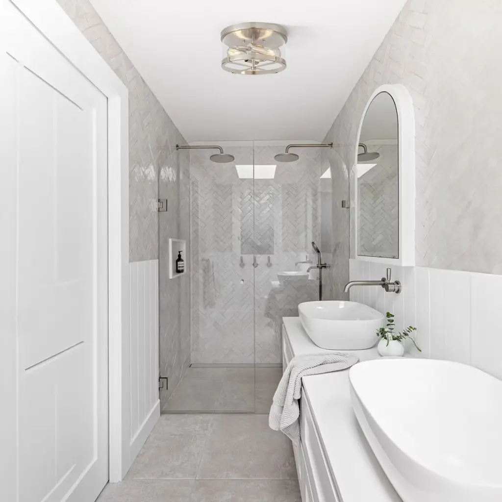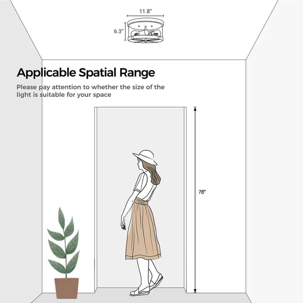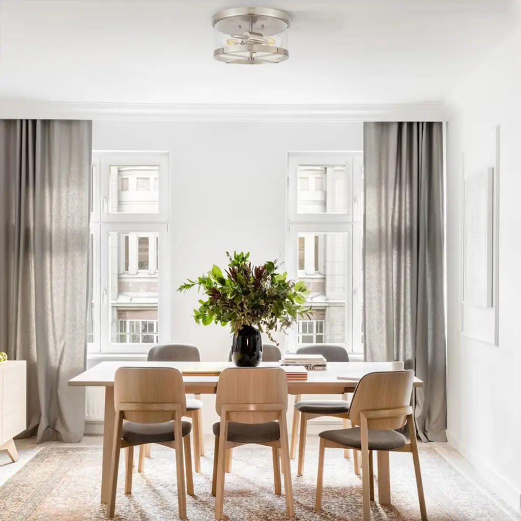 This flush mount ceiling light is made of clear glass with a delicate outer metal frame; and they have different colors such as black, brushed gold, brushed nickel and rustic white, to adapt variety of home styles such as modern, farmhouse, simple and industrial; the bulb is 2-lights, the light passes through the clear glass, the reflection leaves on the wall and ceiling, and the S-bend lamp head is vaguely visible, creating bright, unique, elegant, warm, and soft effect