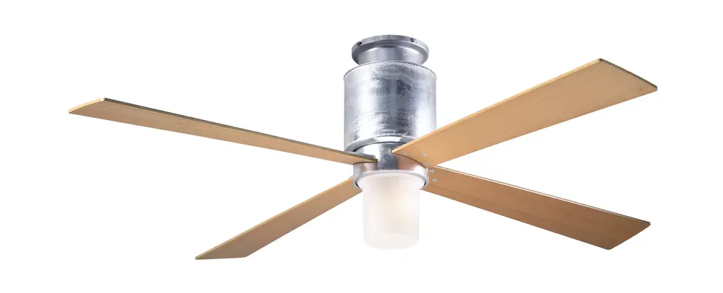 From The Modern Fan Co., the original and premier source for contemporary ceiling fan design: the Lapa Flush Mount Fan in Galvanized Finish with 50" Maple Blades, 17W LED and Fan Speed and Light Control (3-wire).Performance Data:High CFM: 4719.08High Watts: 59.64High CFM/W: 79.12Low CFM: 1470.66Low Watts: 11.13Low CFM/W: 132.08FTC Energy Guide Data:Airflow (CFM): 3196Energy Use (Watts): 38Effidiency (CFM/W): 85Specifications:Blade Pitch: 12 DegreesMotor Size: 153mm x 18mmPrimary Materials: Stamped and Spun SteelBlade Material: PlywoodFinish Process: Hot-dip galvanized