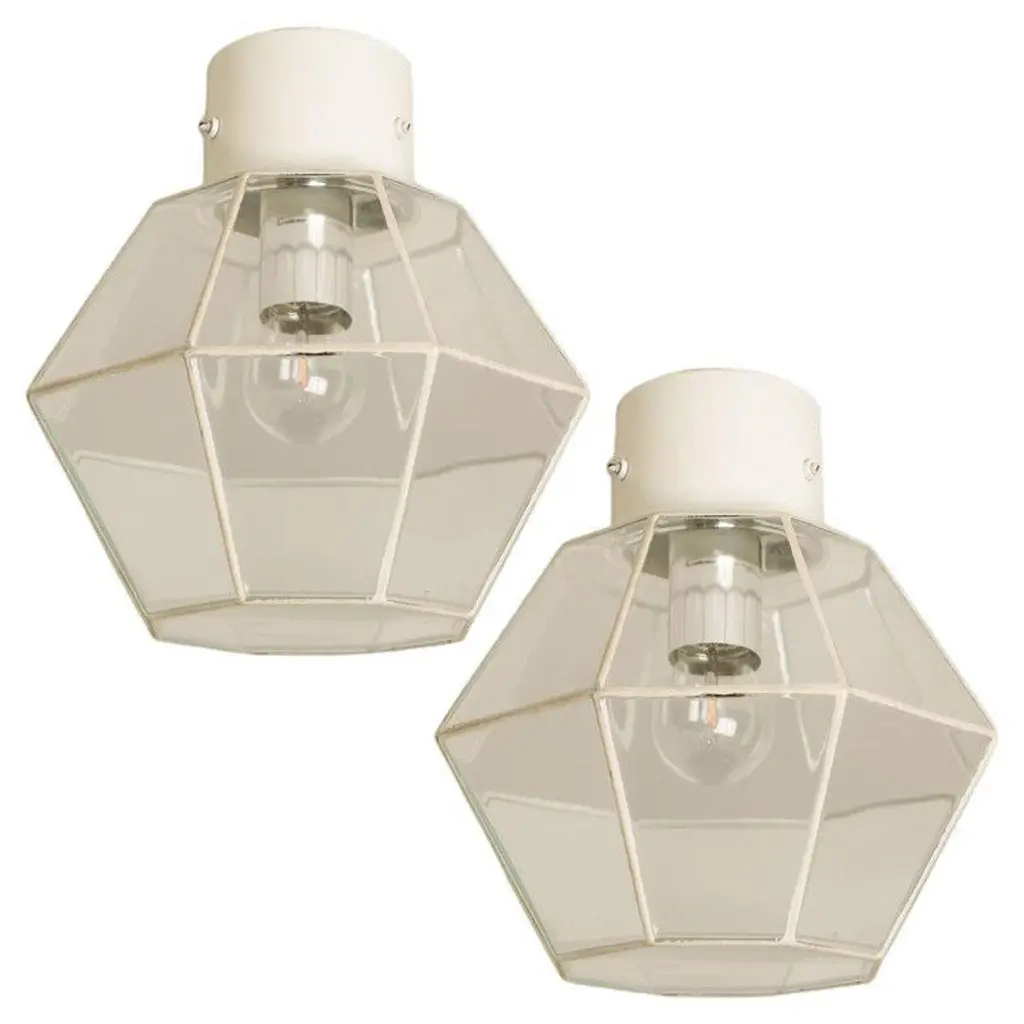 Large Iron & Clear Glass Flush Mount Lights By Glashütte Limburg C. 1965