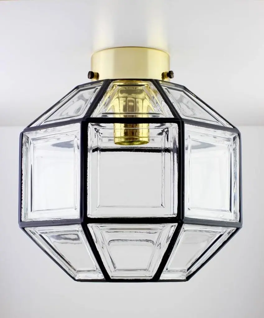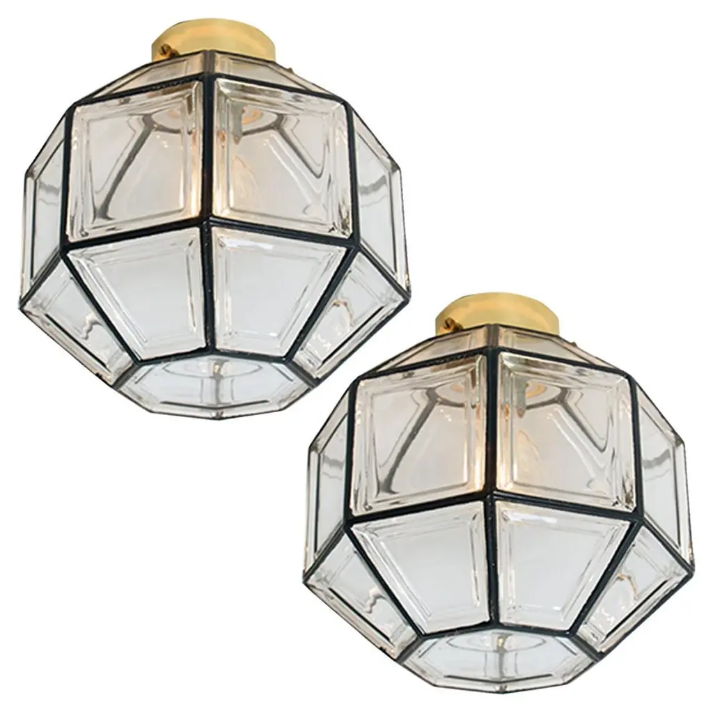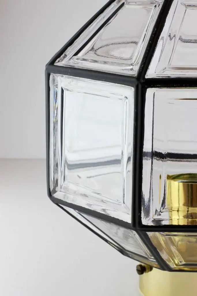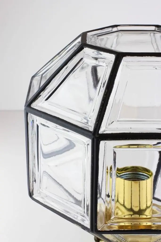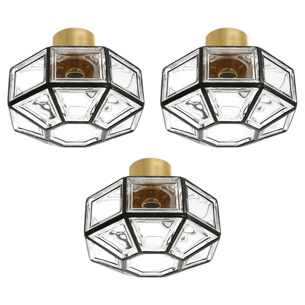 One of three octagonally shaped, Mid-Century Minimalist German made pair of large flush mount lights produced by Glashütte, Limburg, circa 1965. These Contemporary Art Deco and lantern style Plafonnier casts a fantastic light when mounted on the ceiling or wall and used with a gold crowned reflector bulb. We have matching large and small pendants as well as various sizes of matching flush mount lights available - just visit our 1stdibs store for more information.Newly rewired, the light requires one single E27 screw fit light bulb (75 watt max.)Three available - Priced individually.