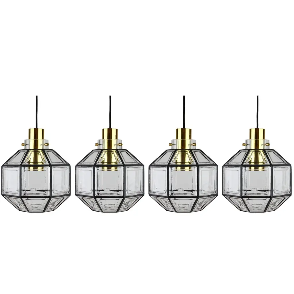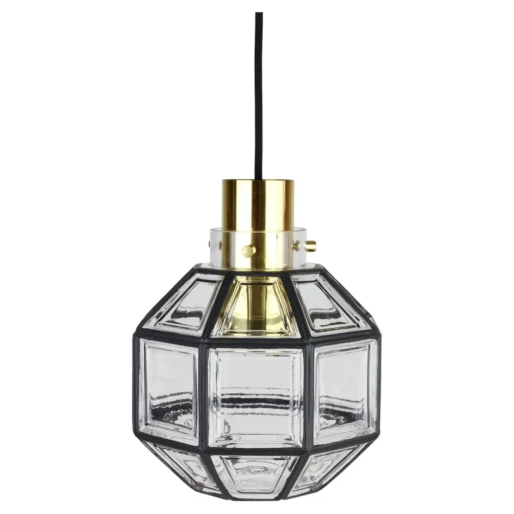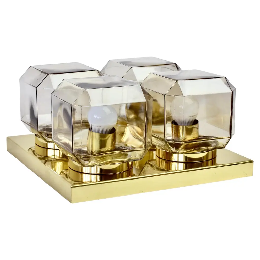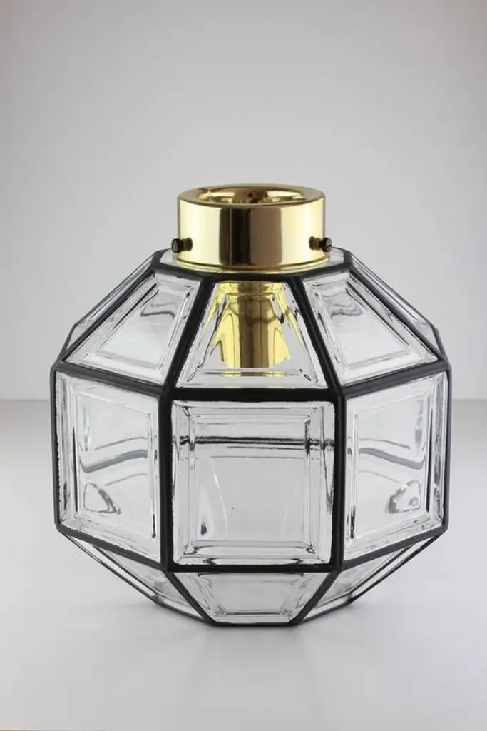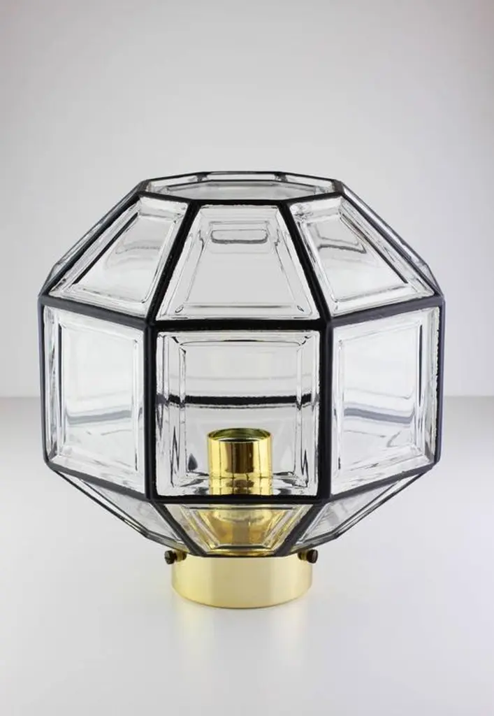 One of three octagonally shaped, Mid-Century Minimalist German made pair of large flush mount lights produced by Glashütte, Limburg, circa 1965. These Contemporary Art Deco and lantern style Plafonnier casts a fantastic light when mounted on the ceiling or wall and used with a gold crowned reflector bulb. We have matching large and small pendants as well as various sizes of matching flush mount lights available - just visit our 1stdibs store for more information.Newly rewired, the light requires one single E27 screw fit light bulb (75 watt max.)Three available - Priced individually.