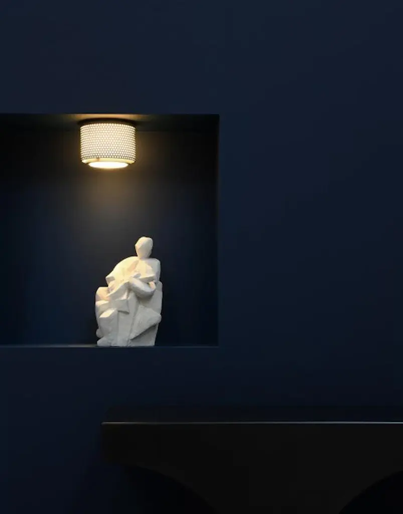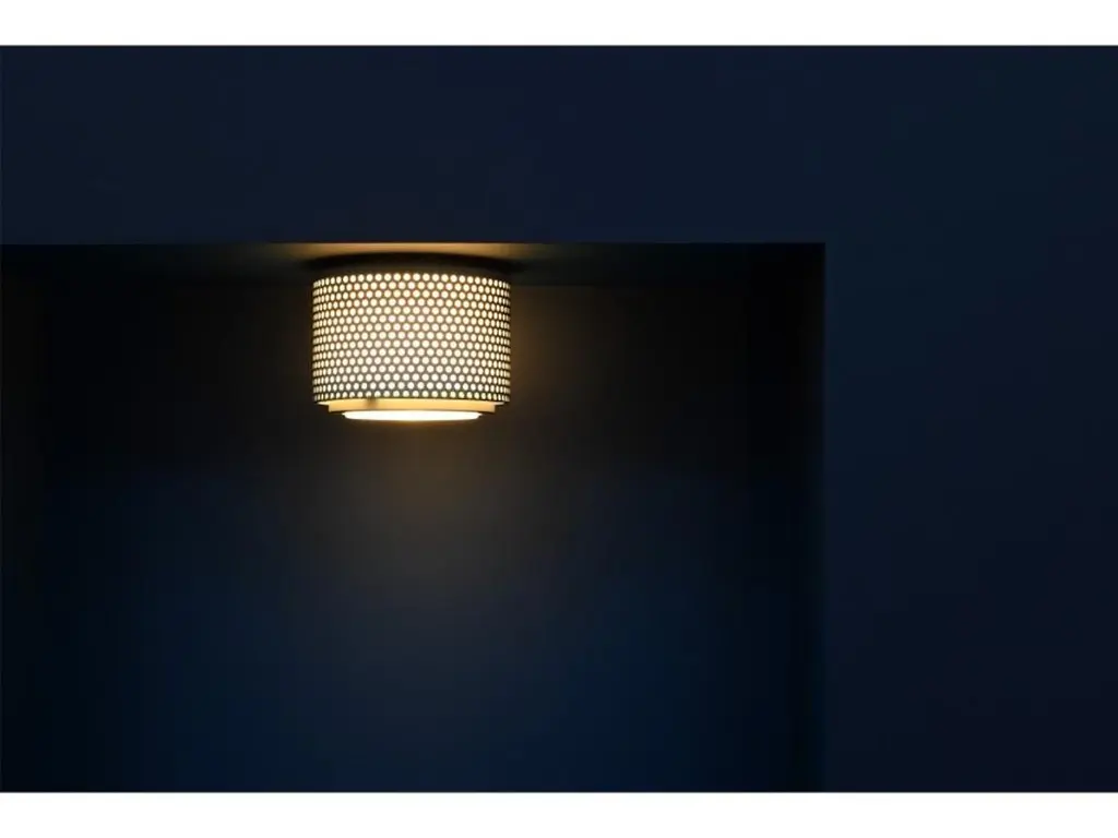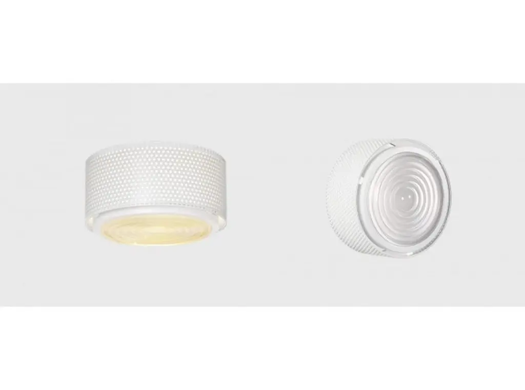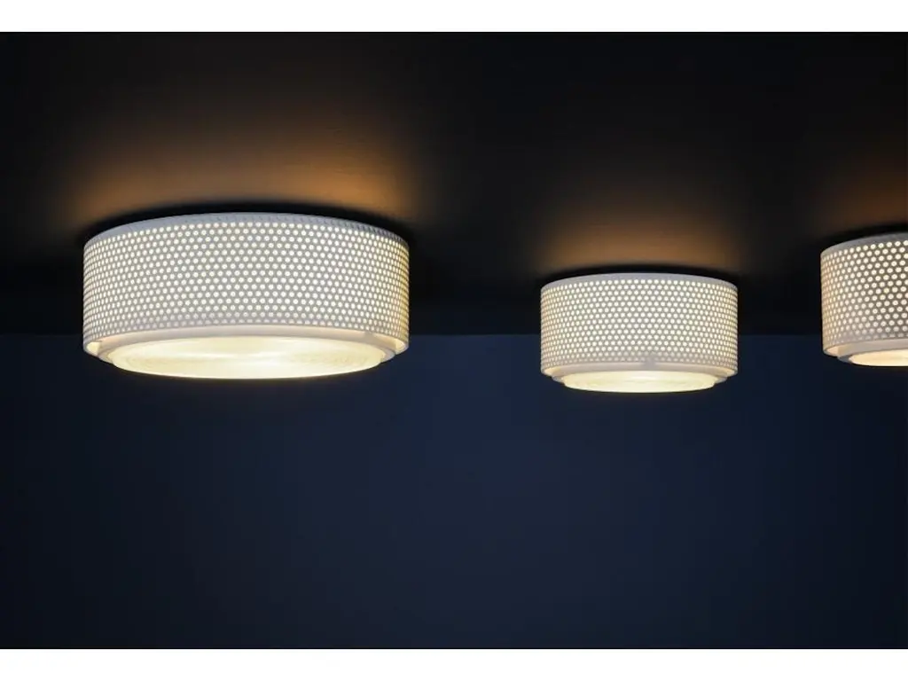 Large Model G13 flush mount wall/ceiling light by Pierre Guariche. Originally designed in 1952, this current edition is made in France by Sammode Studio. White perforated metal base, authentic Fresnel glass lens. Wired for U.S. standards The G13 is available in 3 sizes (small, medium and large) and 3 finishes black, white and grey, and can be used alone or as a series to create as many compositions as desired. Manufactured, assembled and packaged at the Châtillon-sur-Saône production plant in the Vosges region of France. Manufacturer recommends Power max 11W LED dimmable bulb. Bulbs not provided.
