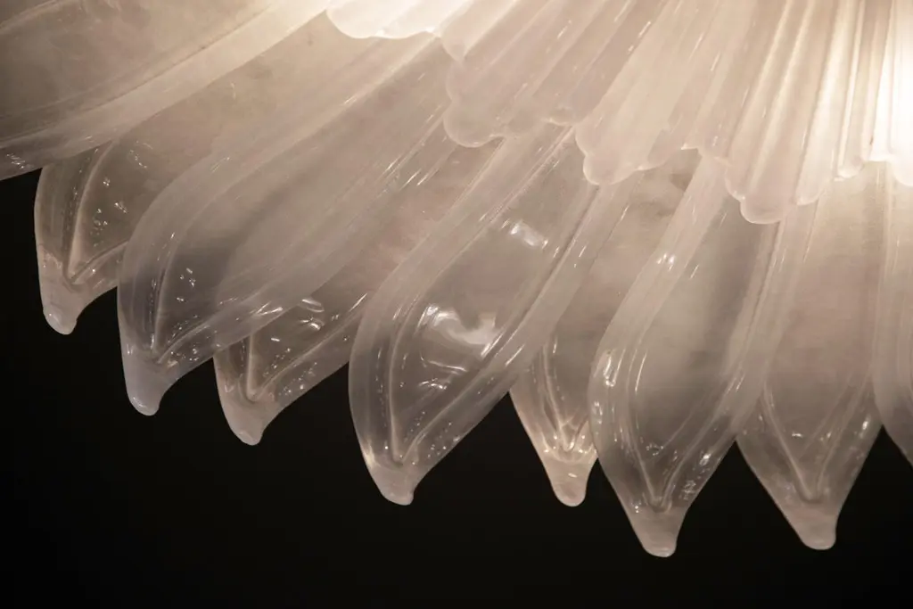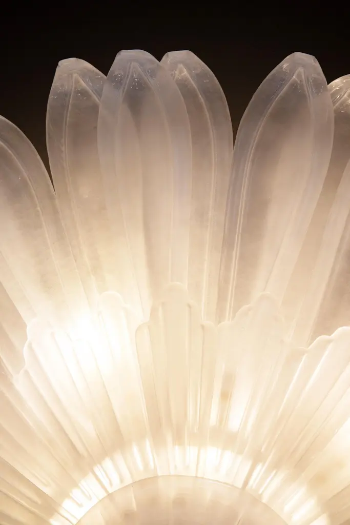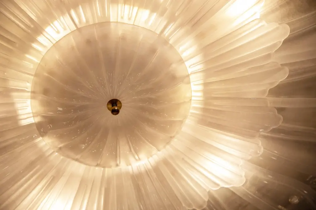 Large Murano glass flush mount flower shaped chandelier, in StockA beautifully sculptural ceiling fixture, this large Murano glass flush mount chandelier is shaped like a stylized flower, featuring two tiers of hand-blown frosted glass petals that radiate outward from a central glass finial. The layered design creates a soft, diffused glow and brings a touch of organic elegance to both modern and classic interiorsAvailable to ship now from our Miami galleryRewired to US standard