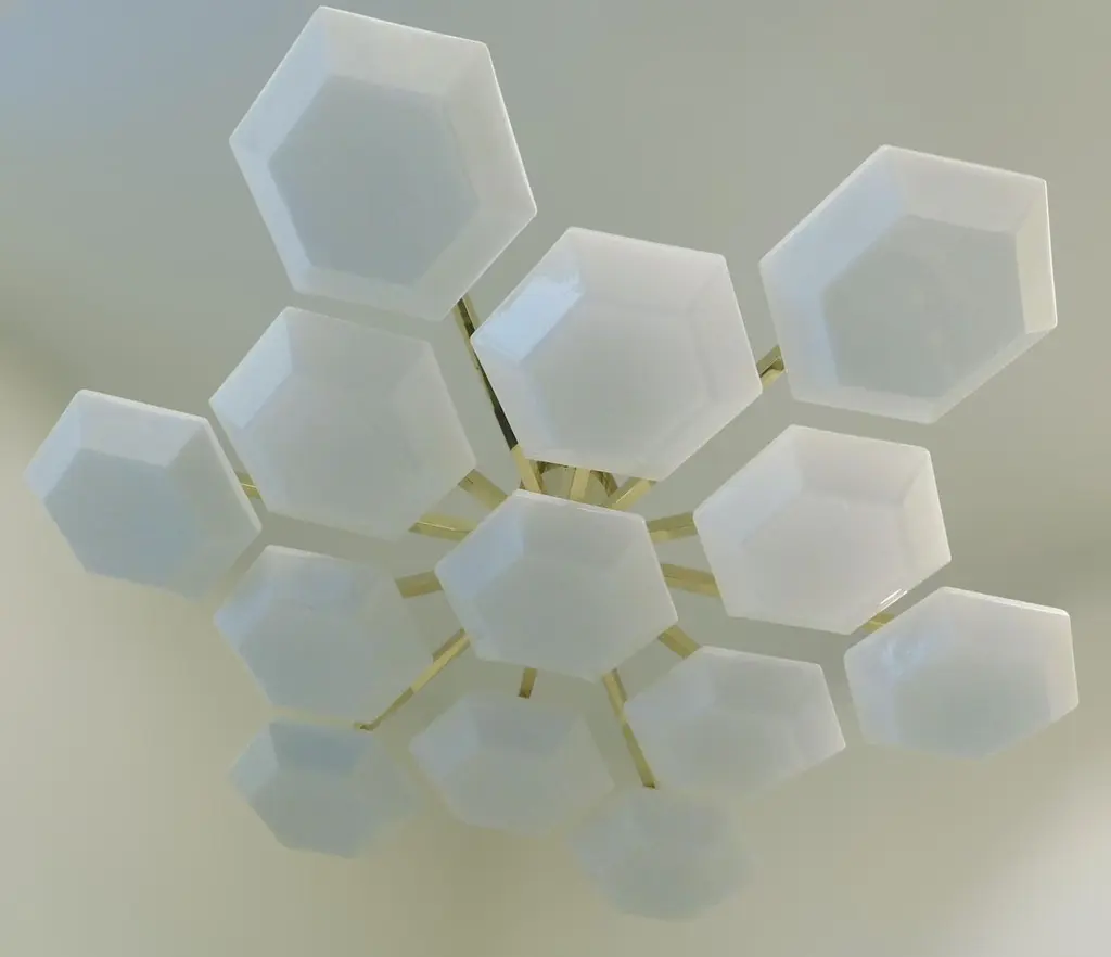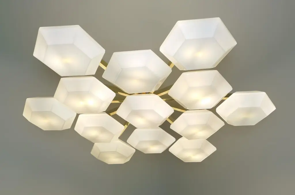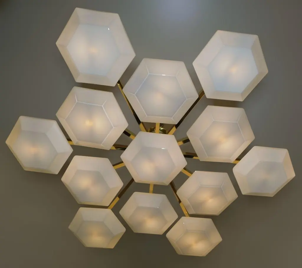 Italian flush mount with large white hexagonal Murano glass shades mounted on brass frame / Made in ItalyMeasures: Diameter 47 inches, height 10 inches13 light / G9 type / max 40W each2 available in stock in Italy, price listed is for each itemOrder reference #: FABIOLTD L70