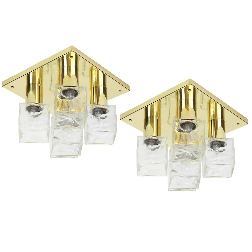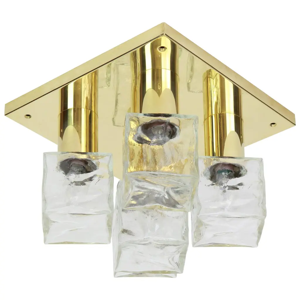 A stunning large flushmount by Kalmar, Austria, manufactured in the 1960s.The flush mount is composed of a 5 thick textured ice glass elements attached to a brass metal frame.Wonderful lights effect.Heavy quality and in very good condition. Cleaned, well-wired and ready to use.The fixture requires five E-14 small bulbs with 40W max each.Light bulbs are not included. It is possible to install this fixture in all countries (US, UK, Europe, Asia, Australia,..)Measures: Width x depth: 31 cm x 31 cm // 12.2 inches x 12.2 inchesThe flushmount will be disassembled and each glass piece individually wrapped for easy and safe transport.2 items are available.The listed price is for one item.