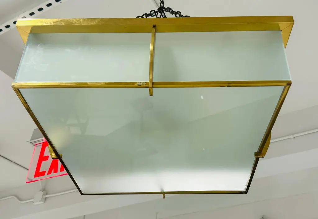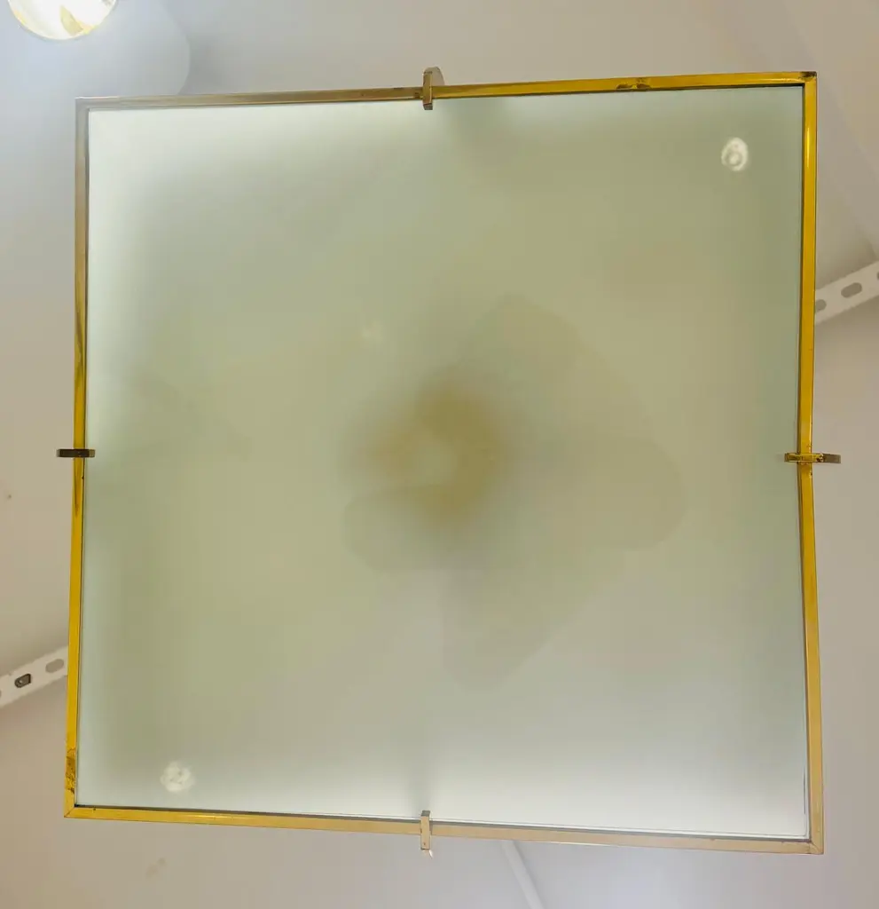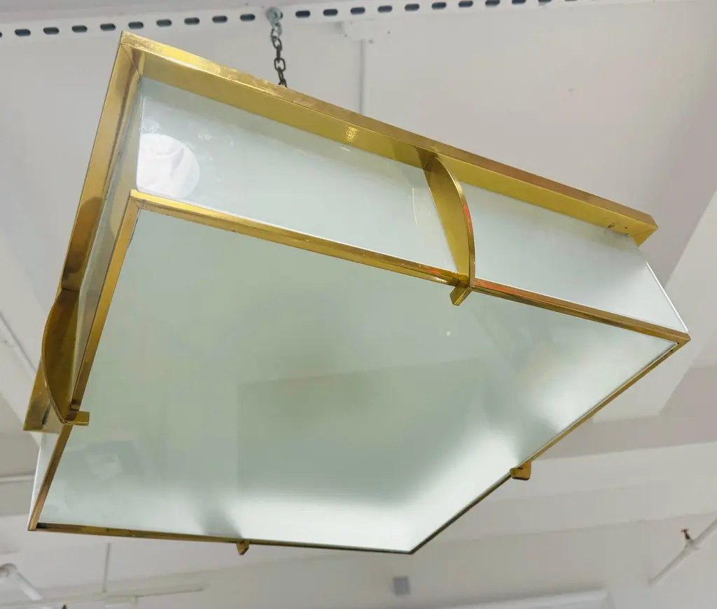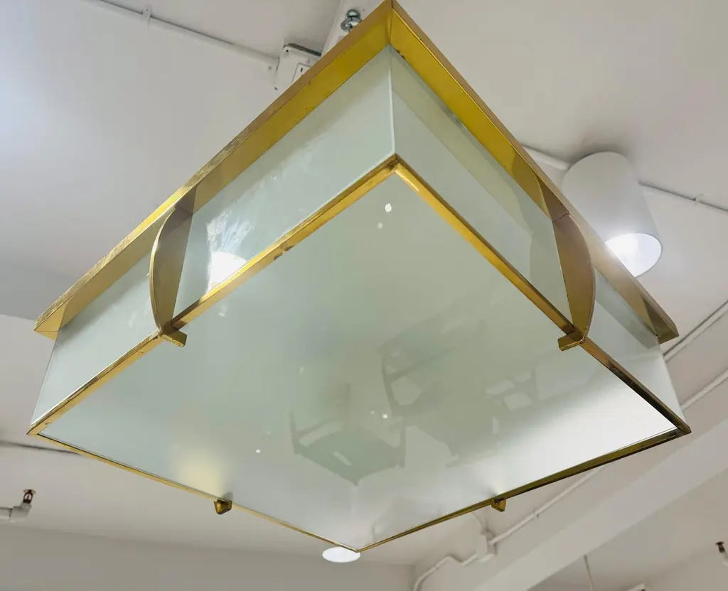 A modern French Art Deco polished brass and frosted glass large flush ceiling lamps by famed lighting maker, Jean Perzel. Rewired 4 standard sockets. Can be sold individually at $4950 each. Two available.