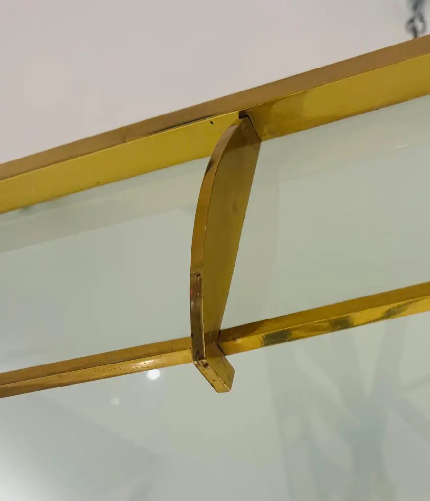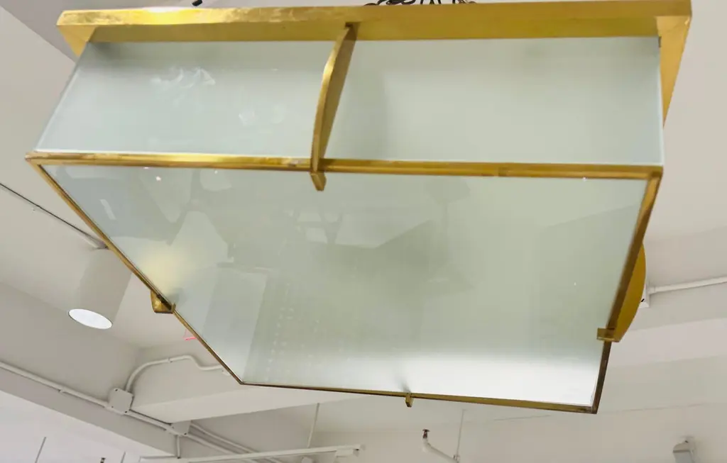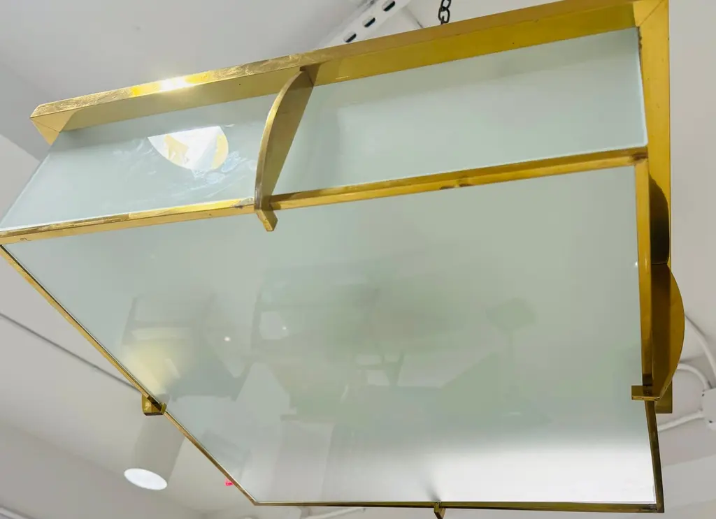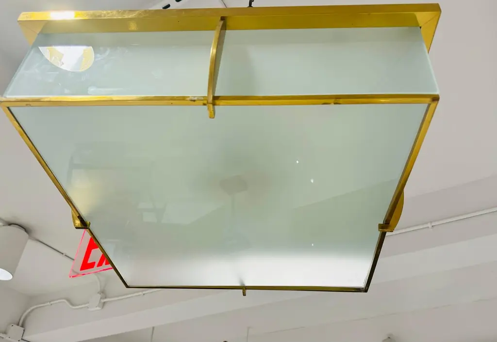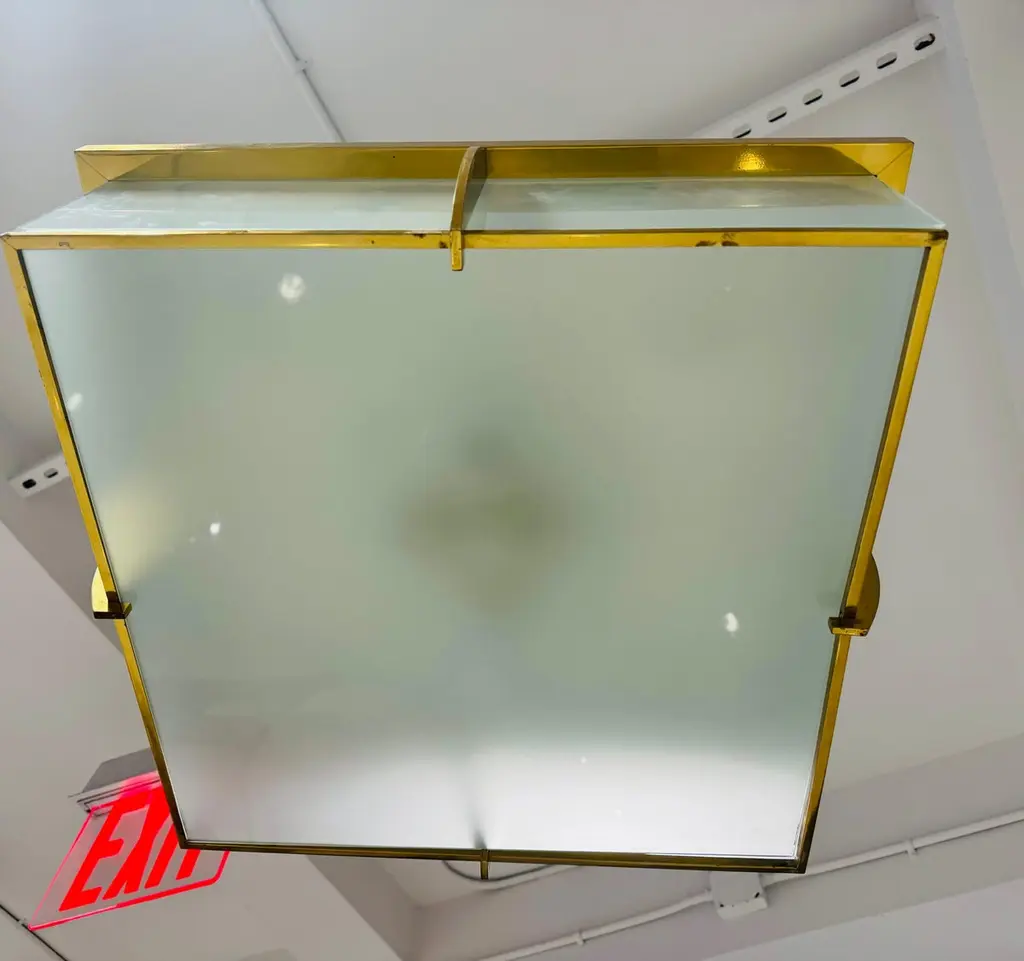 A modern French Art Deco polished brass and frosted glass large flush ceiling lamps by famed lighting maker, Jean Perzel. Rewired 4 standard sockets. Can be sold individually at $4950 each. Two available.