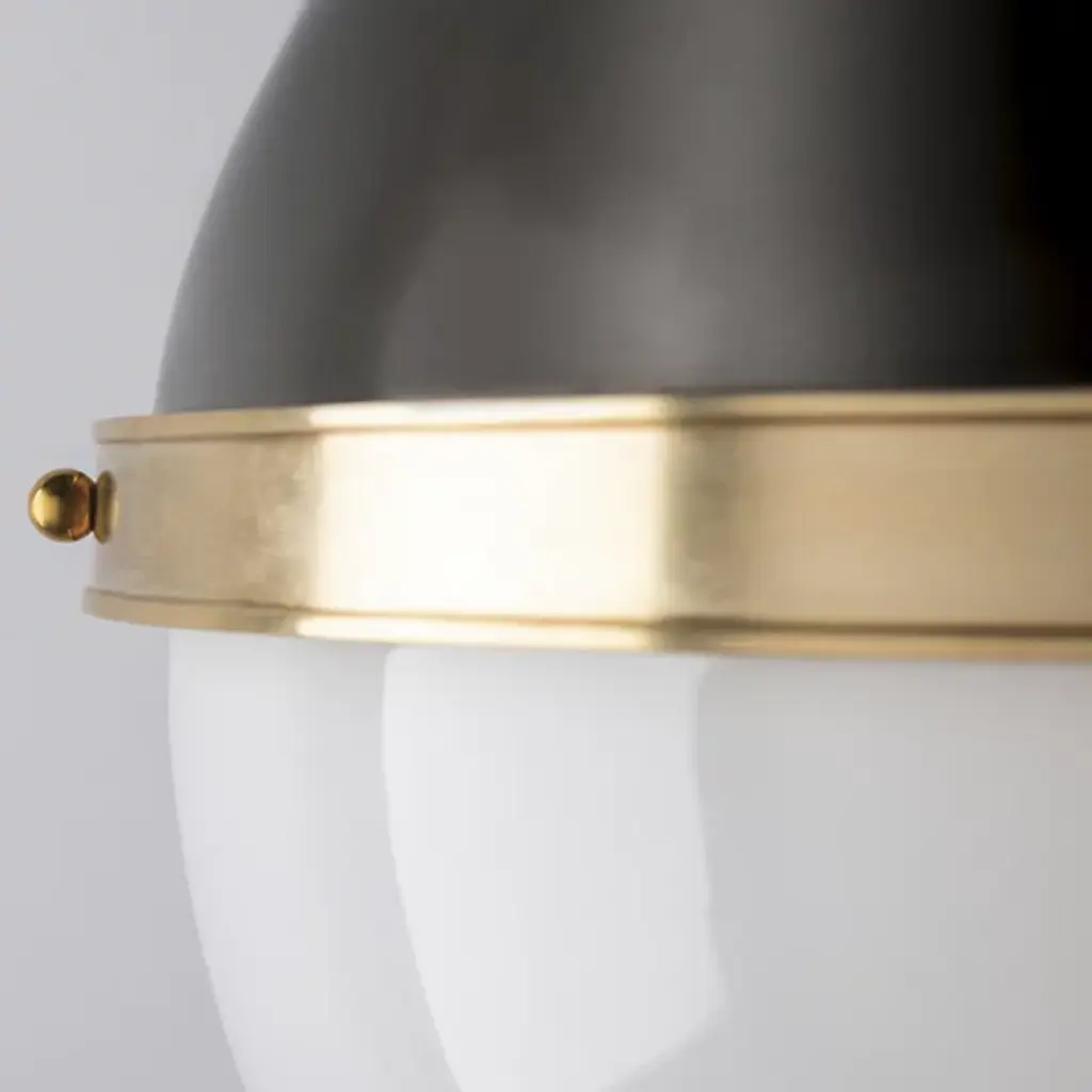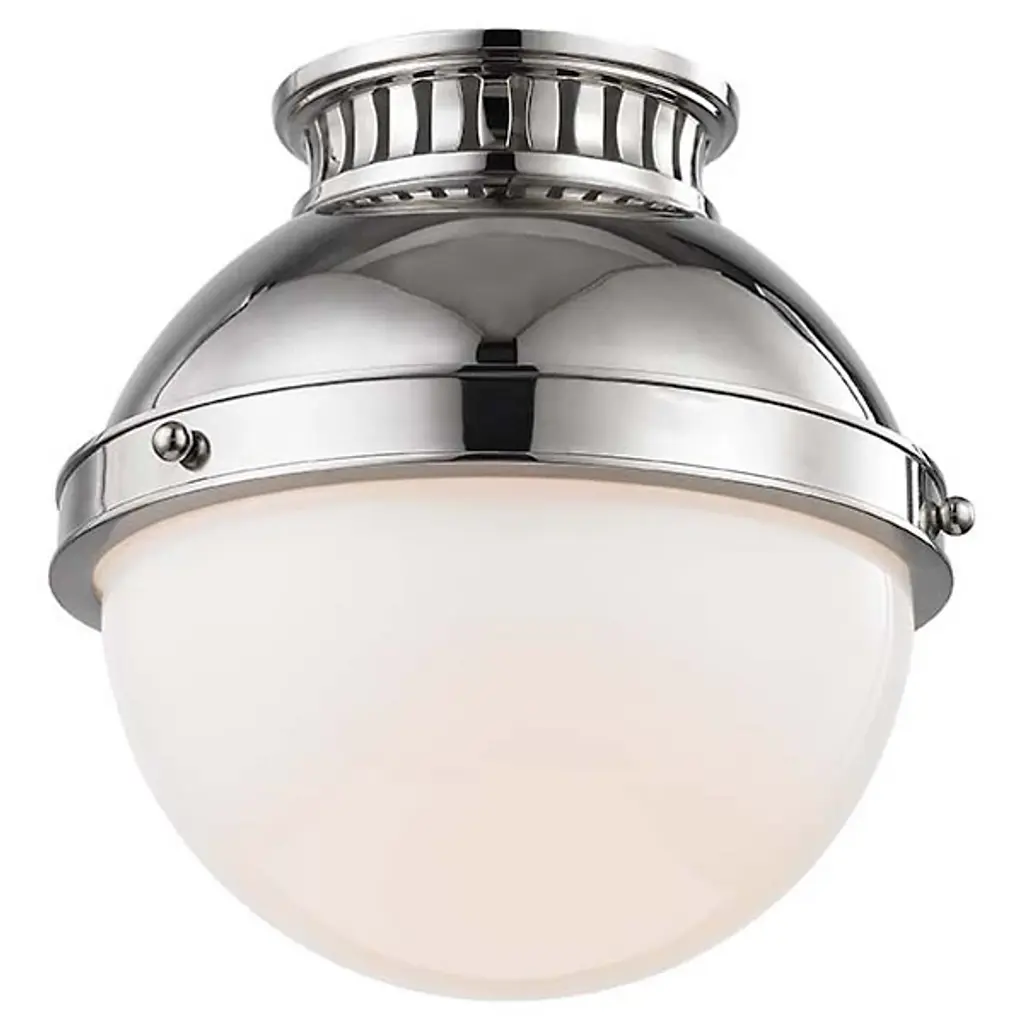 At once elevated and industrial. The Latham Flushmount by Hudson Valley Lighting is masterfully crafted of Metal with a dome-shaped body and an Opal Shiny Glass shade held in place by a pinned waist bracket. A sculptural canopy with a stepped rim anchors the piece seamlessly. Fitted with an E26 medium base, this flushmount uses an incandescent bulb to emit soft, white glow. Mount this design in the center of any ceiling for even overhead lighting and a fresh new focal point.