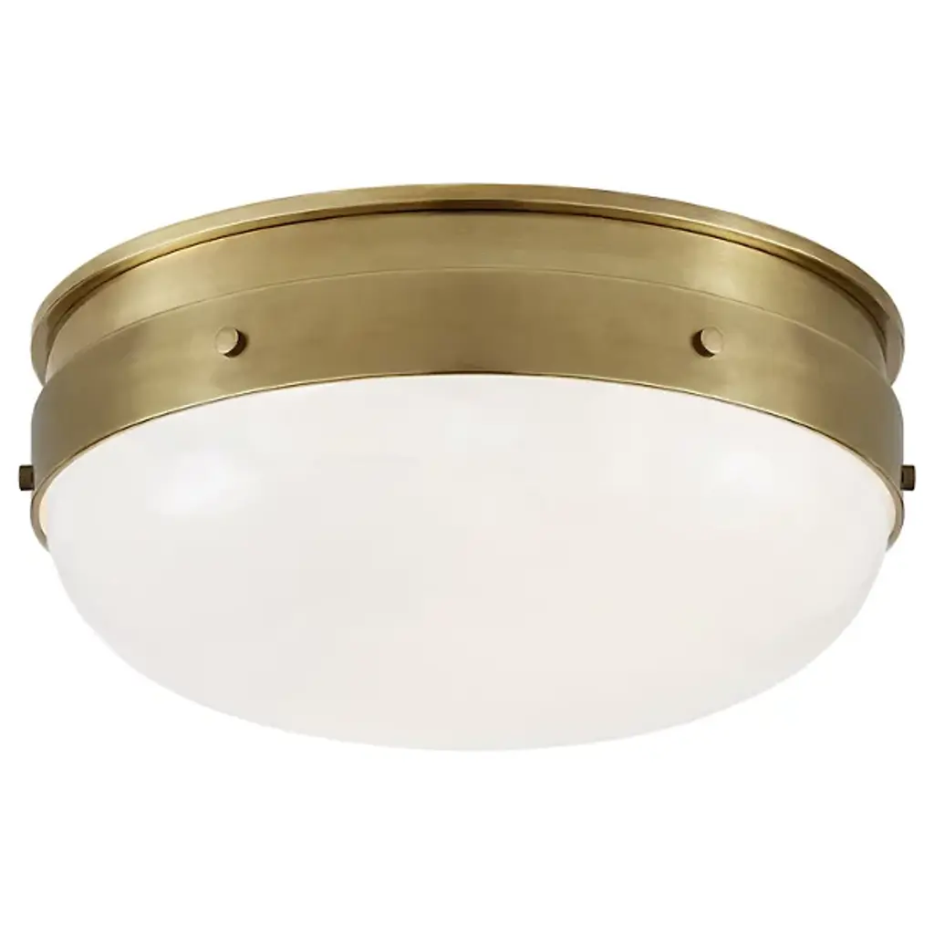 Bring a sleek design aesthetic to your home with the Launceton LED Solitaire Flushmount by Visual Comfort Signature, formerly known as Visual Comfort, A Fixture of brass secures to your ceiling. The fixture’s metalwork is formed into smooth loops, which give the light a trendy, layered look. A White Glass shade tempers the brilliant light that projects from an LED bulb. The shade’s proximity to the ceiling makes this decorative piece the perfect selection for illuminating your contemporary hallways.