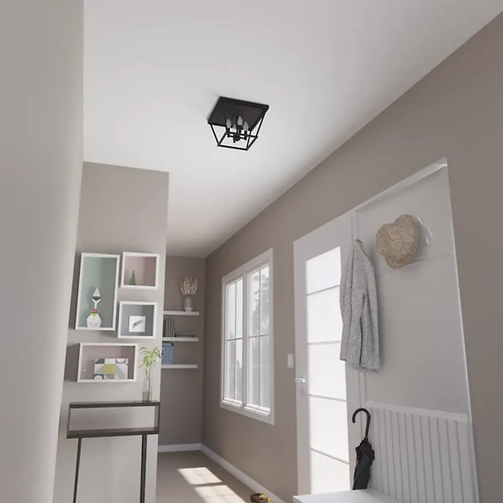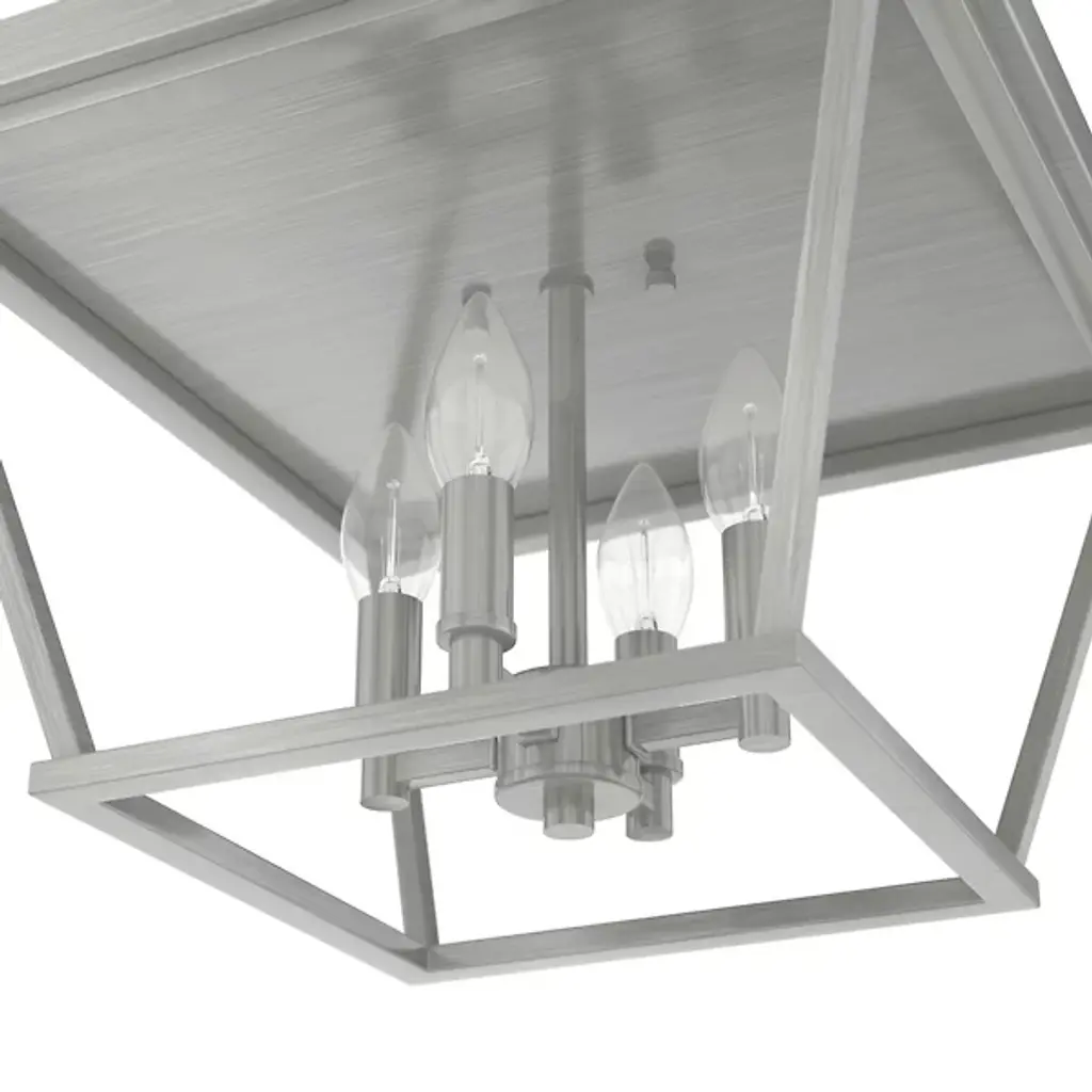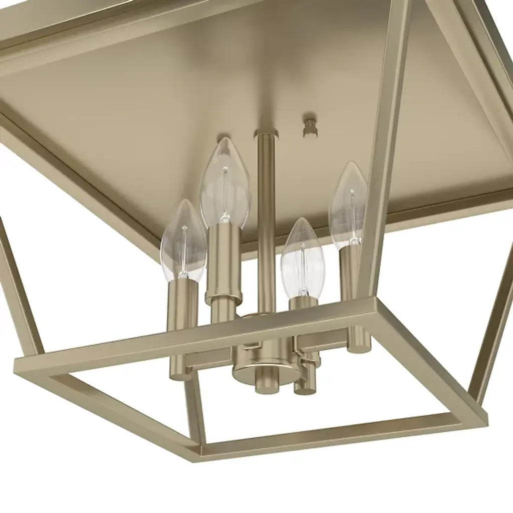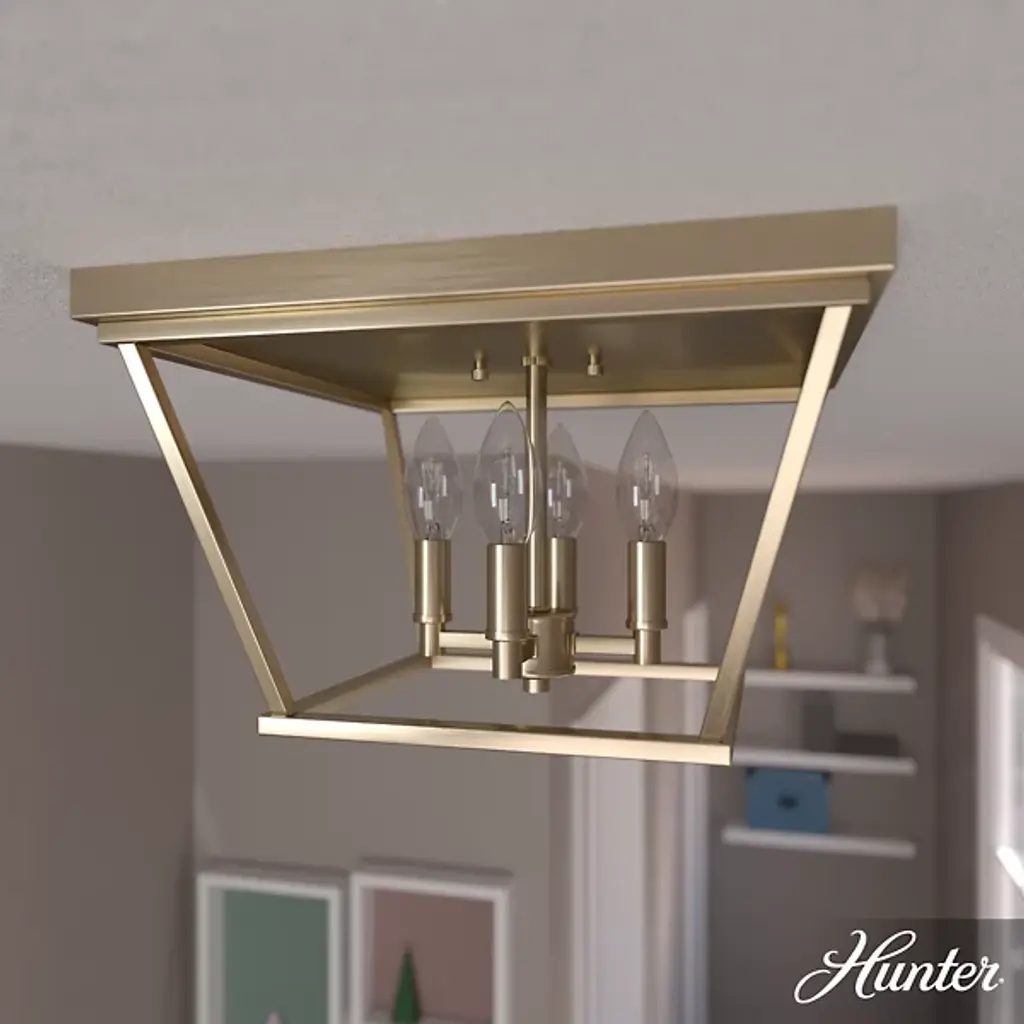 Introduce a sleek and appealing silhouette to the décor of your modern home with the Laurel Ridge Flushmount from Hunter Fans. Connecting directly with the ceiling, this piece is made of smooth metal throughout. A set of thin lines angle inward, forming an open, geometric shape that houses a set of candelabra-style bulbs. The light from the four crisp bulbs is bright and even, flowing into the room with ease.