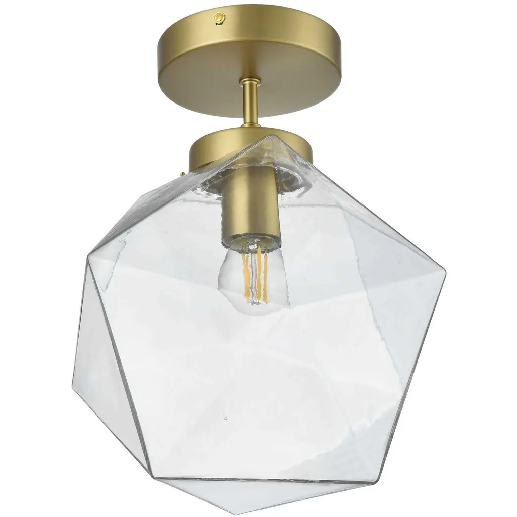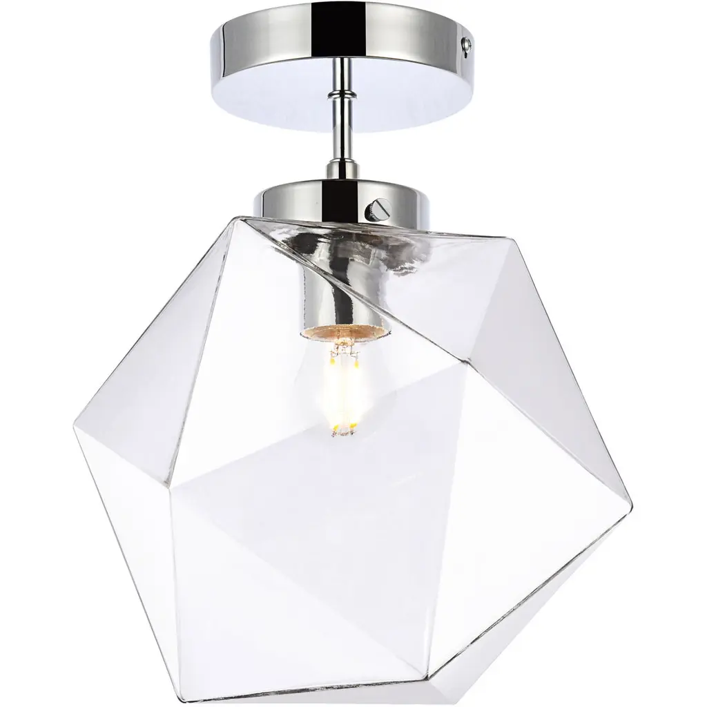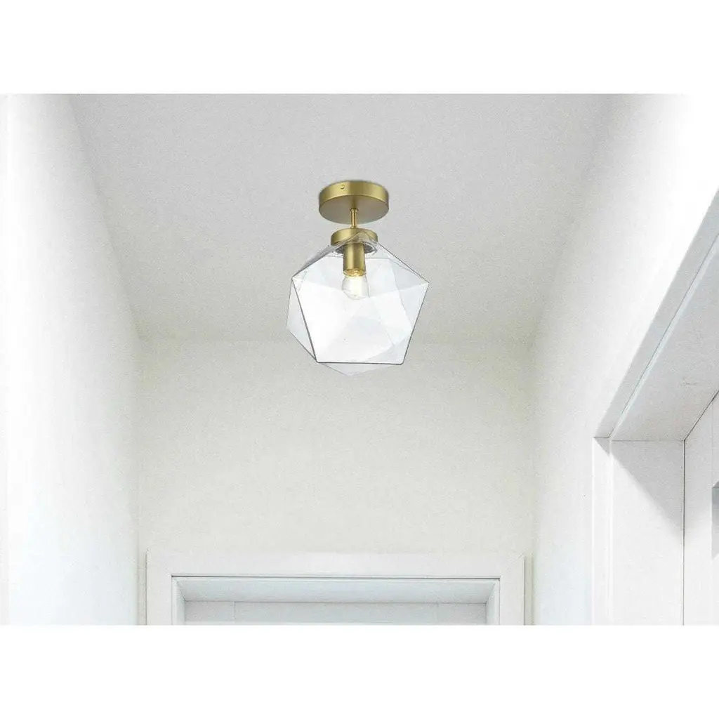 The Lawrence Collection flush mount is the perfect choice if you are looking to add visual interest with functional illumination into the room. The beauty lies in its unique shape and colors. It is available in satin gold, black, brass, or chrome finish with a clear glass shade. This product is dimmable and requires one E26 lamp. Light bulbs not included.