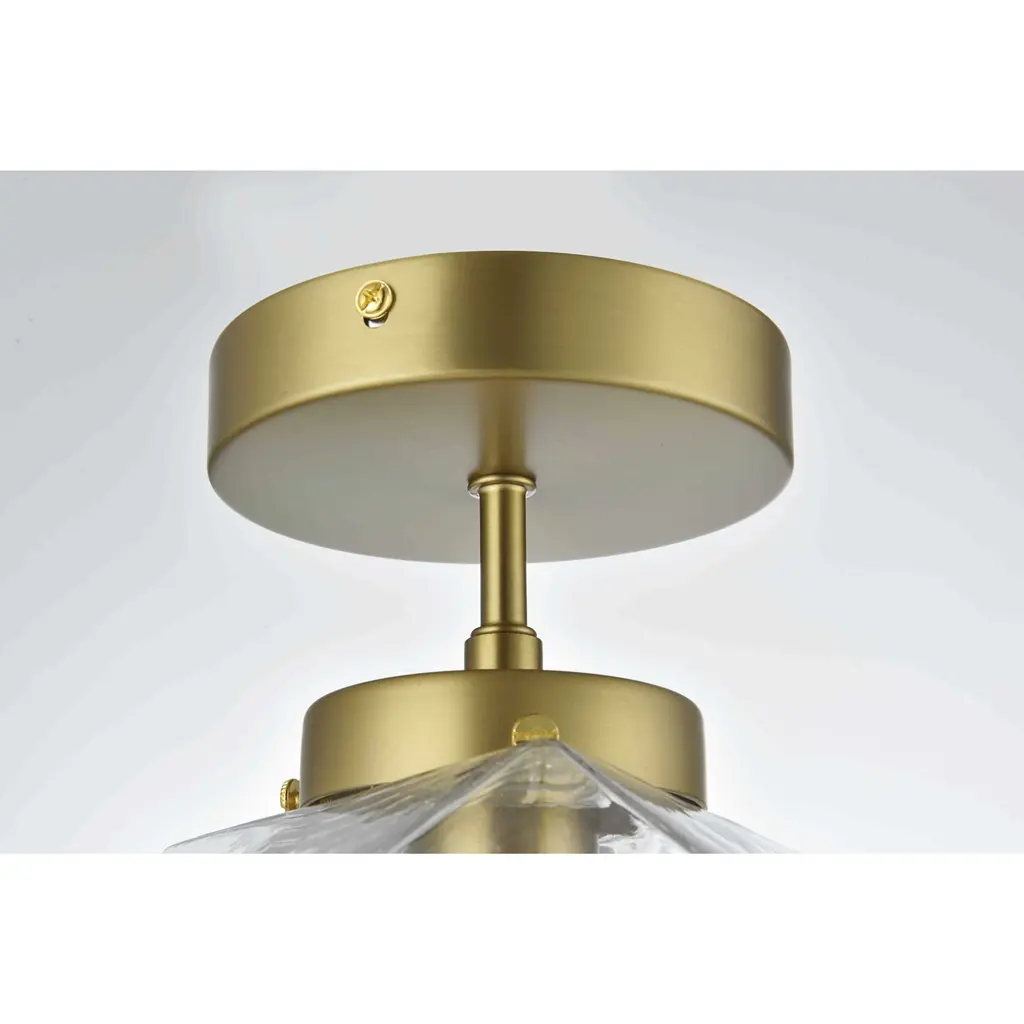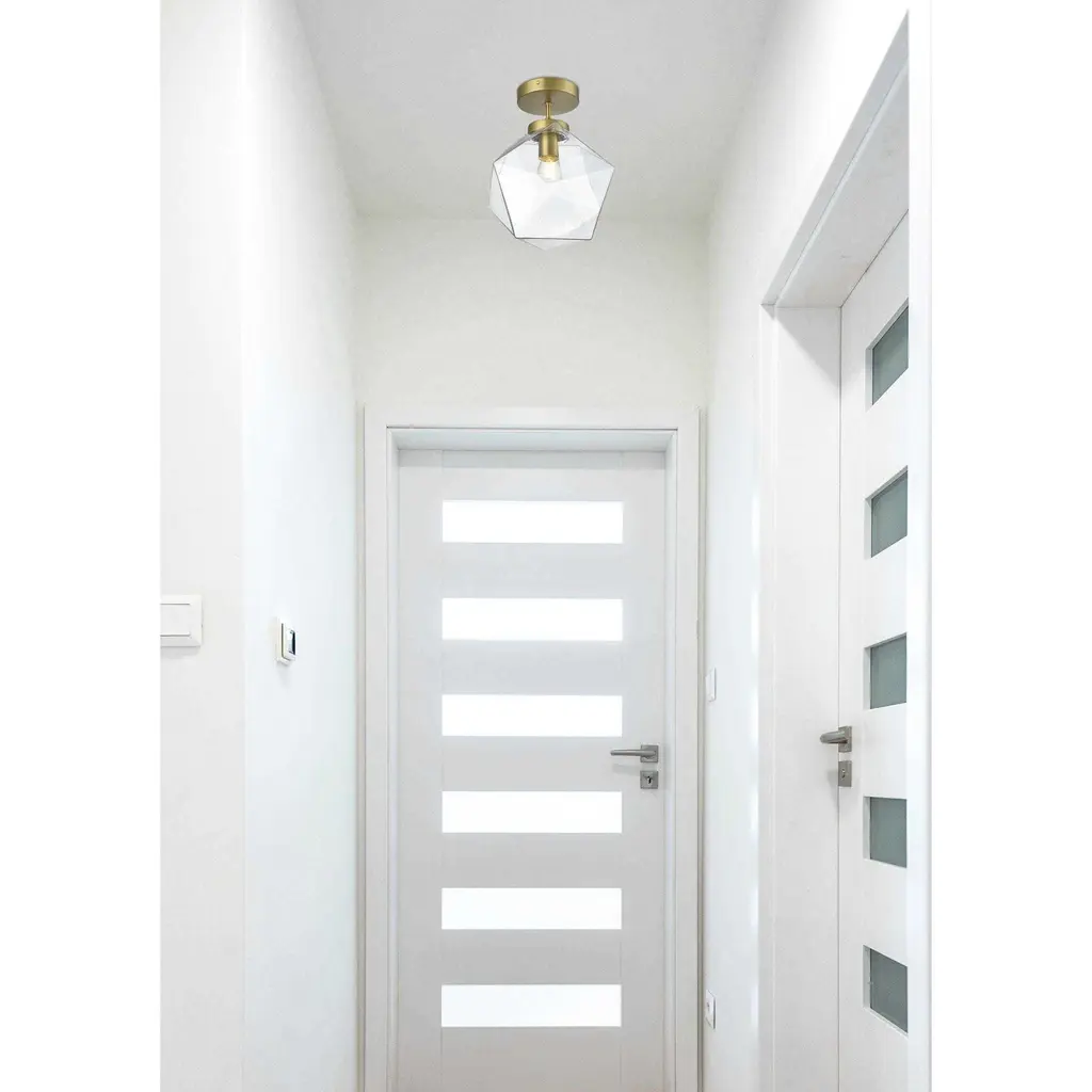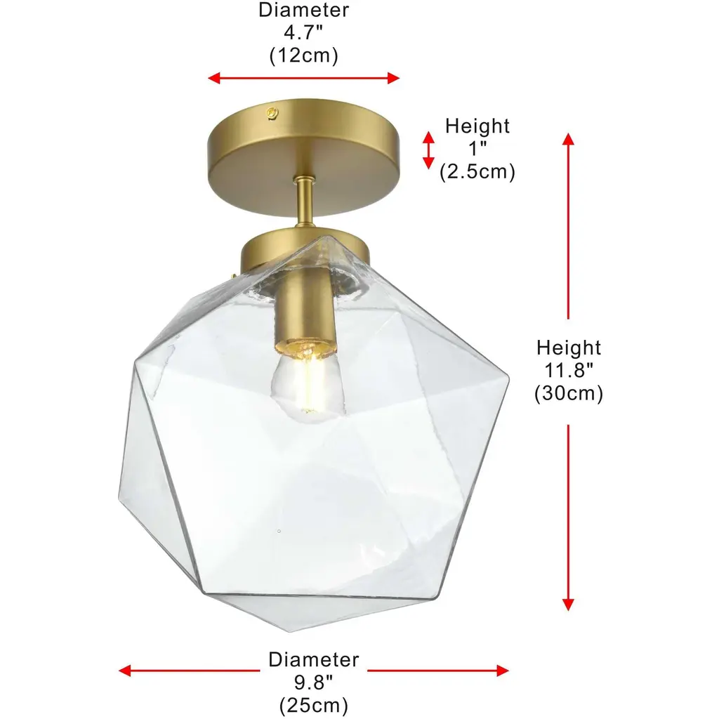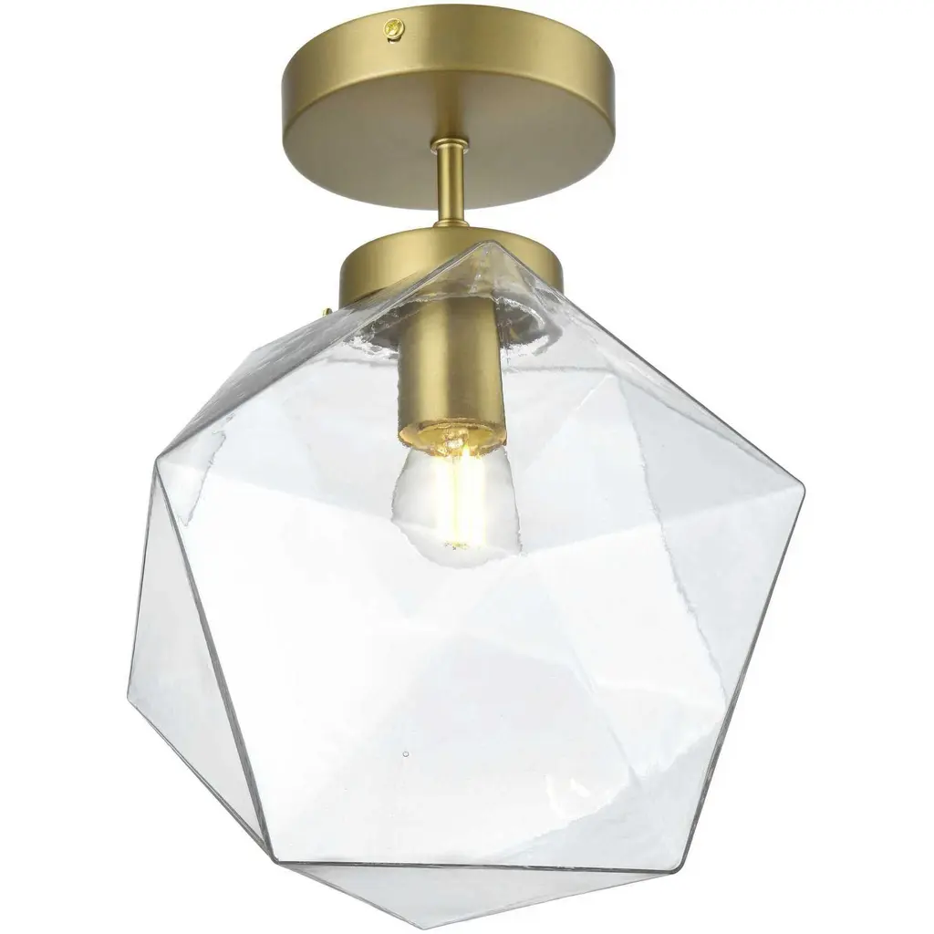 The Lawrence Collection flush mount is the perfect choice if you are looking to add visual interest with functional illumination into the room. The beauty lies in its unique shape and colors. It is available in satin gold, black, brass, or chrome finish with a clear glass shade. This product is dimmable and requires one E26 lamp. Light bulbs not included.