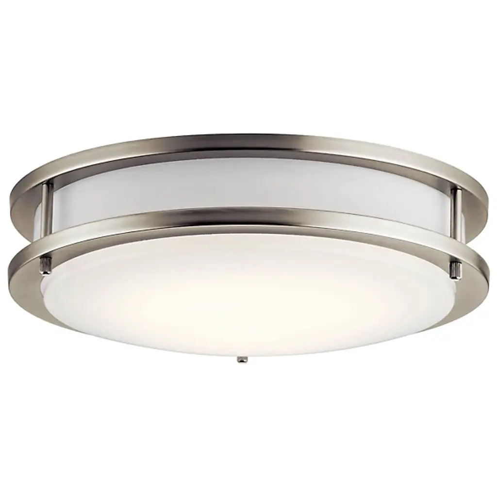 Simple lighting focused on efficient performance. Lend a decorative touch to interior spaces in homes, office spaces, and commercial settings using the LED 17.75" Flushmount by Kichler. The combination of white acrylic shade and LED technology results in a pleasant ambient illumination. An energy-efficient LED module fills the surrounding space with gentle light and delivers consistent performance over an extended period of time. Two contrasting rings placed around the bowl-like shade complement the fixture's straight-forward design for a customized look.
