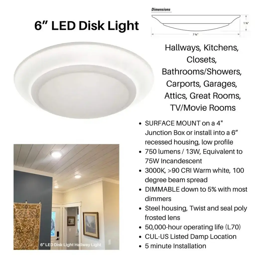 Surface mounted, flush mount, or junction mount lighting is a common choice for general illumination, providing a wide distribution of light across a space. These versatile fixtures are often ideal for rooms with standard 8-10’ ceiling heights, such as dining areas, hallways, laundry rooms, basements, garages, closets, and bathrooms, effectively brightening the entire room. They can be used in addition to decorative or accent lighting to create a well-lit and visually appealing environment, ensuring both functionality and ambiance.The Agilux LED Disk Light offers the performance and aesthetic of traditional downlighting, but without the need for a bulky recessed housing. This innovative ceiling disk light design provides significant energy savings of up to 83% compared to incandescent bulbs, translating into lower electricity bills, and boasts an impressively long operating life of 50,000 hours (L70), reducing the frequency and cost of bulb replacements. The Agilux ceiling disk light is available in a 3000K color temperature, providing a warm and inviting light that creates a comfortable atmosphere. Its low-profile, driverless design allows for remarkably easy surface mounting to standard 4” ceiling junction boxes, simplifying installation. For added versatility, it can also be installed into existing 6” incandescent housings using a separately available adapter kit, offering a seamless upgrade path.While professional installation is always an option, these lights are designed for straightforward DIY installation, empowering homeowners to enhance their lighting with ease. With the appropriate socket adaptors and springs, they can even be mounted directly into existing recessed light fixtures, providing a quick and clean conversion to modern LED technology. This surface mount light is suitable for a wide range of residential, multifamily, and commercial applications, making it a truly adaptable lighting solution. The 13W LED output provides ample illumination, equivalent to a 75W BR incandescent bulb, delivering bright and efficient light. Furthermore, the fixture is dimmable with most standard LED dimmers, allowing for customizable light levels from bright task lighting to a subtle glow, perfectly suiting any mood or activity.- SURFACE MOUNT or install into a 4” junction box for flexible installation options - 750 lumens / 13W, Equivalent to a 75W Incandescent bulb, offering powerful illumination with less energy consumption - 3000K, >90 CRI Warm white, 100 beam spread, ensuring a rich, accurate color rendition and broad light distribution from this led flush mount. - DIMMABLE down to 5% with most dimmers, providing complete control over your lighting ambiance. - Steel housing, Twist and seal poly frosted lens, for durability and a smooth, even light output. - 50,000-hour operating life (L70), guaranteeing years of reliable performance from this led light. - CUL-US Listed Damp Location, making it suitable for bathrooms and other moisture-prone areas. - Energy Star Listed, reliable, confirming its energy efficiency and quality. - AC LED Driverless operation, simplifying installation and enhancing reliability.