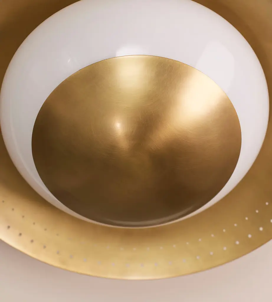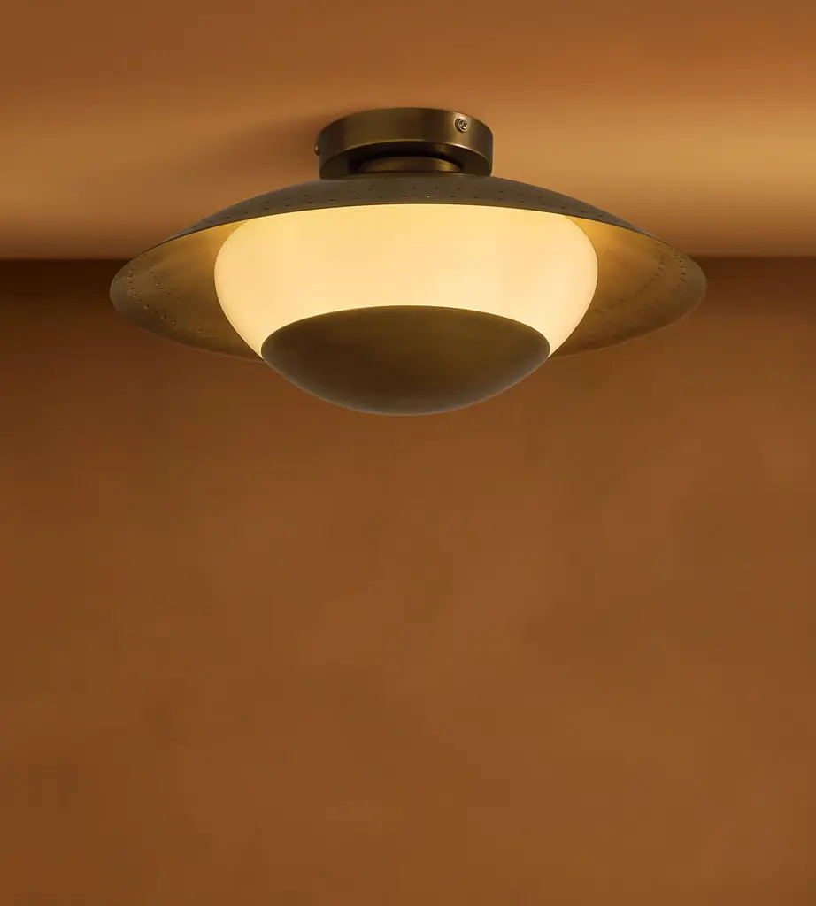 Adding a vintage-inspired feel to your lighting scheme, our Leon flush light sits close to the ceiling in a disc-shaped design. An opal globe light rests between a spun solid brass shade with perforated detail and a brass cap. This allows for a soft and flattering ring of light, ideal in the bathroom, to recreate the lighting of White City House.