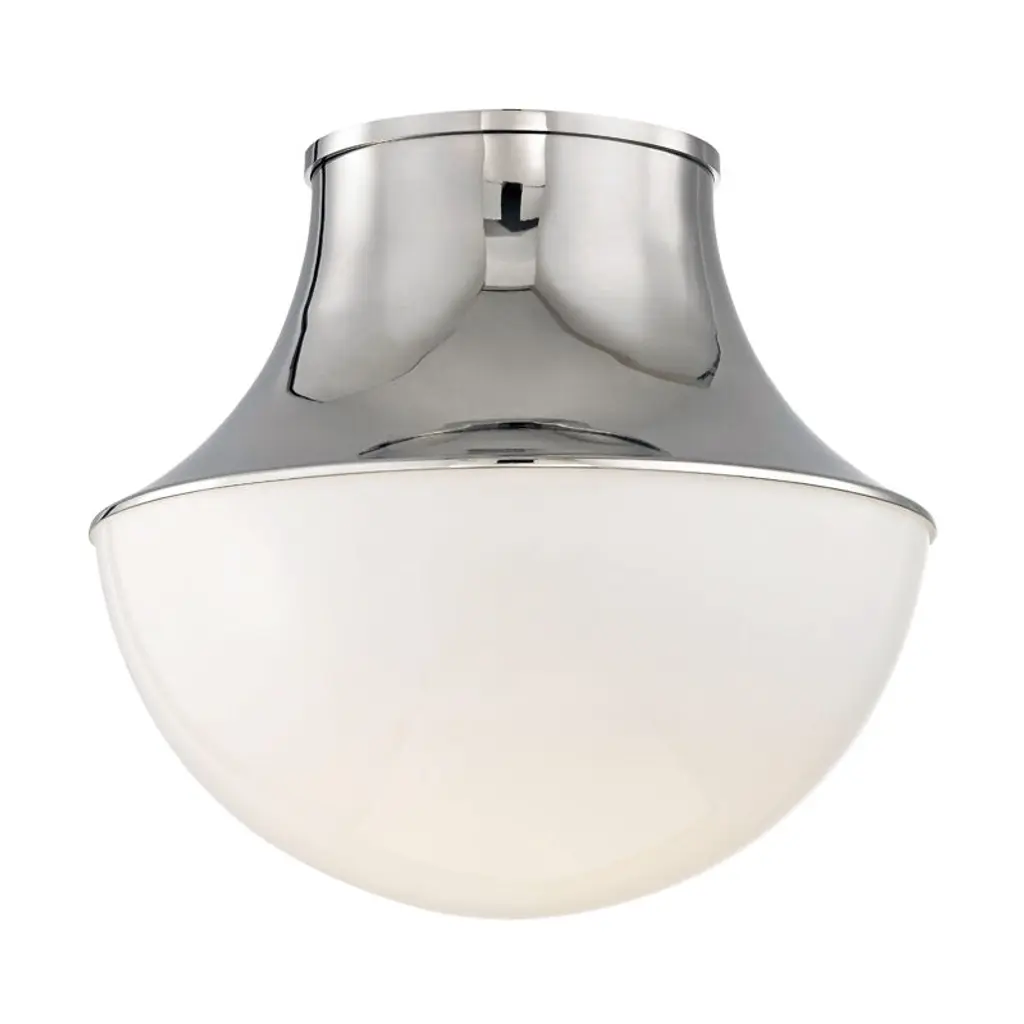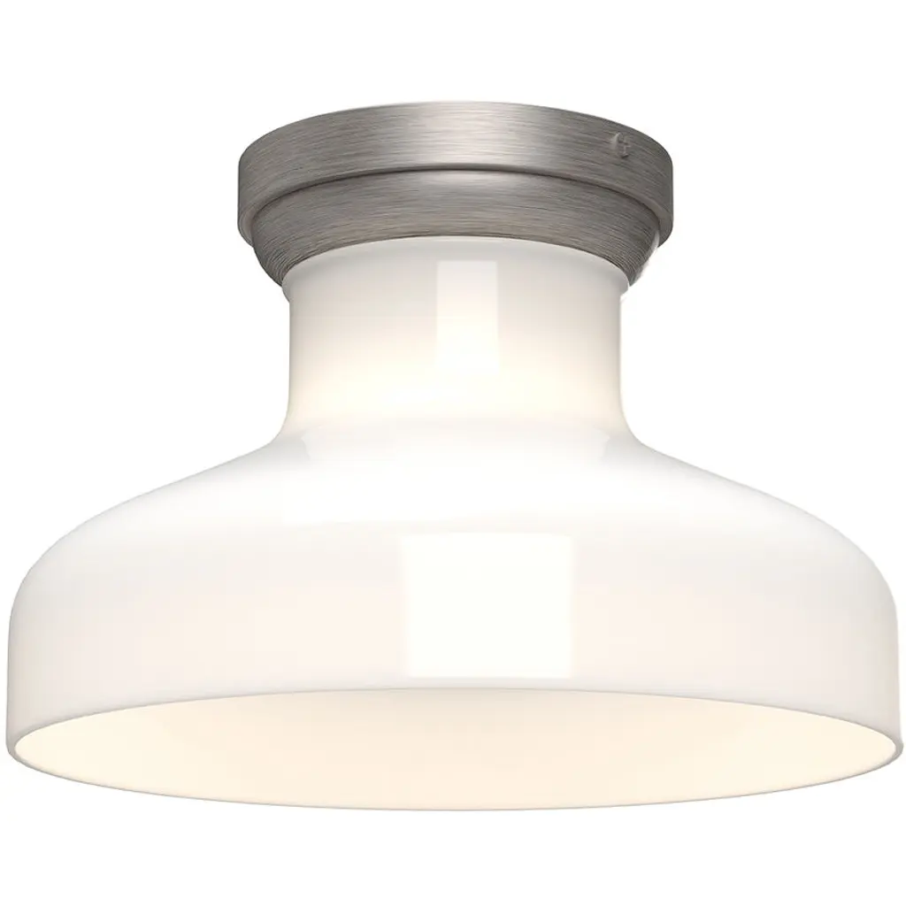 A demi-globe glass diffuser, clear on the inside, creates a stunning glow over any space. Spun metal swerves out in a funnel shape to meet the shade, making for an attractive silhouette.