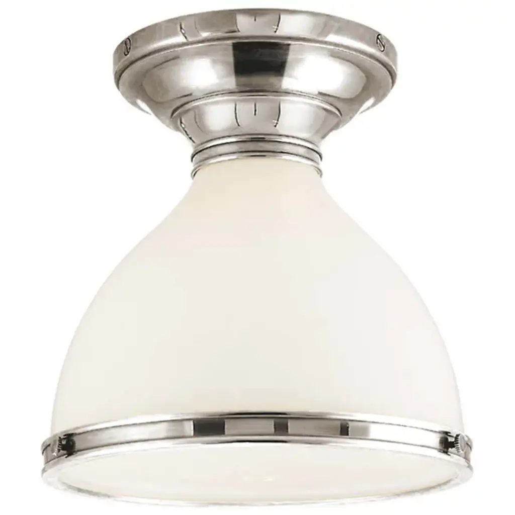 A demi-globe glass diffuser, clear on the inside, creates a stunning glow over any space. Spun metal swerves out in a funnel shape to meet the shade, making for an attractive silhouette.