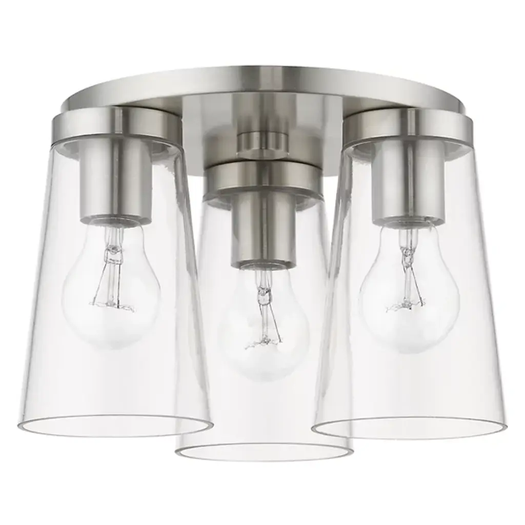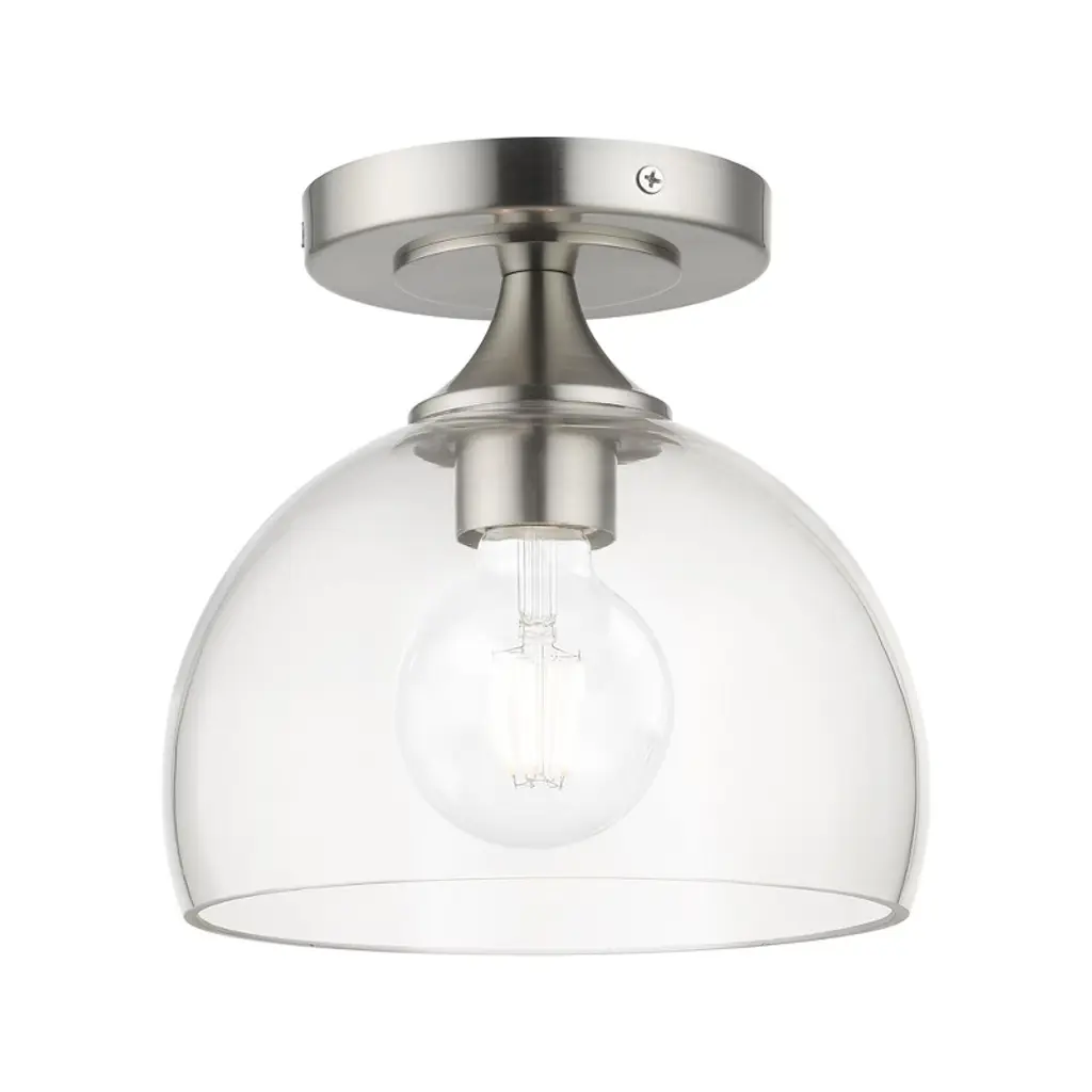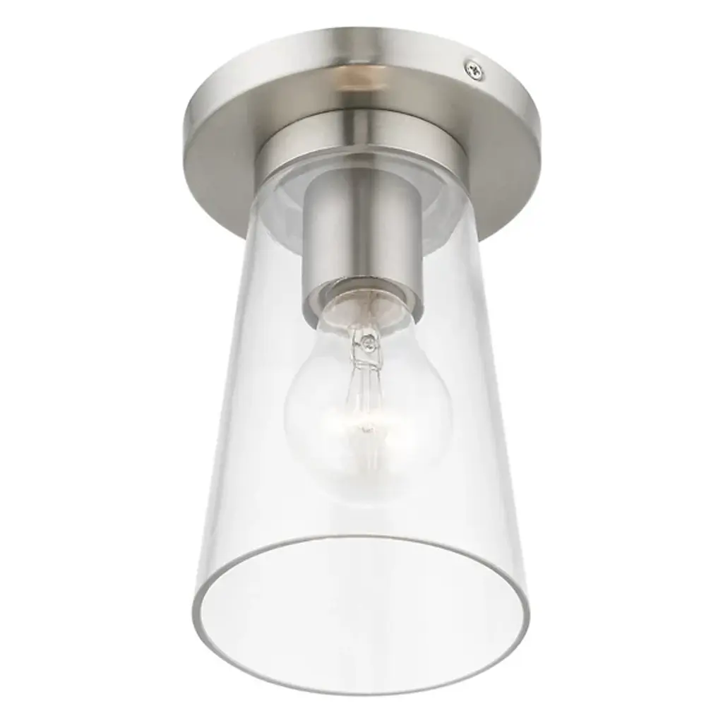 The Lily Flushmount from Alder & Ore presents a tasteful addition suited to open environments or low inside ceilings. A stepped circular canopy retains the fixture, sending down a single candelabra lamp inside a flared, clear glass shade. This arrangement artfully obscures glare to the sides, expressing a generous glare around a bright pool of downlight below.