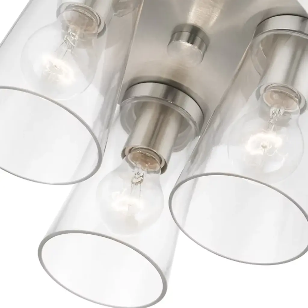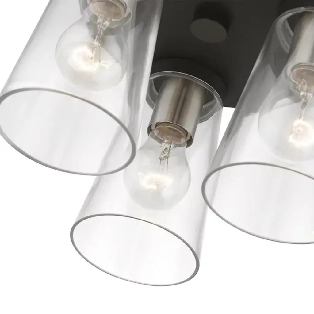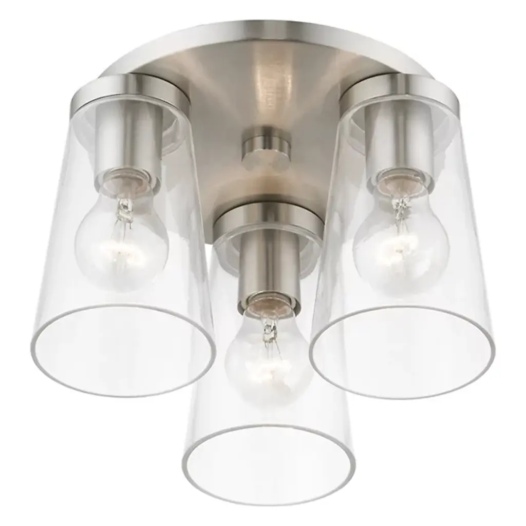 The Lily Flushmount from Alder & Ore presents a tasteful addition suited to open environments or low inside ceilings. A stepped circular canopy retains the fixture, sending down a single candelabra lamp inside a flared, clear glass shade. This arrangement artfully obscures glare to the sides, expressing a generous glare around a bright pool of downlight below.