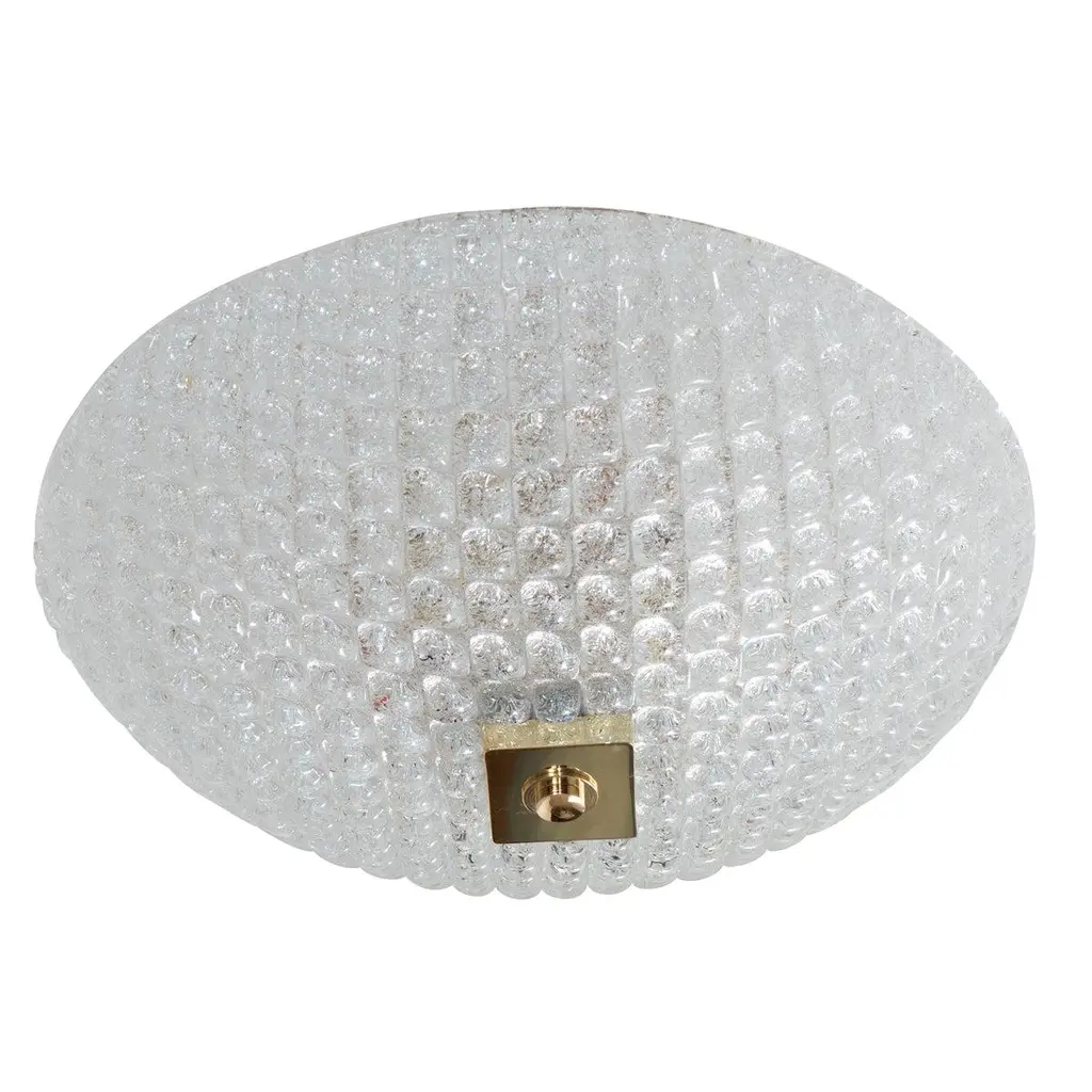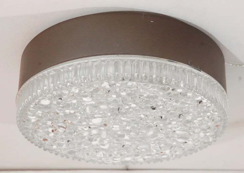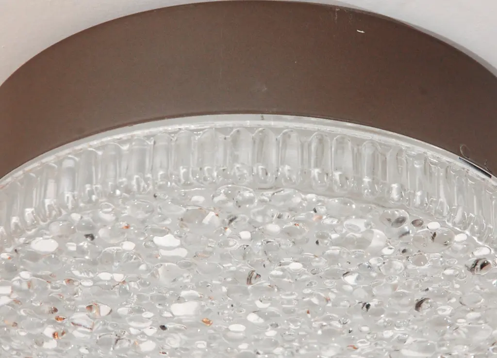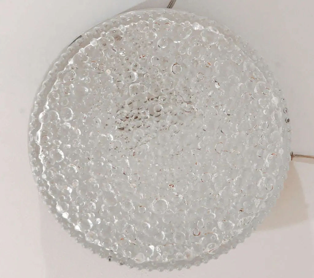 Beautiful thick detailed bubble glass flush mount with ribbed edges on deep black fixture. Professionally re-wired. 6 available and sold individually.