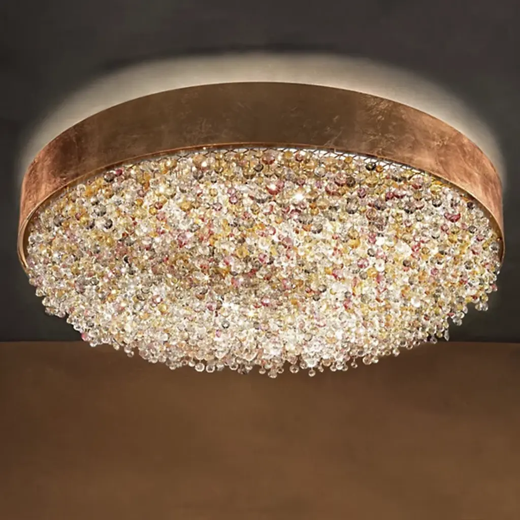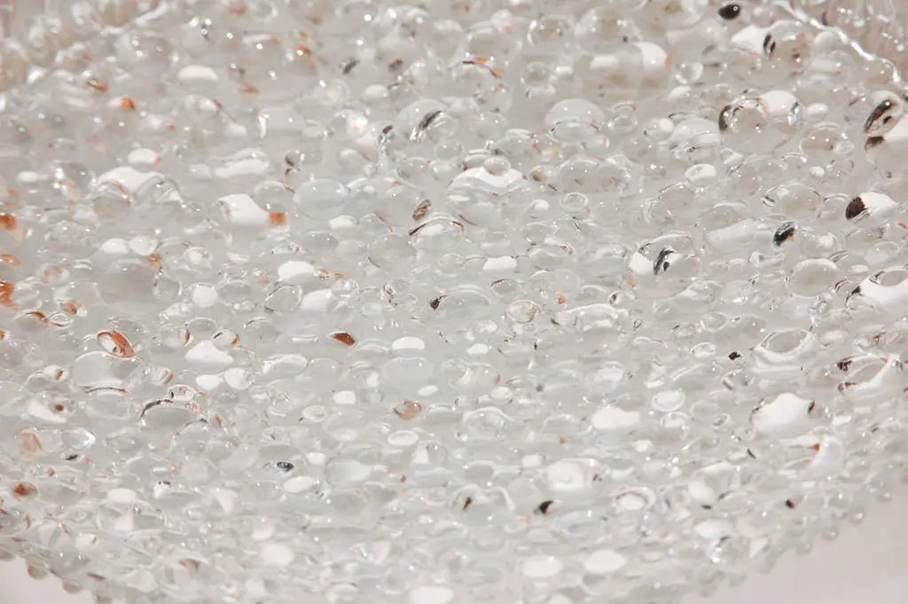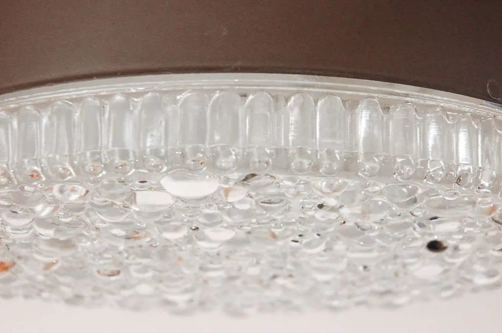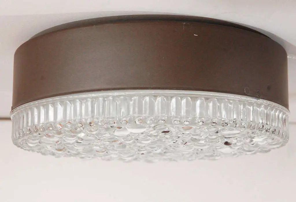 Beautiful thick detailed bubble glass flush mount with ribbed edges on deep black fixture. Professionally re-wired. 6 available and sold individually.
