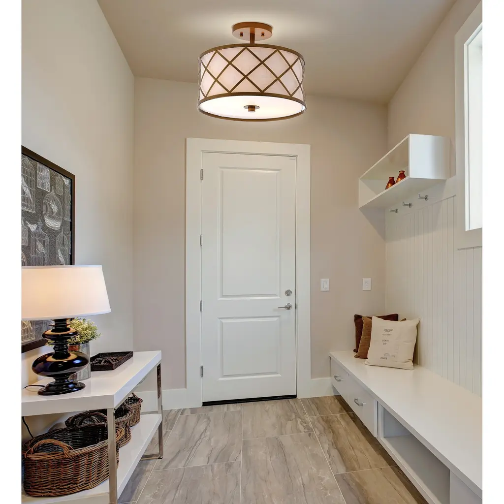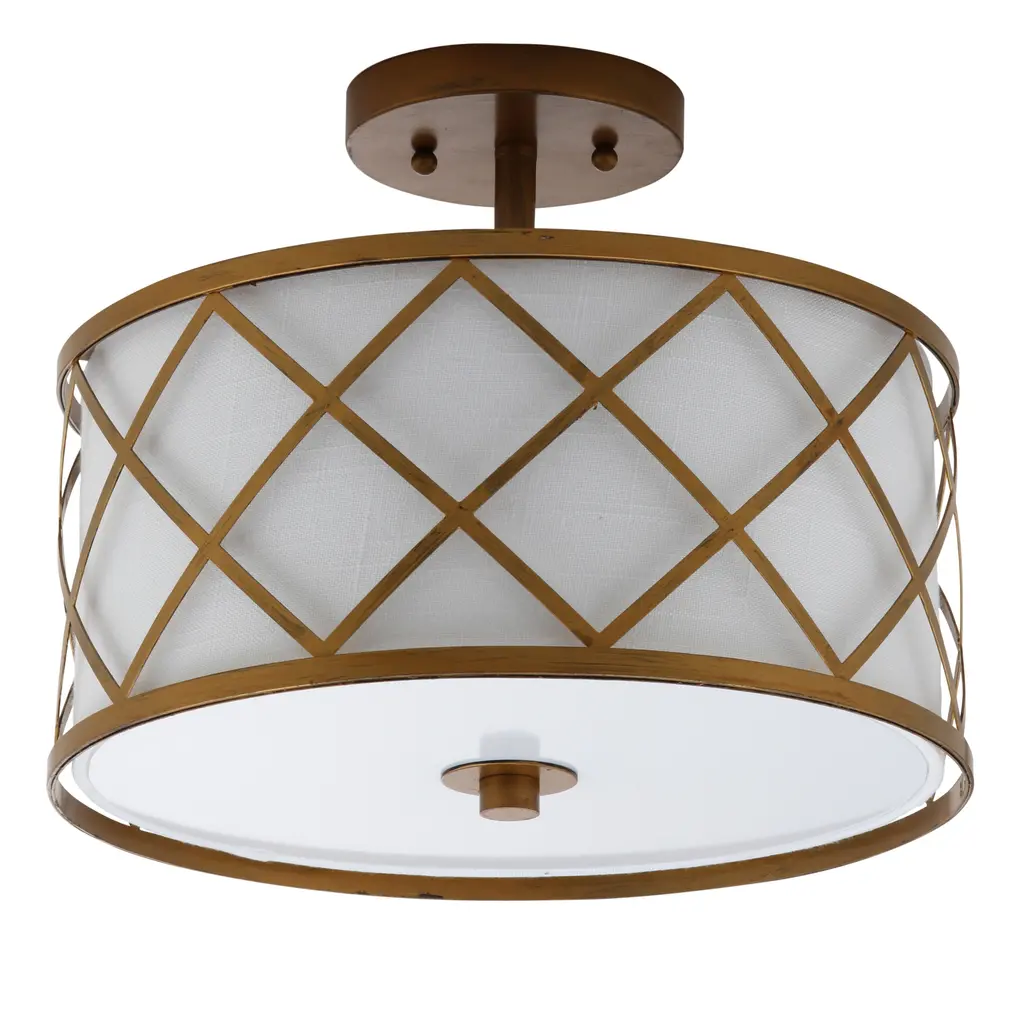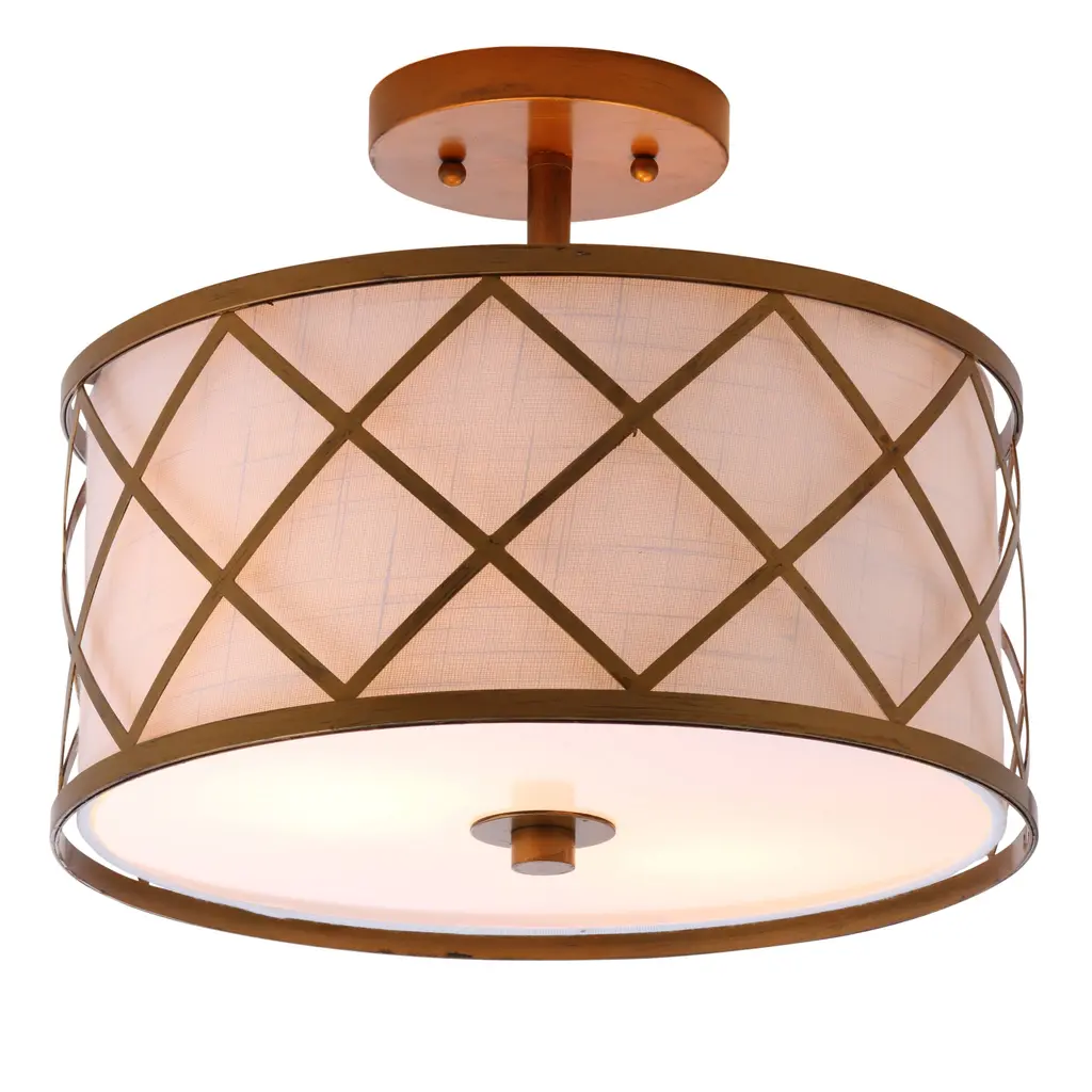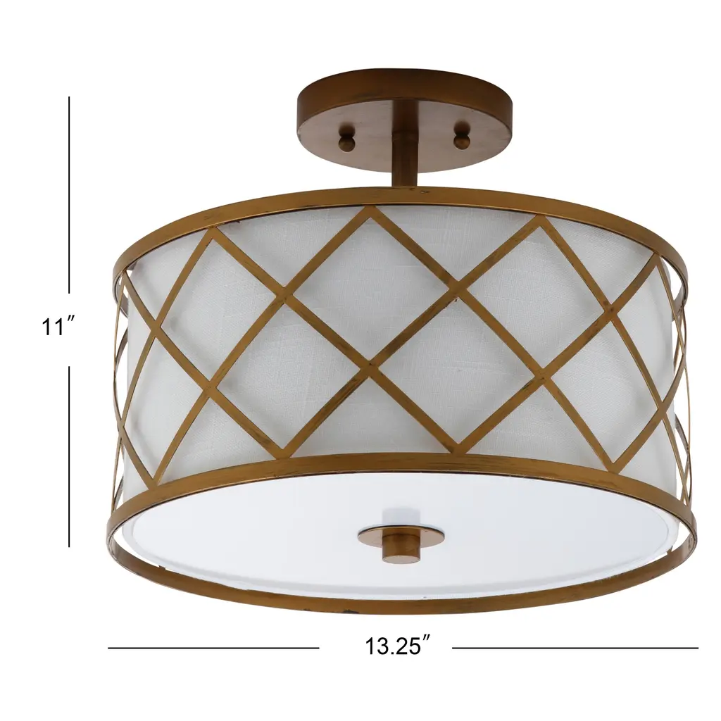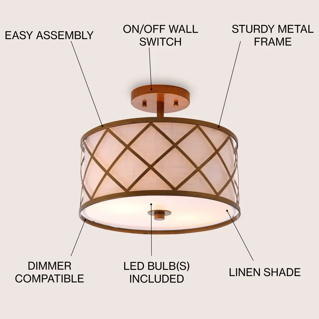 Surrounded by crisscrossed metal lattice, this flush mount adds transitional elegance to any room. With a hanging drop, it will work with any height ceiling and in a neutral tone linen shade, with any color scheme. Though easily installed, we recommend using a professional electrician to hard wire it on the ceiling. Features: About us:You see a lamp.We see a decorative work of art.A perfectly curved shade casts a dramatic shadow on a floor. A silk cord you never want to hide. LED lightbulbs: as easy on the environment as they are on the eyes. The JONATHAN Y Lighting collection considers every detail from impeccably sourced materials to designer styling. And our prices are so attractive, we've transformed a functional necessity into a fashion accessory.JONATHAN Y Lighting - a fashion revolution in home decor.