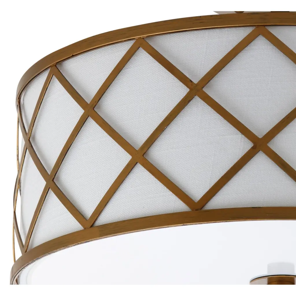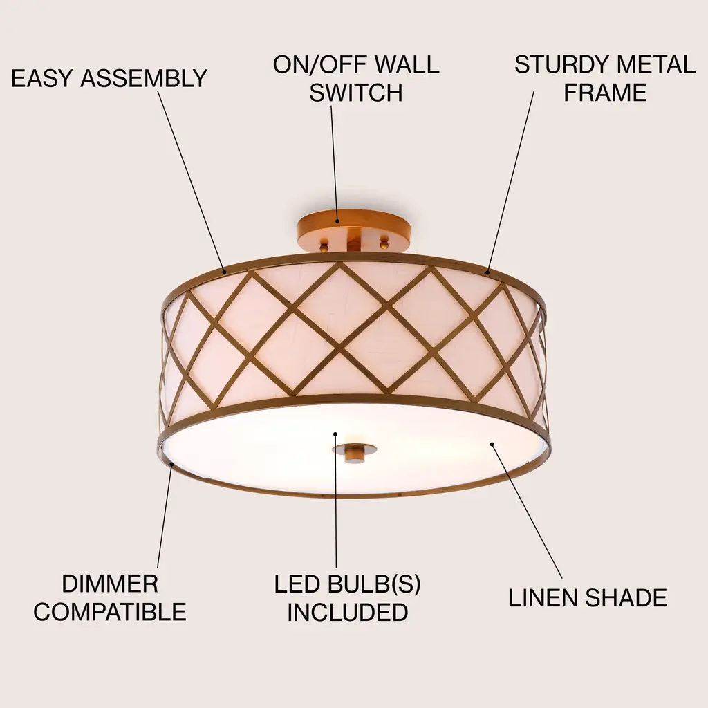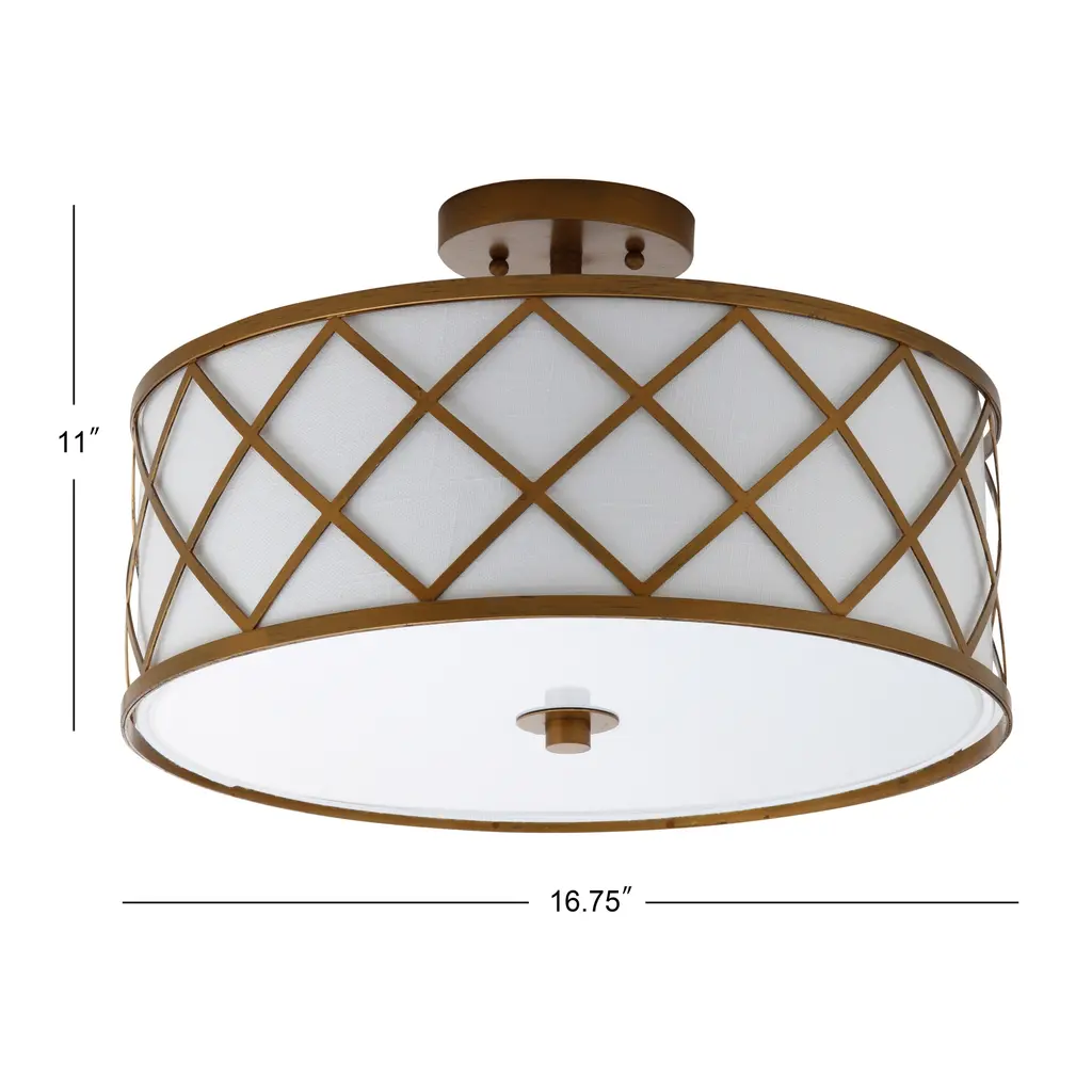 Surrounded by crisscrossed metal lattice, this flush mount adds transitional elegance to any room. With a hanging drop, it will work with any height ceiling and in a neutral tone linen shade, with any color scheme. Though easily installed, we recommend using a professional electrician to hard wire it on the ceiling. Features: About us:You see a lamp.We see a decorative work of art.A perfectly curved shade casts a dramatic shadow on a floor. A silk cord you never want to hide. LED lightbulbs: as easy on the environment as they are on the eyes. The JONATHAN Y Lighting collection considers every detail from impeccably sourced materials to designer styling. And our prices are so attractive, we've transformed a functional necessity into a fashion accessory.JONATHAN Y Lighting - a fashion revolution in home decor.