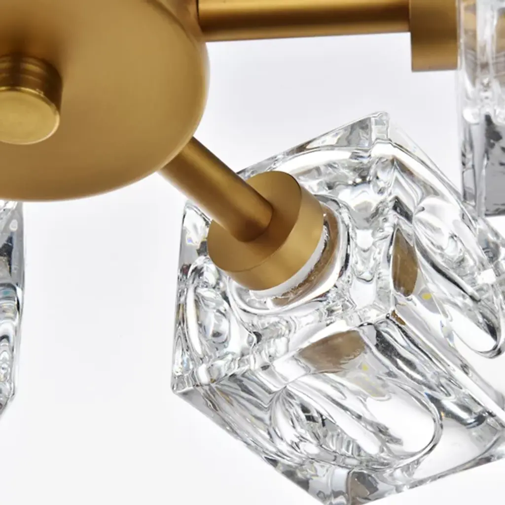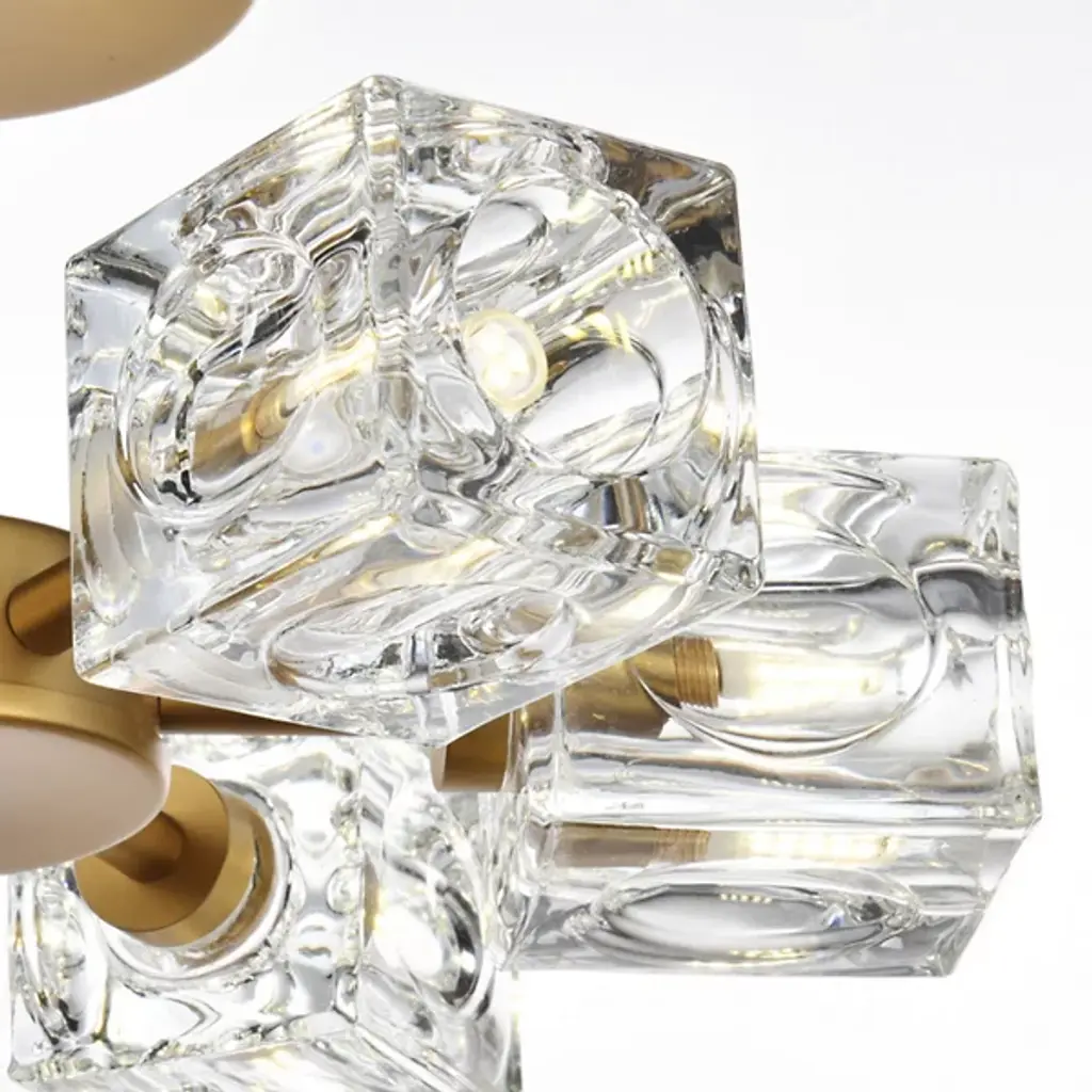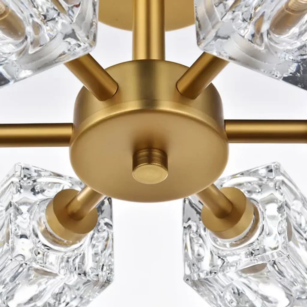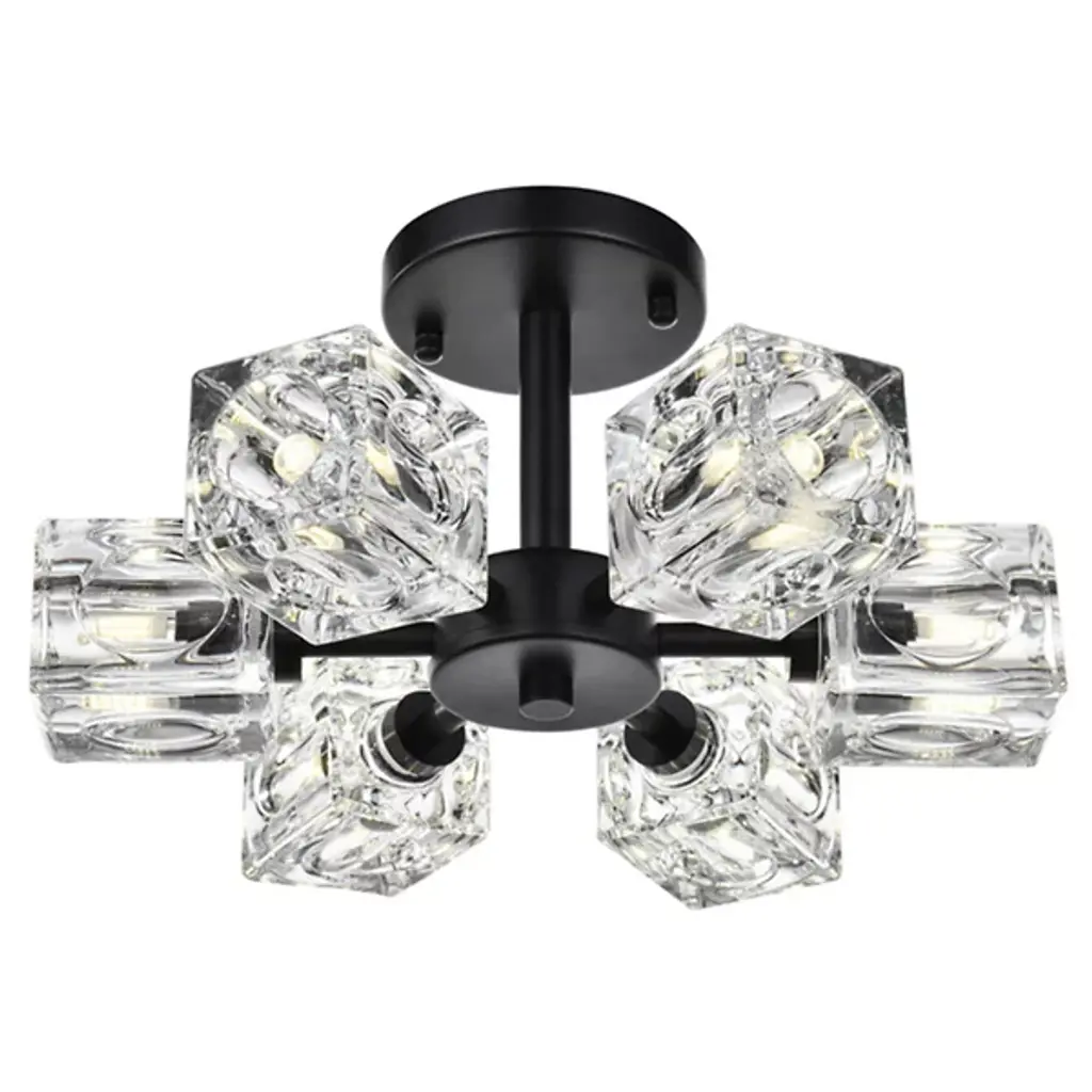 The Lira Flushmount from Huxe combines simplicity and sculptural elegance. It features six lights with distinctive dimpled square glass shades for a uniquely textured look. Its strong iron support structure melds contemporary design with industrial sophistication. Descending from a circular canopy, it extends a slim rod to a round hub for a modern structure. This fixture is a versatile and refined addition, showcasing elements of Mid-Century Modern and Transitional styles, distributing a mellow ambiance throughout any interior space.
