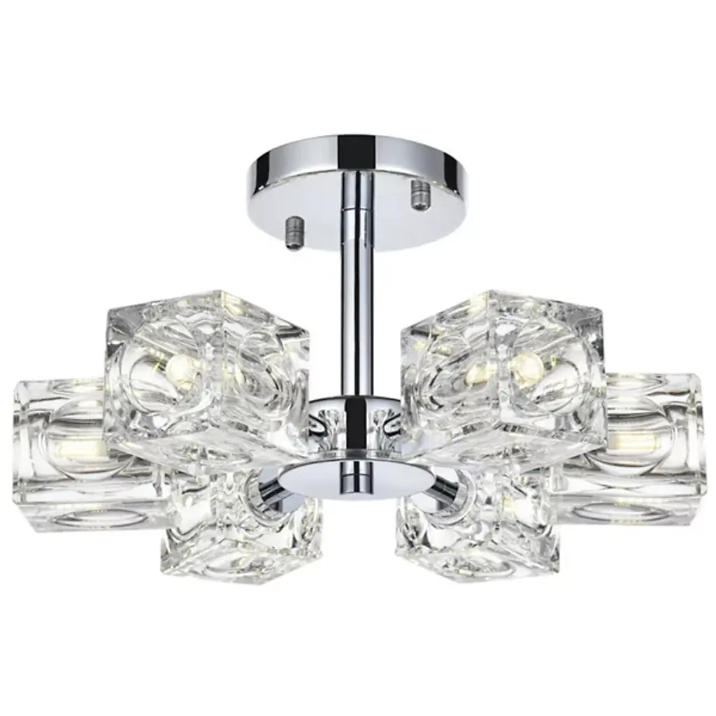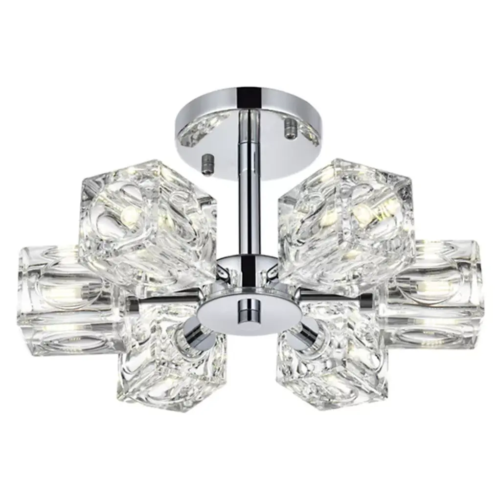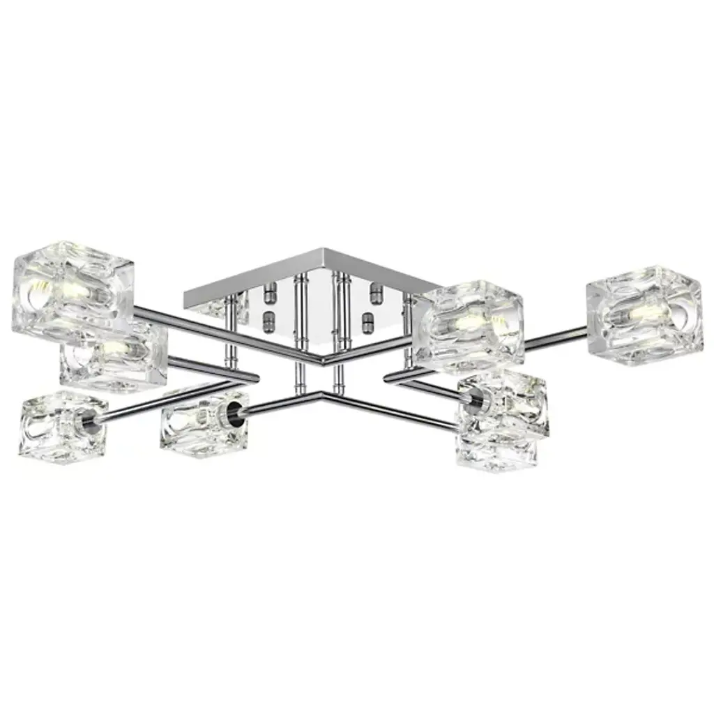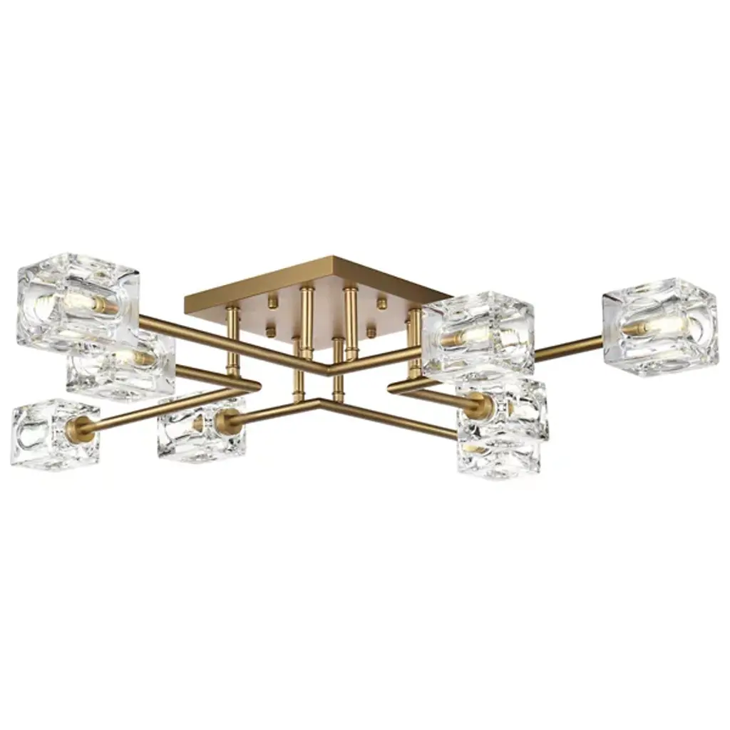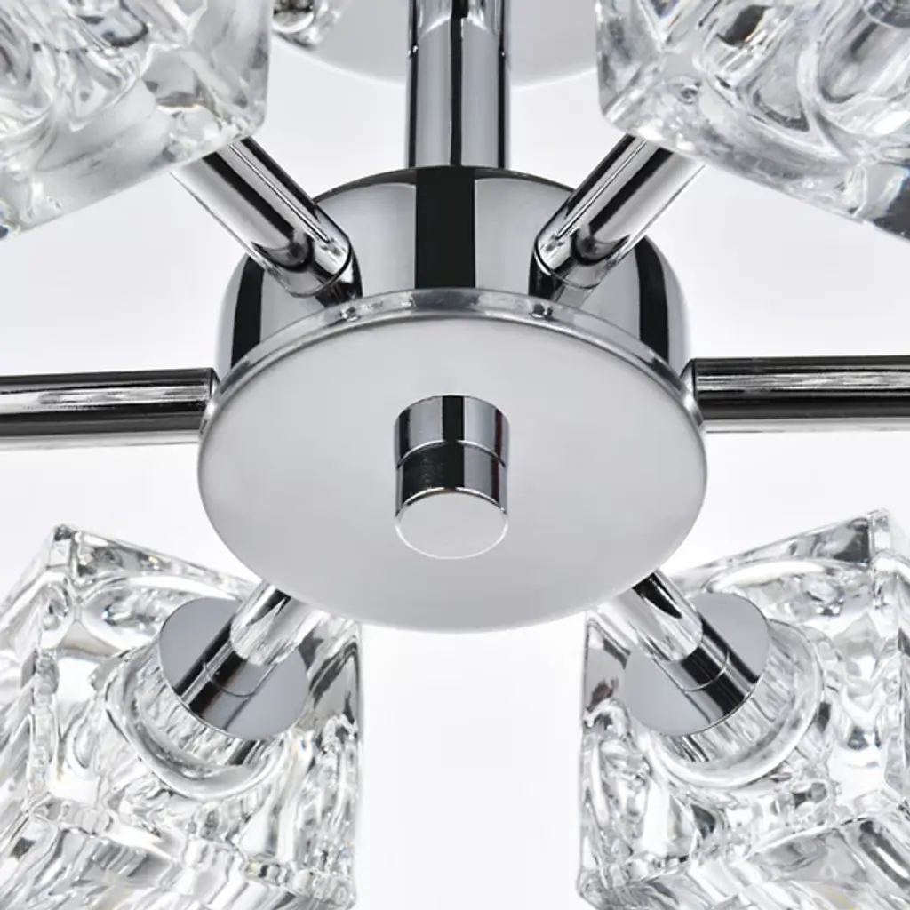 The Lira Flushmount from Huxe combines simplicity and sculptural elegance. It features six lights with distinctive dimpled square glass shades for a uniquely textured look. Its strong iron support structure melds contemporary design with industrial sophistication. Descending from a circular canopy, it extends a slim rod to a round hub for a modern structure. This fixture is a versatile and refined addition, showcasing elements of Mid-Century Modern and Transitional styles, distributing a mellow ambiance throughout any interior space.