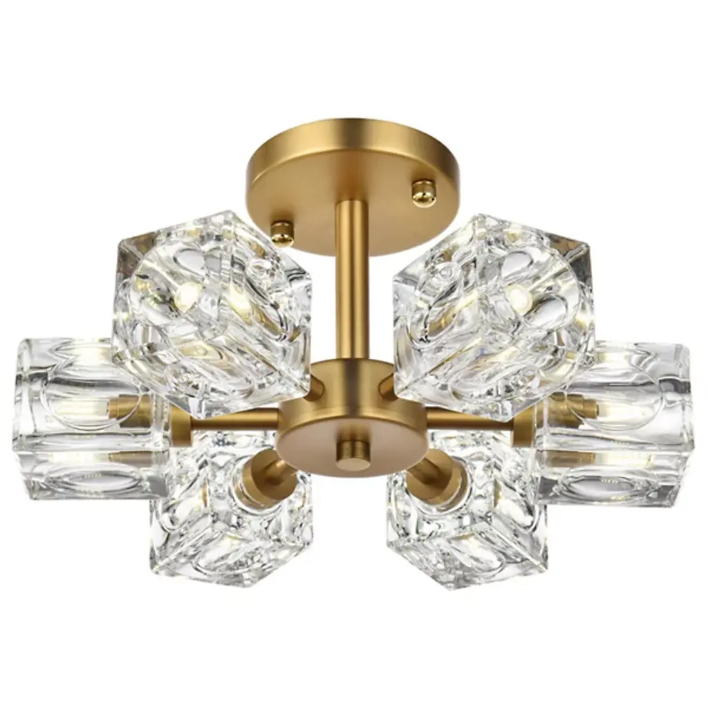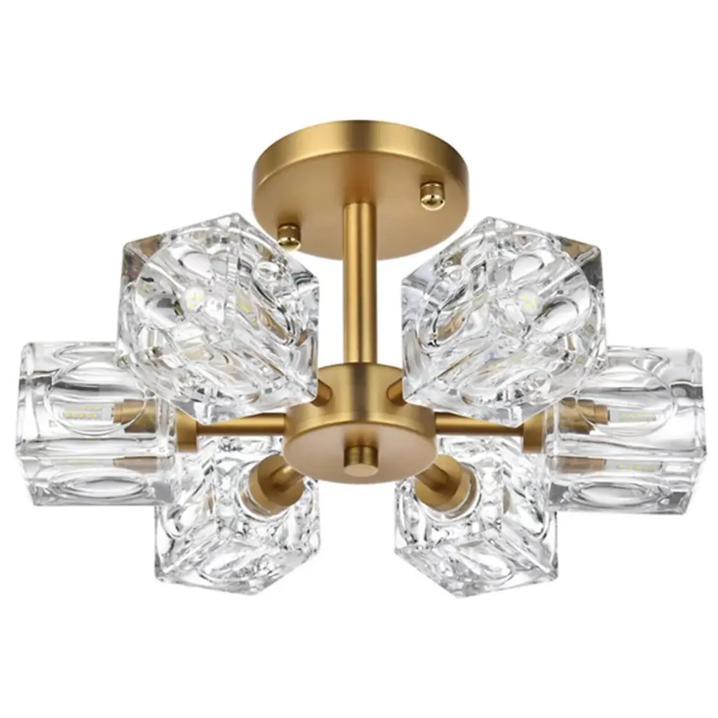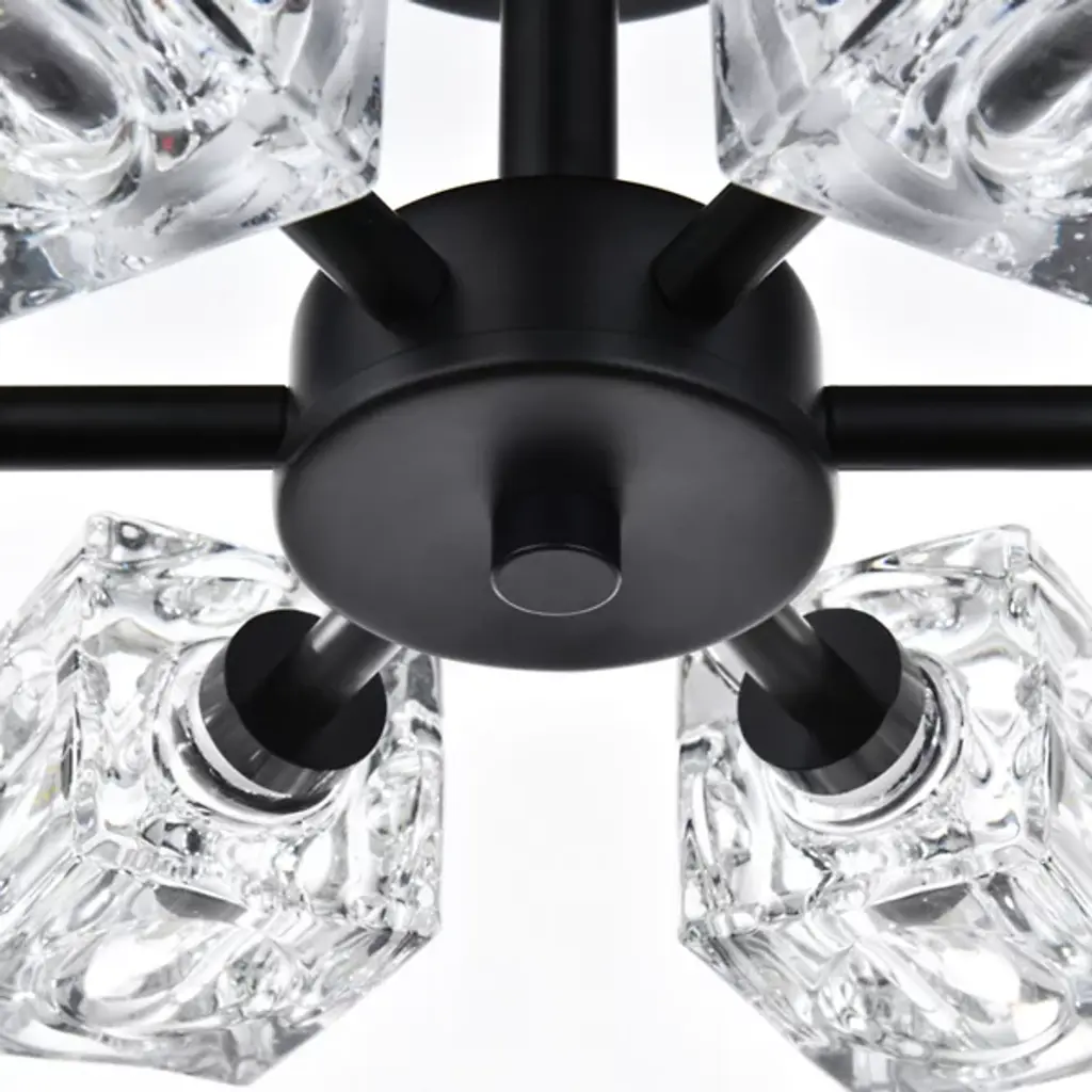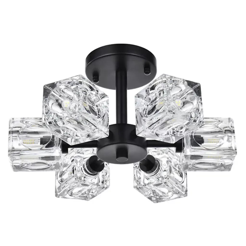 The Lira Flushmount from Huxe combines simplicity and sculptural elegance. It features six lights with distinctive dimpled square glass shades for a uniquely textured look. Its strong iron support structure melds contemporary design with industrial sophistication. Descending from a circular canopy, it extends a slim rod to a round hub for a modern structure. This fixture is a versatile and refined addition, showcasing elements of Mid-Century Modern and Transitional styles, distributing a mellow ambiance throughout any interior space.