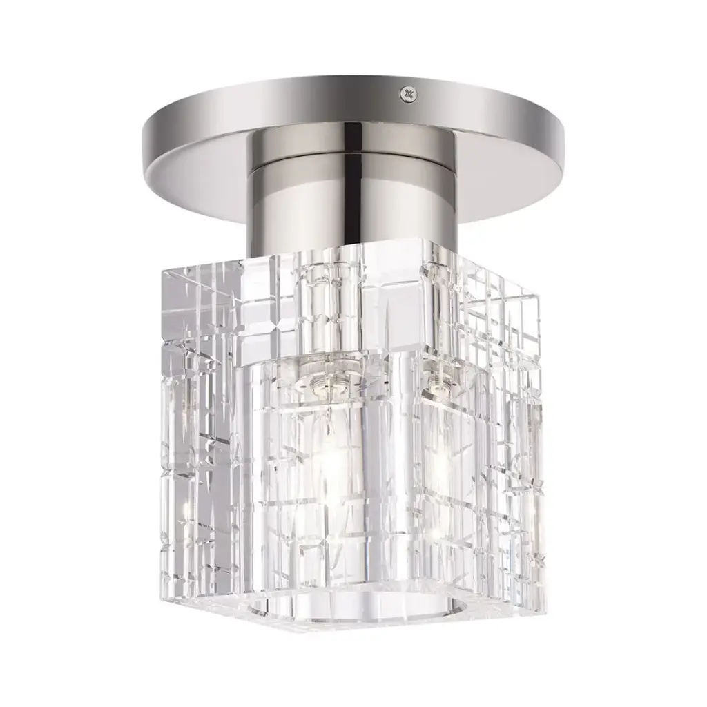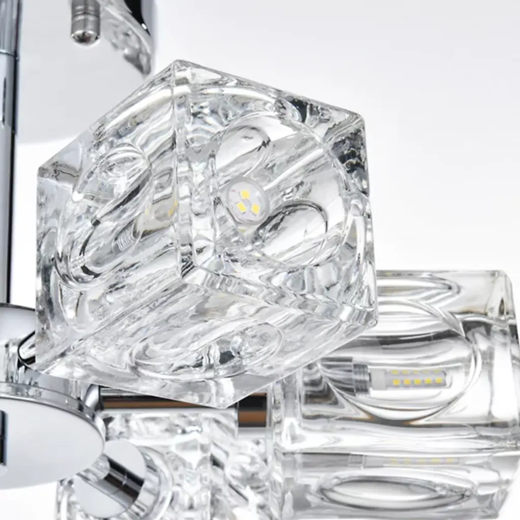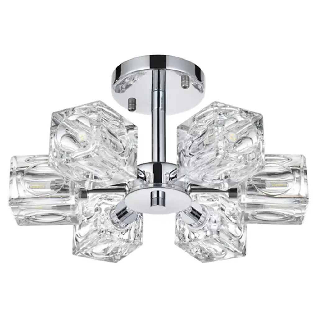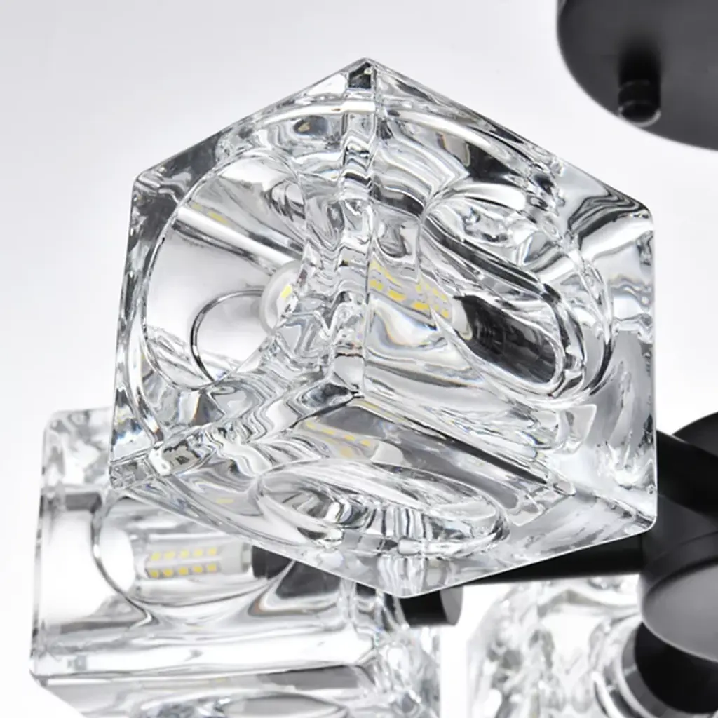 The Lira Flushmount from Huxe combines simplicity and sculptural elegance. It features six lights with distinctive dimpled square glass shades for a uniquely textured look. Its strong iron support structure melds contemporary design with industrial sophistication. Descending from a circular canopy, it extends a slim rod to a round hub for a modern structure. This fixture is a versatile and refined addition, showcasing elements of Mid-Century Modern and Transitional styles, distributing a mellow ambiance throughout any interior space.