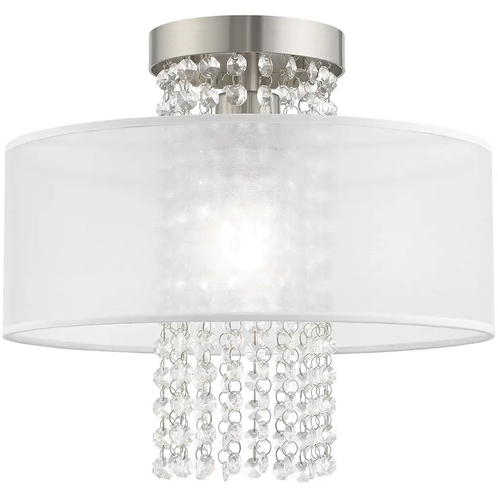 Collection: Alexis, Material: Steel, Finish Color: Brushed Nickel, Width: 13", Height: 12.5", Hanging Method: Flush, Lamping Type: Incandescent, Number Of Bulbs: 1, Wattage: 60 Watts, Moisture Rating: Dry Rated, Desc: Dazzle contemporary decor schemes with the upscale feel of this elegant ceiling mount. The Alexis fills a bling quotient with beautiful grade-A K9 crystal rods that cascades from a brushed nickel base with a hand crafted translucent fabric shade. Canopy Included: Yes / Shade Included: Yes / Canopy Diameter: 5.00. ,