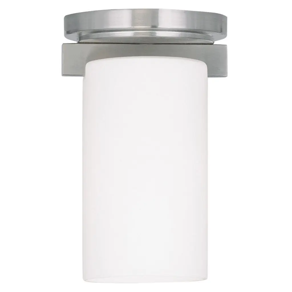 Collection: Astoria, Material: Steel, Finish Color: Brushed Nickel, Width: 5", Height: 8.25", Hanging Method: Flush, Lamping Type: Incandescent, Number Of Bulbs: 1, Wattage: 100 Watts, Moisture Rating: Damp Rated, Desc: The minimalist Astoria collection draws the eye to the soft, warm glow of the light emitted from the cylindrical satin opal etched glass shades available in a subdued brushed nickel or soft olde bronze. Canopy Included: Yes / Shade Included: Yes / Canopy Diameter: 5.00. ,