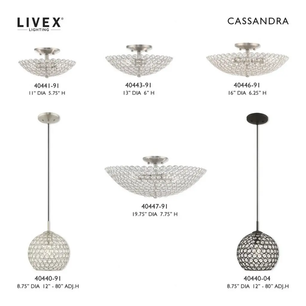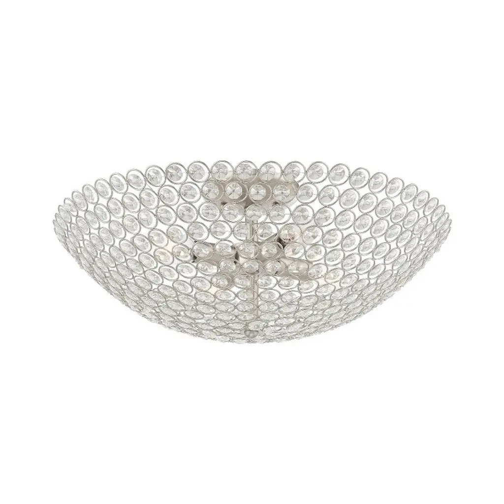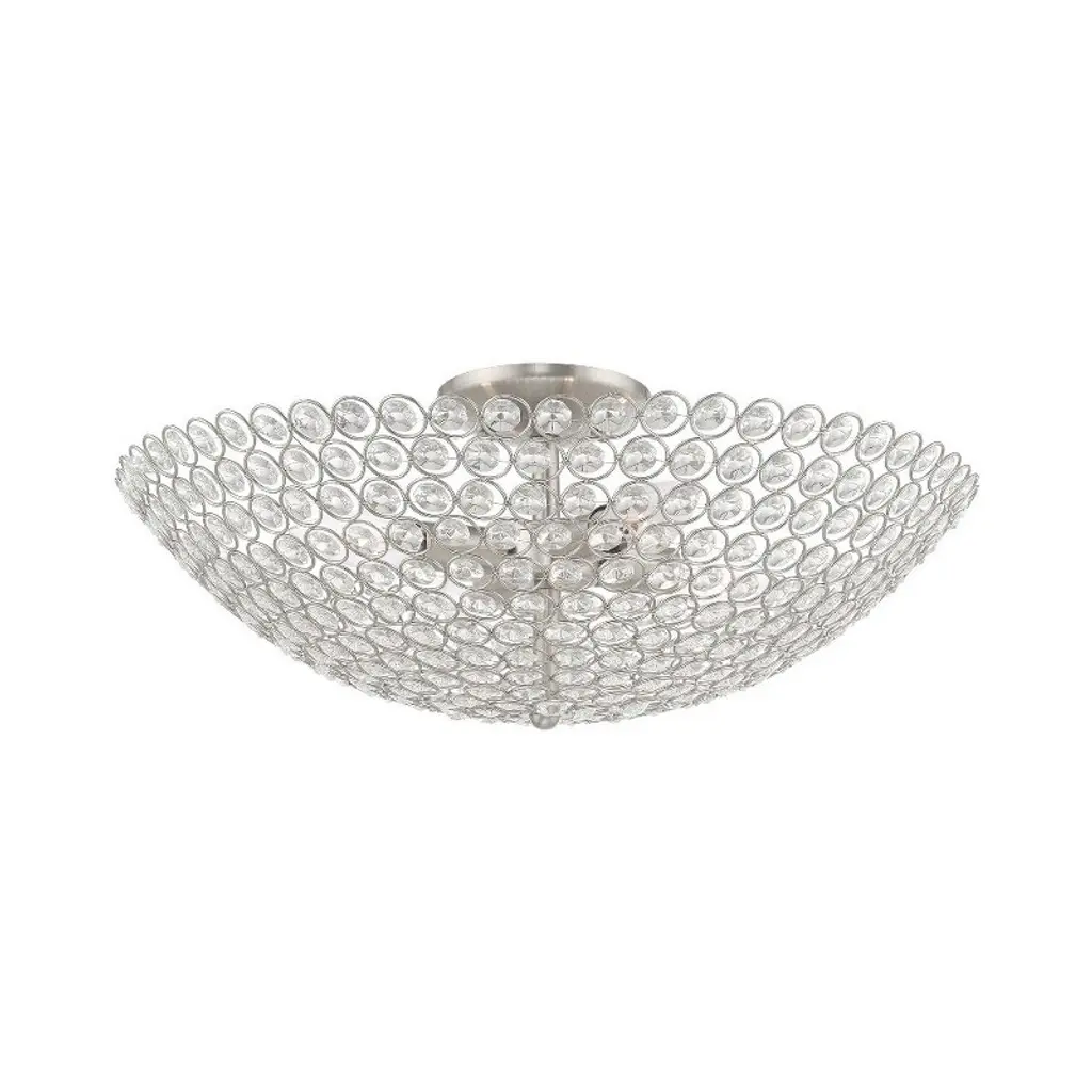 Collection: Cassandra, Material: Steel, Finish Color: Brushed Nickel, Width: 19.75", Height: 7.75", Hanging Method: Flush, Lamping Type: Incandescent, Number Of Bulbs: 4, Wattage: 60 Watts, Moisture Rating: Dry Rated, Desc: Cassandra features a dazzling array of glass K9 crystal suspended within a modern frame. Light artfully reflects and refracts through these elements to provide a dramatic focal point to any room. Canopy Included: Yes / Shade Included: Yes / Canopy Diameter: 5.00. ,