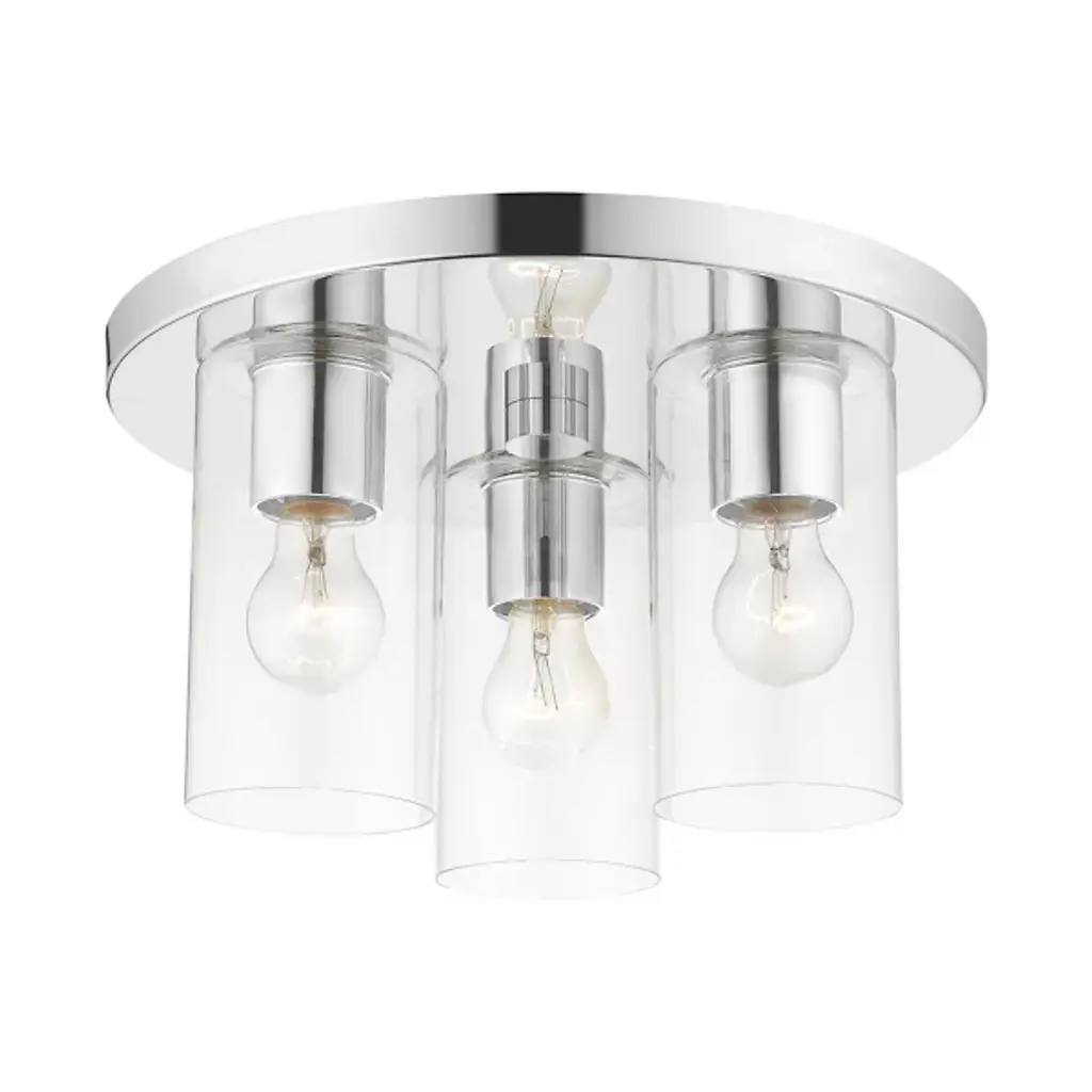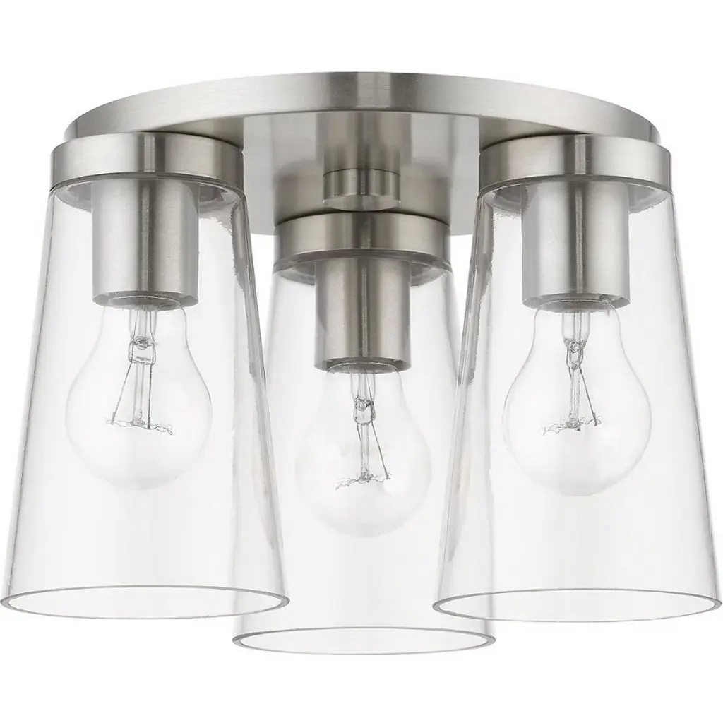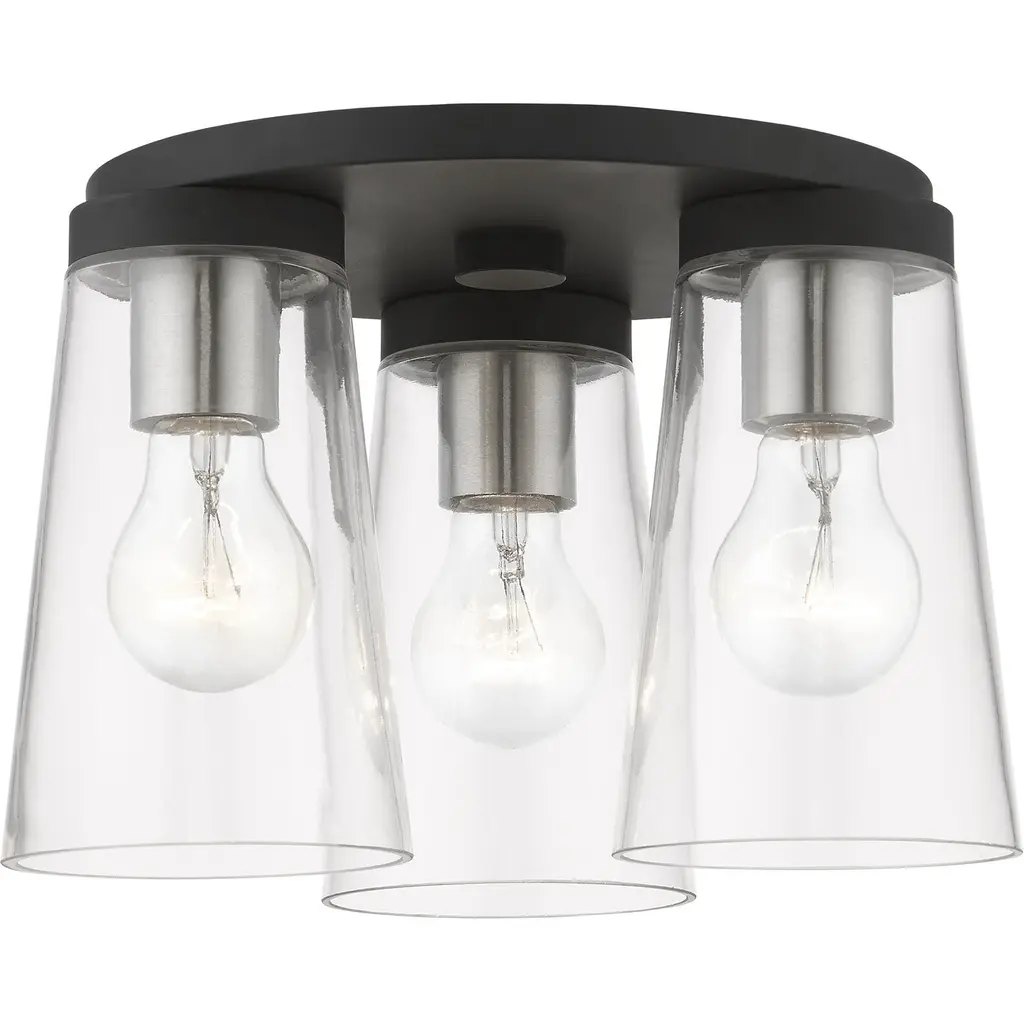 Collection: Cityview, Material: Steel, Finish Color: Brushed Nickel, Width: 11", Height: 7.13", Hanging Method: Flush, Lamping Type: Incandescent, Number Of Bulbs: 3, Wattage: 60 Watts, Moisture Rating: Dry Rated, Desc: Illuminate your home with a bright design from the Cityview collection. This large three-light flush mount features a black finish with brushed nickel finish accents and clear glass. Perfect for a contemporary or transitional luxury bathroom, bedroom, kitchen or hallway setting.,