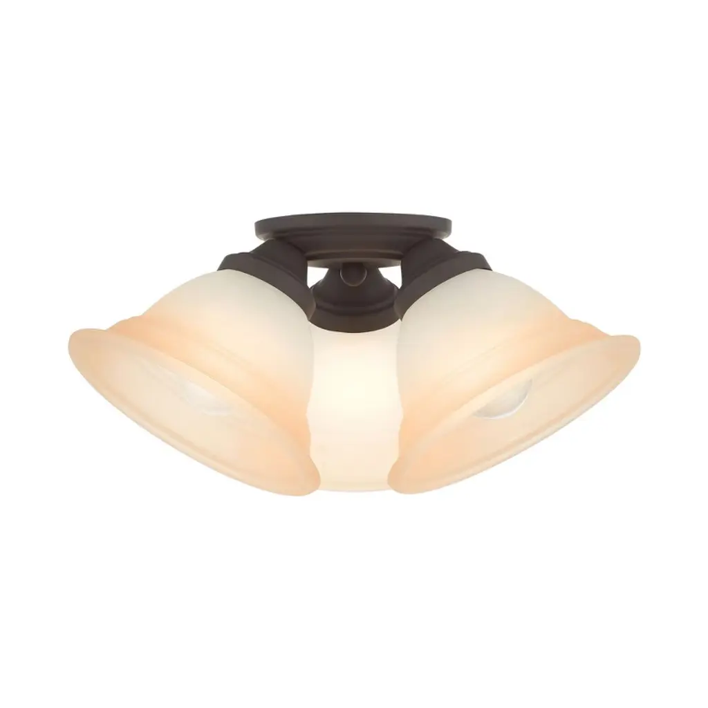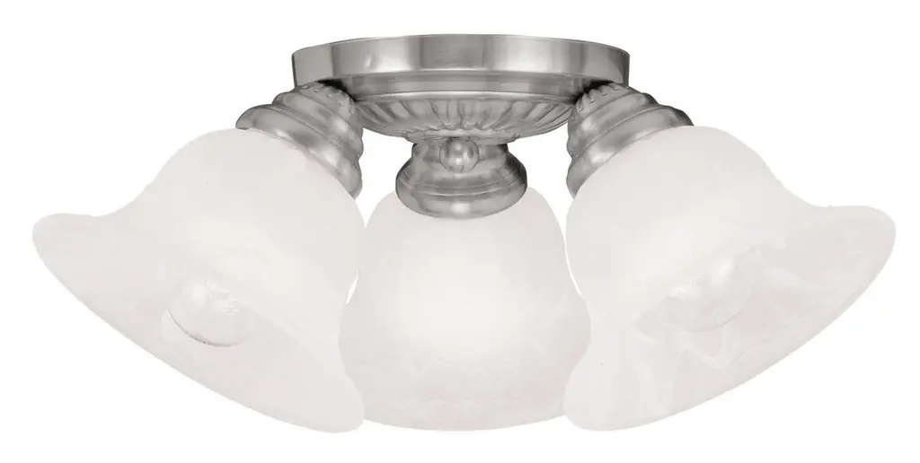 Collection: Edgemont, Material: Steel, Finish Color: Bronze, Width: 14.75", Height: 7.5", Hanging Method: Flush, Lamping Type: Incandescent, Number Of Bulbs: 3, Wattage: 60 Watts, Moisture Rating: Dry Rated, Desc: This three light flush mount from the Edgemont collection is a fine and handsome fixture that features white alabaster glass. Edgemont is comprised of traditional iron forms in a brushed nickel finish. Canopy Included: Yes / Shade Included: Yes / Canopy Diameter: 6.25. ,