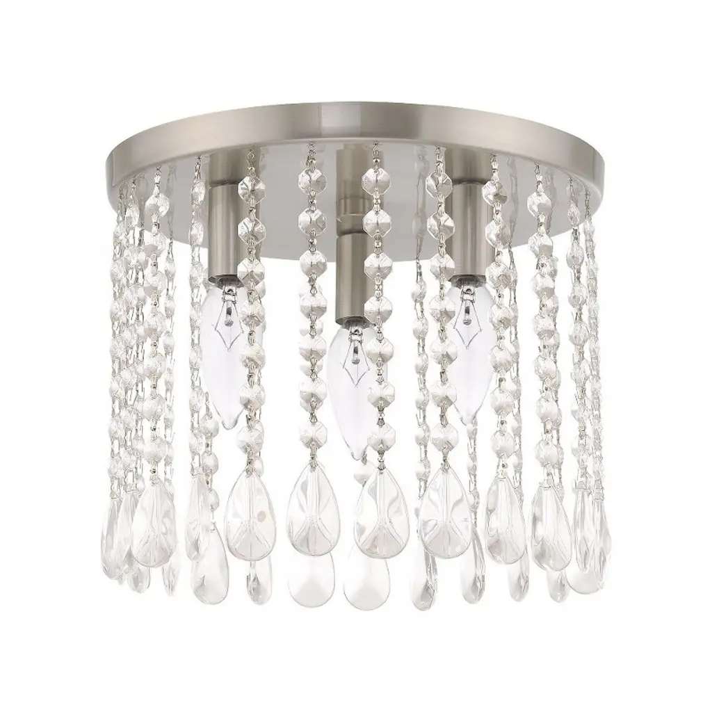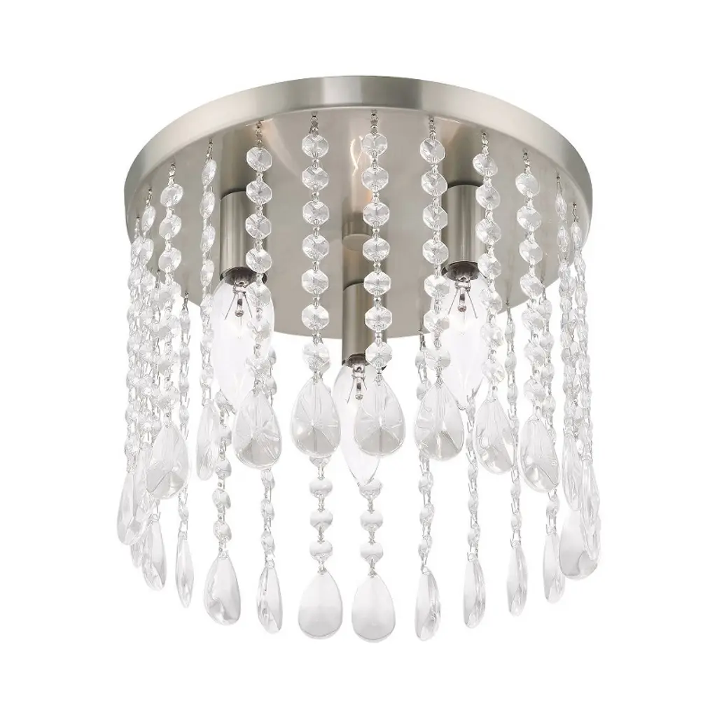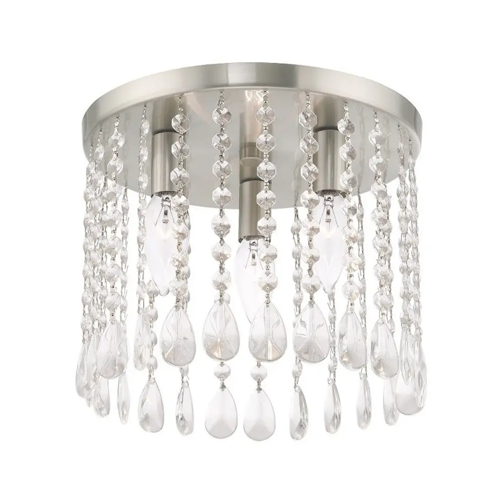 Collection: Elizabeth, Material: Steel, Finish Color: Brushed Nickel, Width: 11", Height: 9.25", Hanging Method: Flush, Lamping Type: Incandescent, Number Of Bulbs: 3, Wattage: 60 Watts, Moisture Rating: Dry Rated, Desc: The brushed nickel finish decorates the beautiful design of the Elizabeth three light ceiling mount with a refined quality. Clear crystal frills offer detailed elegance to the design of this ceiling light. Attract attention with the bold personality provided by this lovely fixture. Canopy Included: Yes / Shade Included: Yes / Canopy Diameter: 11.00. ,