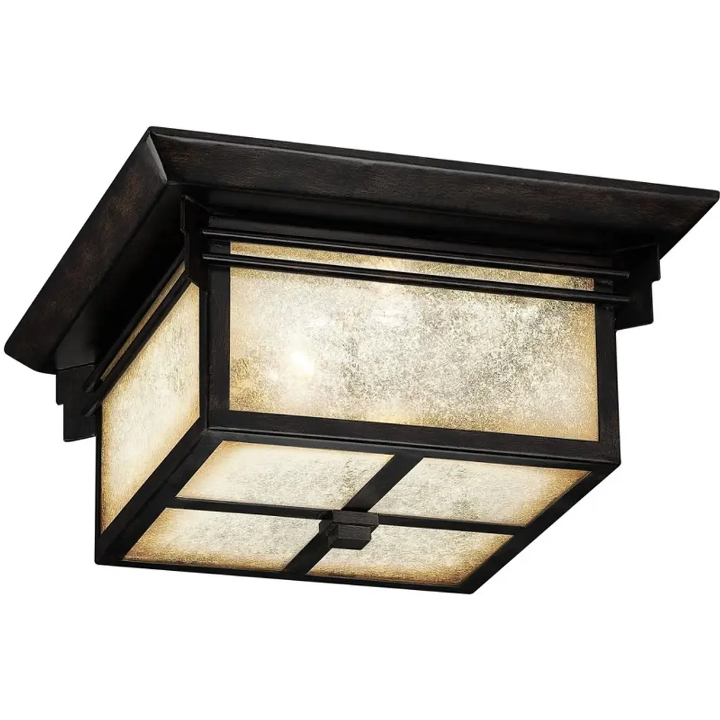 Collection: Montclair Mission, Material: Brass, Finish Color: Bronze, Width: 13", Height: 5.25", Length: 13", Hanging Method: Flush, Lamping Type: Incandescent, Number Of Bulbs: 3, Wattage: 60 Watts, Moisture Rating: Dry Rated, Desc: Bright, iridescent tiffany glass and bold lines put a fresh spin on a classic look in this beautiful Montclair Mission style outdoor ceiling mount lantern. Made from solid brass and finished in bronze, the T-bar overlay linear details on the frame give it an architectural window-inspired look. Shade Included: Yes. ,