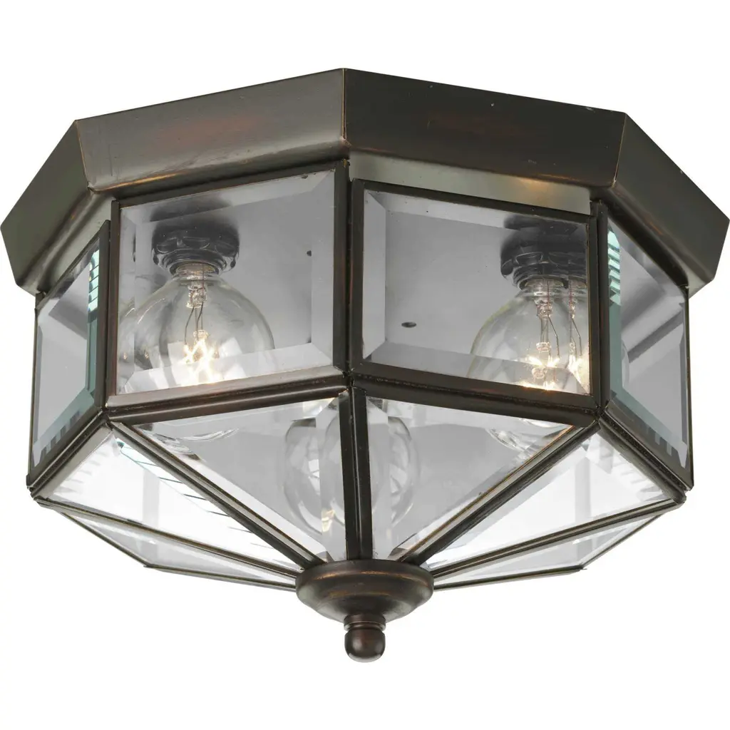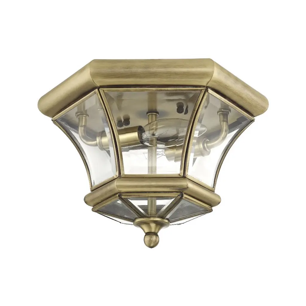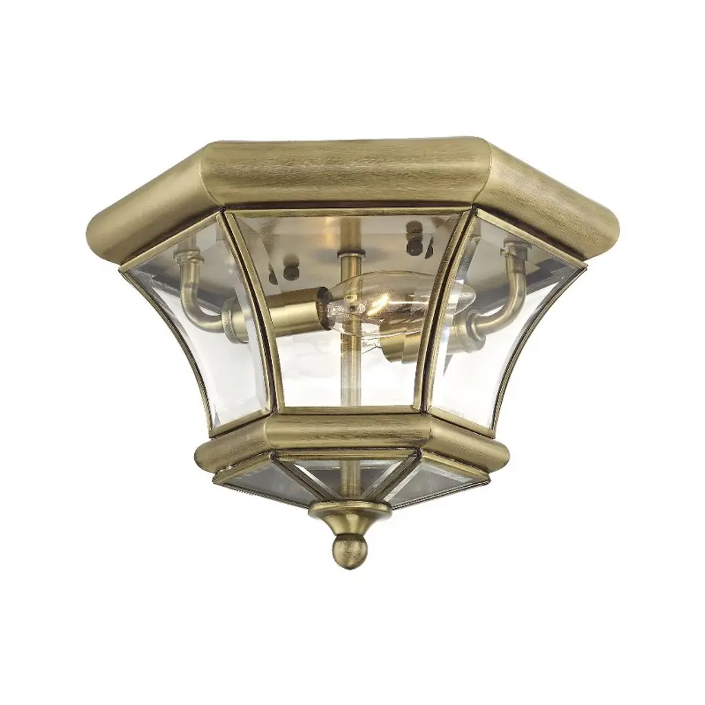 Collection: Monterey/Georgetown, Material: Brass, Finish Color: Antique Brass, Width: 10.5", Height: 7", Hanging Method: Flush, Lamping Type: Incandescent, Number Of Bulbs: 2, Wattage: 60 Watts, Moisture Rating: Dry Rated, Desc: This outdoor ceiling mount lantern features clean, crisp lines complemented by the graceful curves of glass. Handsome colonial styling makes this fixture a perfect addition to your outdoor spaces. Crafted from sturdy solid brass. Shade Included: Yes. ,