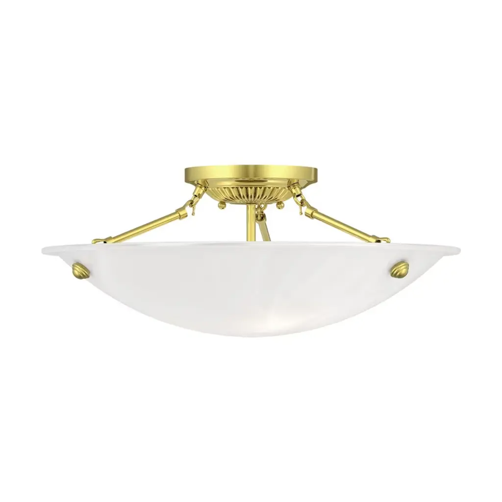 Collection: Oasis, Material: Steel, Finish Color: Polished Brass, Width: 12", Height: 7", Depth: 12", Hanging Method: Flush, Lamping Type: Incandescent, Number Of Bulbs: 3, Wattage: 60 Watts, Moisture Rating: Dry Rated, Desc: This ceiling mount features contour lines and a bowed profile. With an understated design, this piece is perfect for any space in your home. Featuring a white alabaster glass and brushed nickel finish, this fixture will effortlessly blend with your existing decor. Canopy Included: Yes / Shade Included: Yes / Canopy Diameter: 5.00. ,