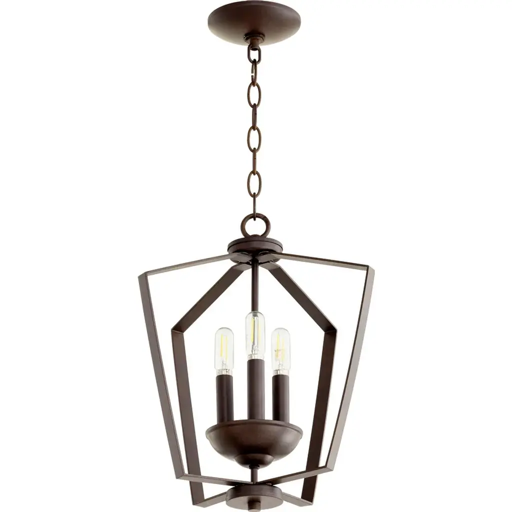 Collection: Prism, Material: Steel, Finish Color: Bronze, Width: 14", Height: 16", Hanging Method: Chain, Chain Length: 36", Lamping Type: Incandescent, Number Of Bulbs: 3, Wattage: 180 Watts, Moisture Rating: Dry Rated, Desc: Influenced by modern industrial style, our Prism antique brass finish pendant/flush mount light has a striking triangular shape. Sleek and contemporary, it's ideal for modern, contemporary or industrial style interiors. Canopy Included: Yes / Canopy Diameter: 5.00. ,