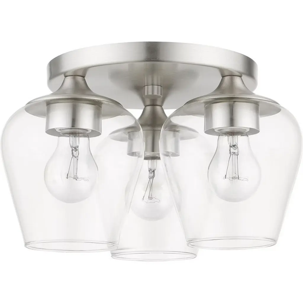 Collection: Willow, Material: Steel, Finish Color: Brushed Nickel, Width: 13", Height: 7.5", Hanging Method: Flush, Lamping Type: Incandescent, Number Of Bulbs: 3, Wattage: 40 Watts, Moisture Rating: Dry Rated, Desc: This three light flush mount from the willow collection has understated elegance. It features minimal details, clear curved glass with a satin brass finish and can fit into any decor.,