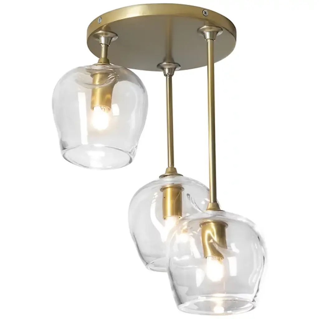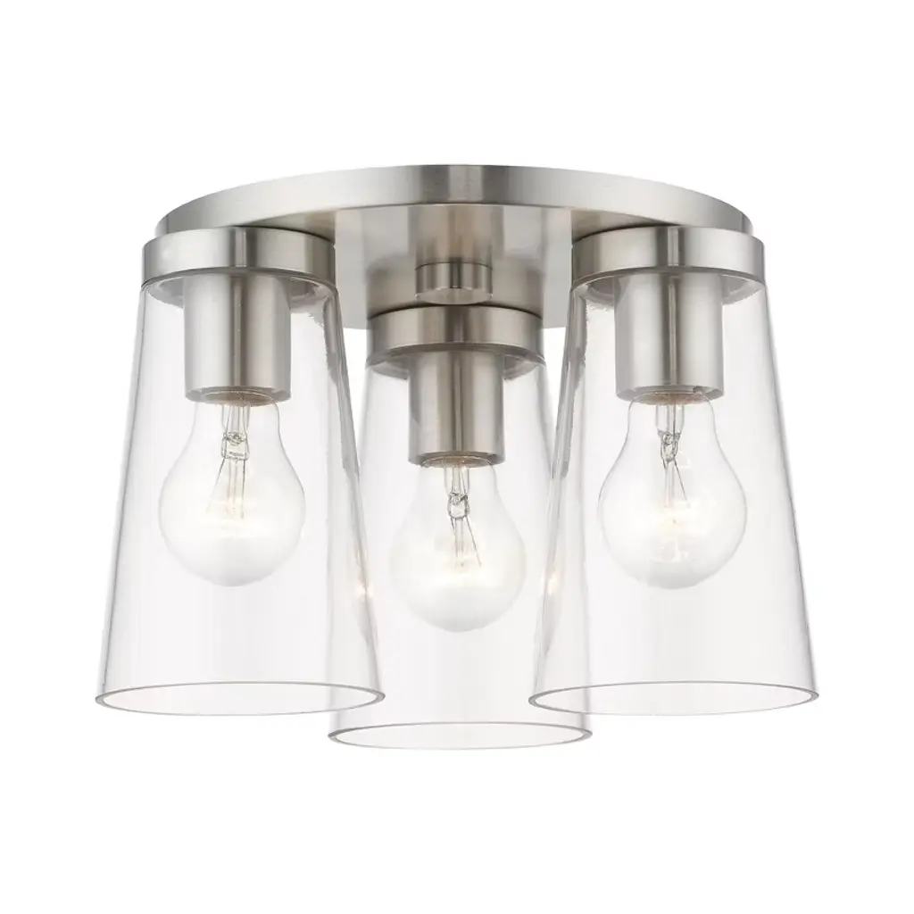 Collection: Willow, Material: Steel, Finish Color: Satin Brass, Width: 13", Height: 7.5", Hanging Method: Flush, Lamping Type: Incandescent, Number Of Bulbs: 3, Wattage: 40 Watts, Moisture Rating: Dry Rated, Desc: This three light flush mount from the willow collection has understated elegance. It features minimal details, clear curved glass with a satin brass finish and can fit into any decor.,