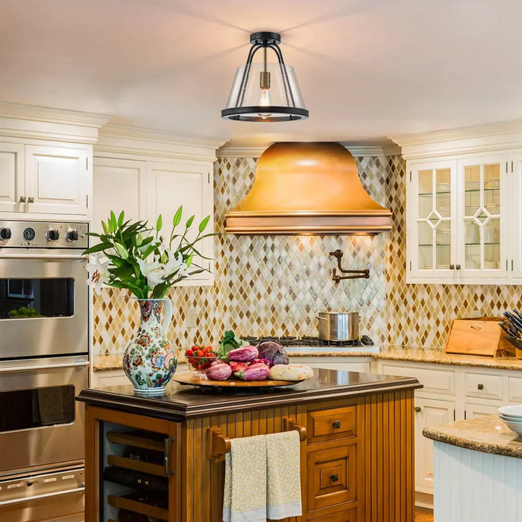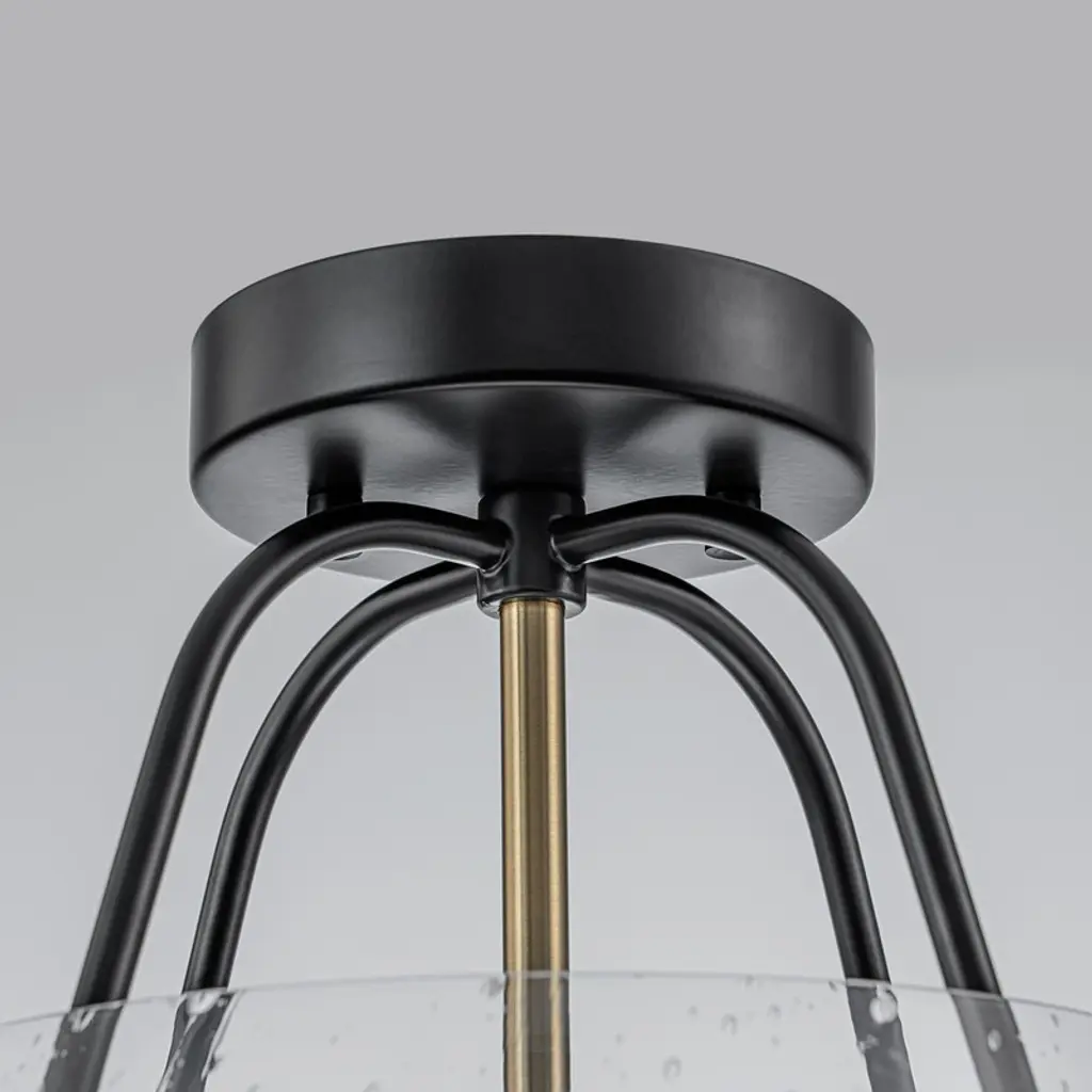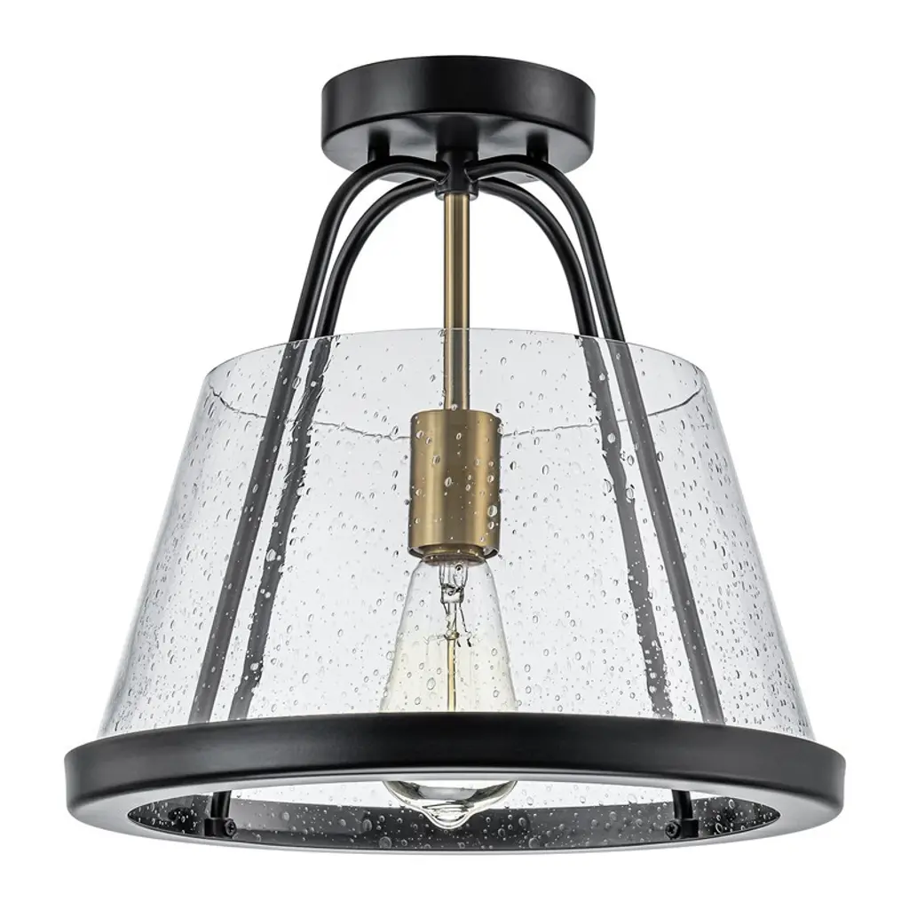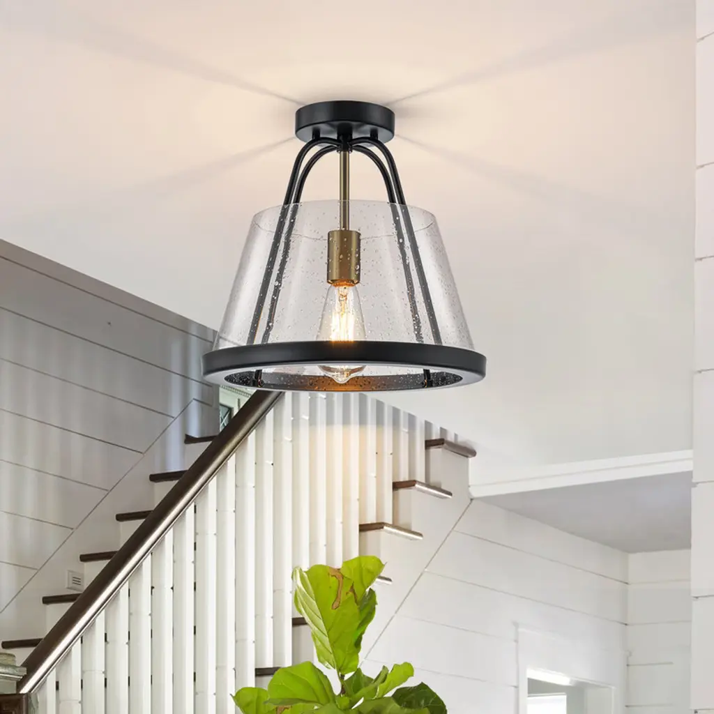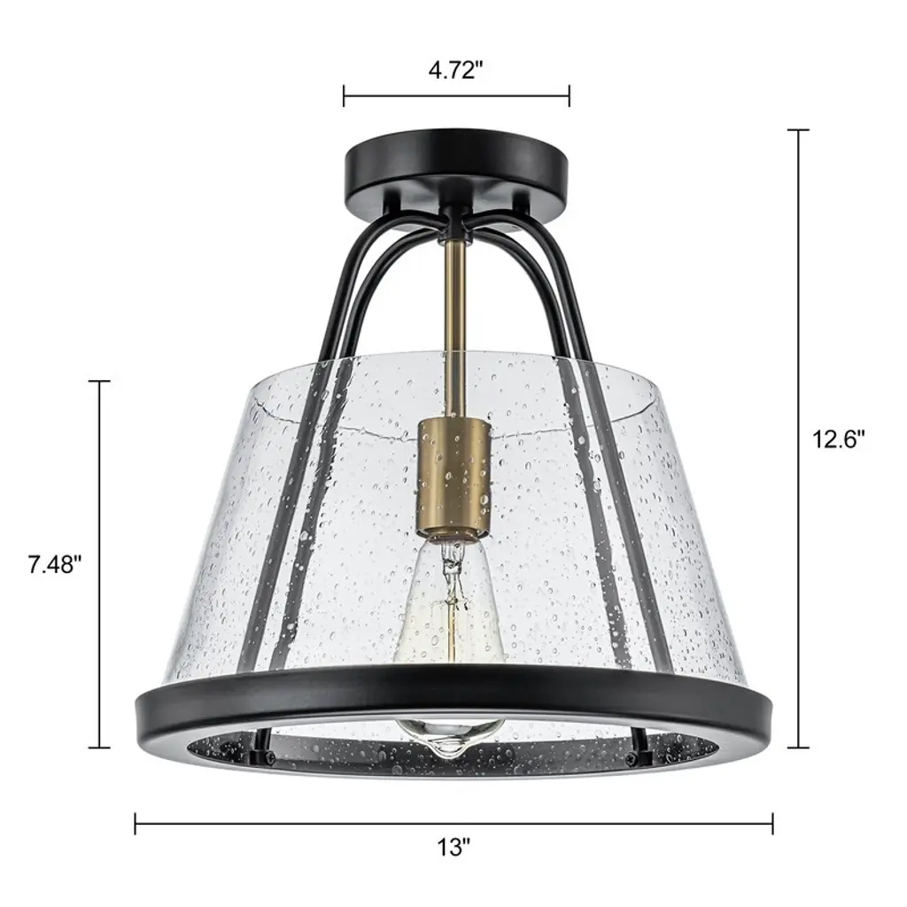 This single-light flush mount combines modern industrial style with the elegance of textured glass. The cone-shaped bubble glass shade features a unique finish, creating soft, diffused lighting with a touch of vintage charm. The fixture is finished with a matte black iron frame, complemented by a brushed gold socket and rod, making it a versatile addition to various decor styles. Measuring 13" in width x 7 1/4" in height, and with a total height of 12 5/8", it is perfect for installation in smaller spaces such as entryways, bedrooms, or hallways. The fixture is fitted with an E26 ceramic socket, supporting up to 40W bulbs (bulb not included), and is compatible with LED or Edison-style bulbs.