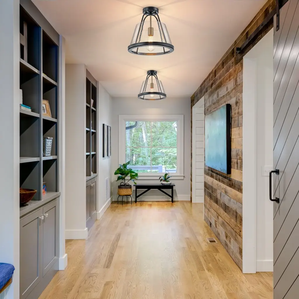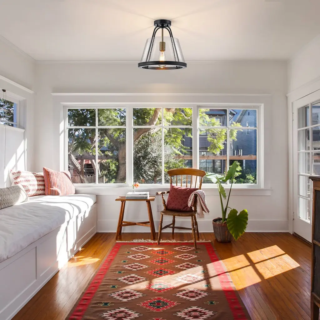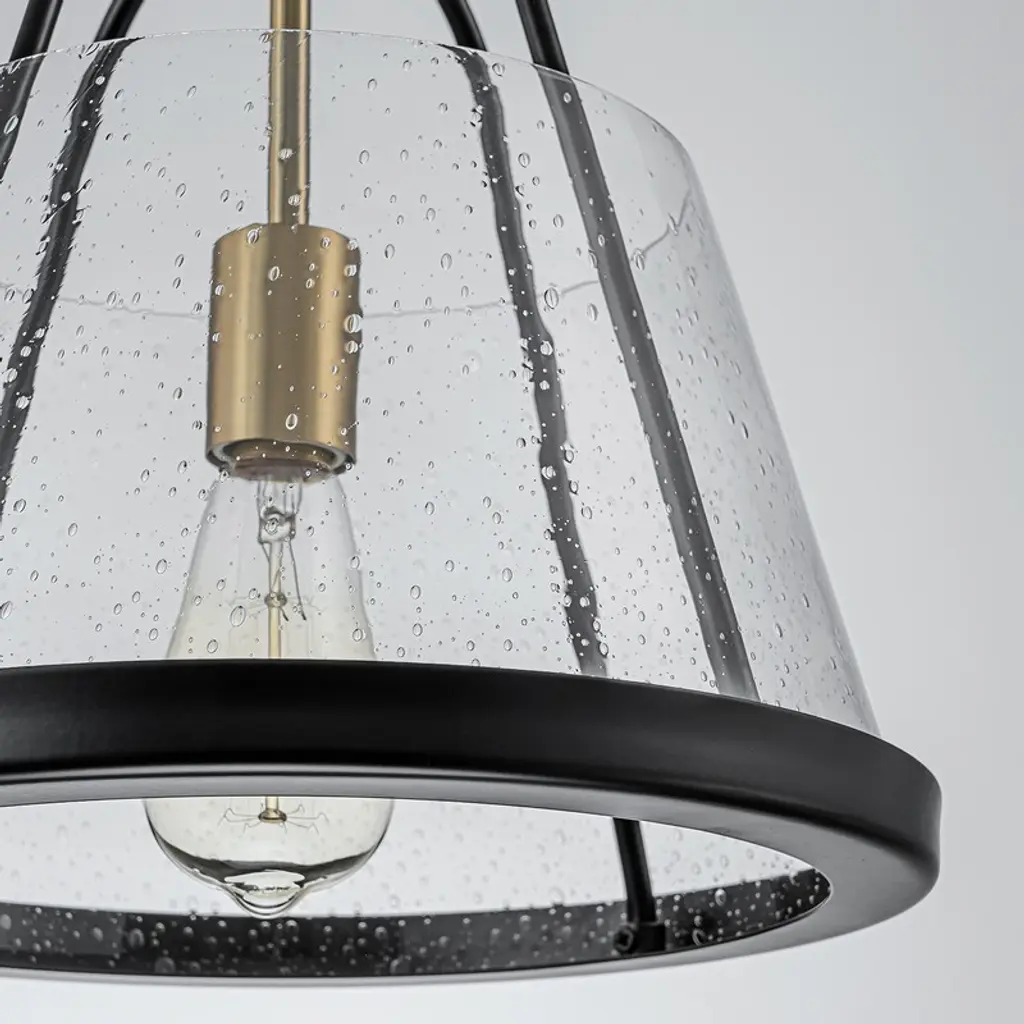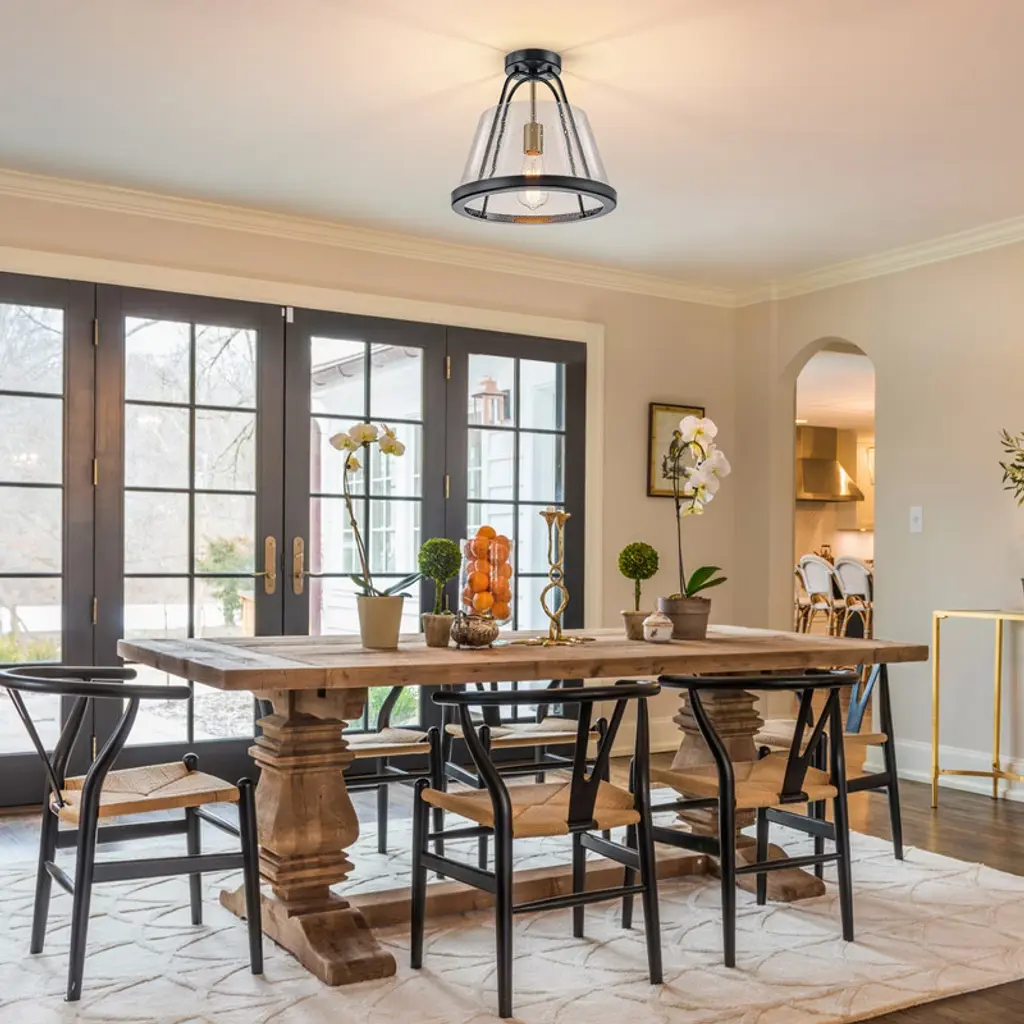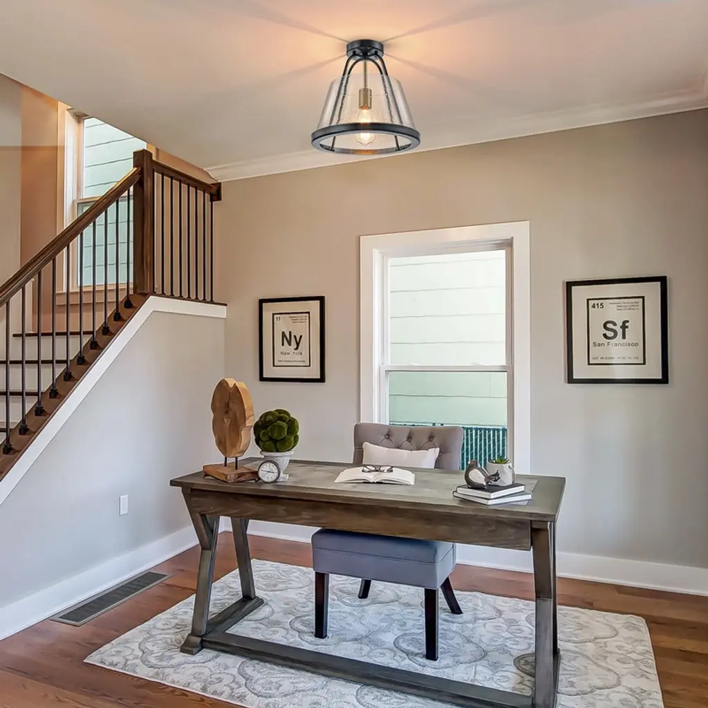 This single-light flush mount combines modern industrial style with the elegance of textured glass. The cone-shaped bubble glass shade features a unique finish, creating soft, diffused lighting with a touch of vintage charm. The fixture is finished with a matte black iron frame, complemented by a brushed gold socket and rod, making it a versatile addition to various decor styles. Measuring 13" in width x 7 1/4" in height, and with a total height of 12 5/8", it is perfect for installation in smaller spaces such as entryways, bedrooms, or hallways. The fixture is fitted with an E26 ceramic socket, supporting up to 40W bulbs (bulb not included), and is compatible with LED or Edison-style bulbs.