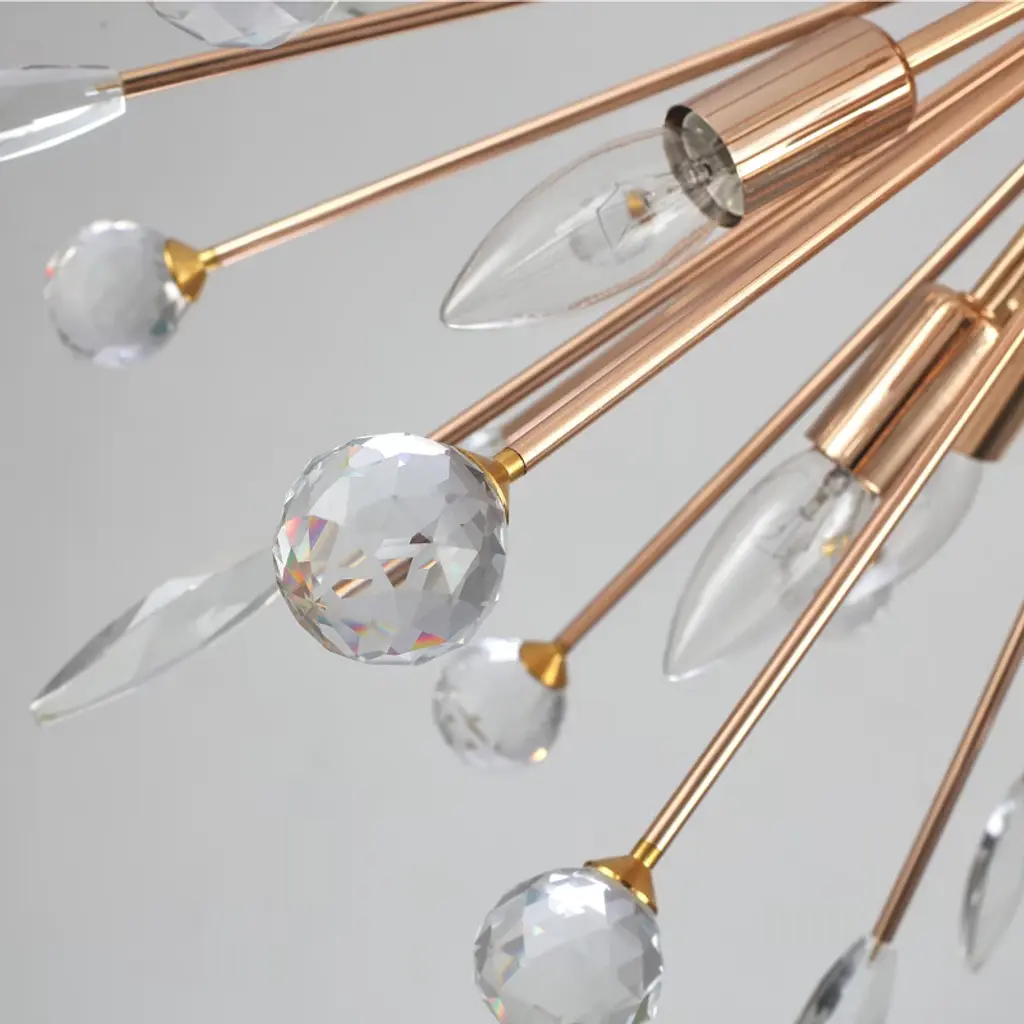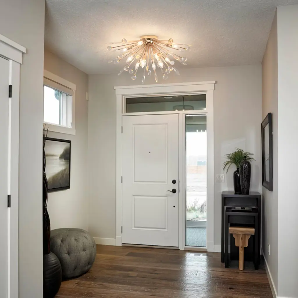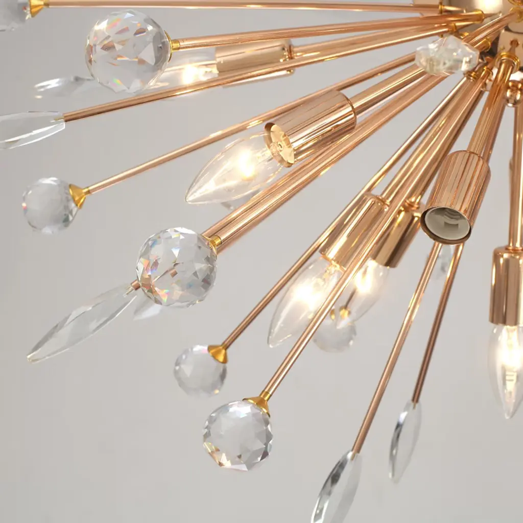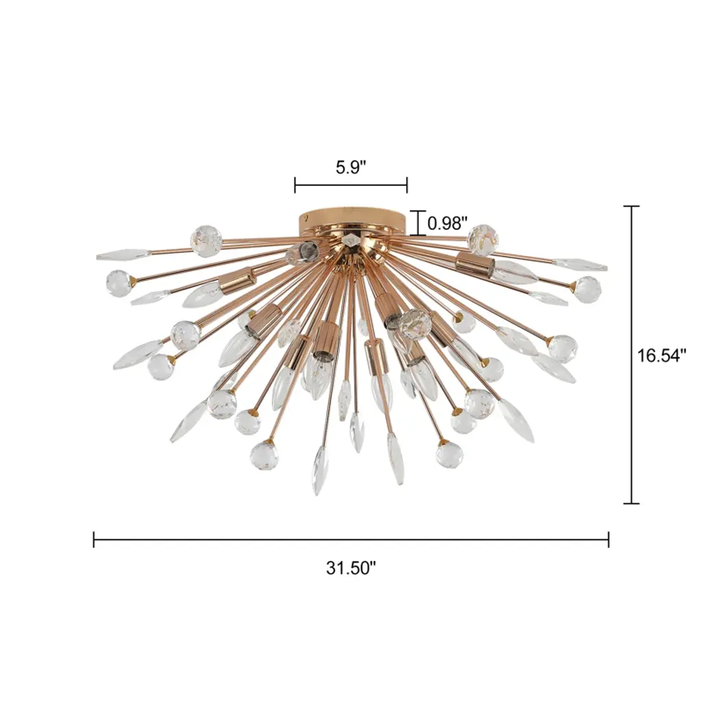 Bring modern elegance and dynamic beauty into your space with this 12-light ceiling fixture, designed in a radiant dandelion style. It features 18 sparkling crystal spheres and 18 detailed leaf-shaped metal pieces that fan out from the center, adding depth and charm to any room. The twelve E12 sockets allow for flexible lighting choices (bulbs not included), while the flush mount profile keeps it compact and ceiling-friendly. Ideal for bedrooms, dining areas, or hallways seeking a glamorous statement piece.