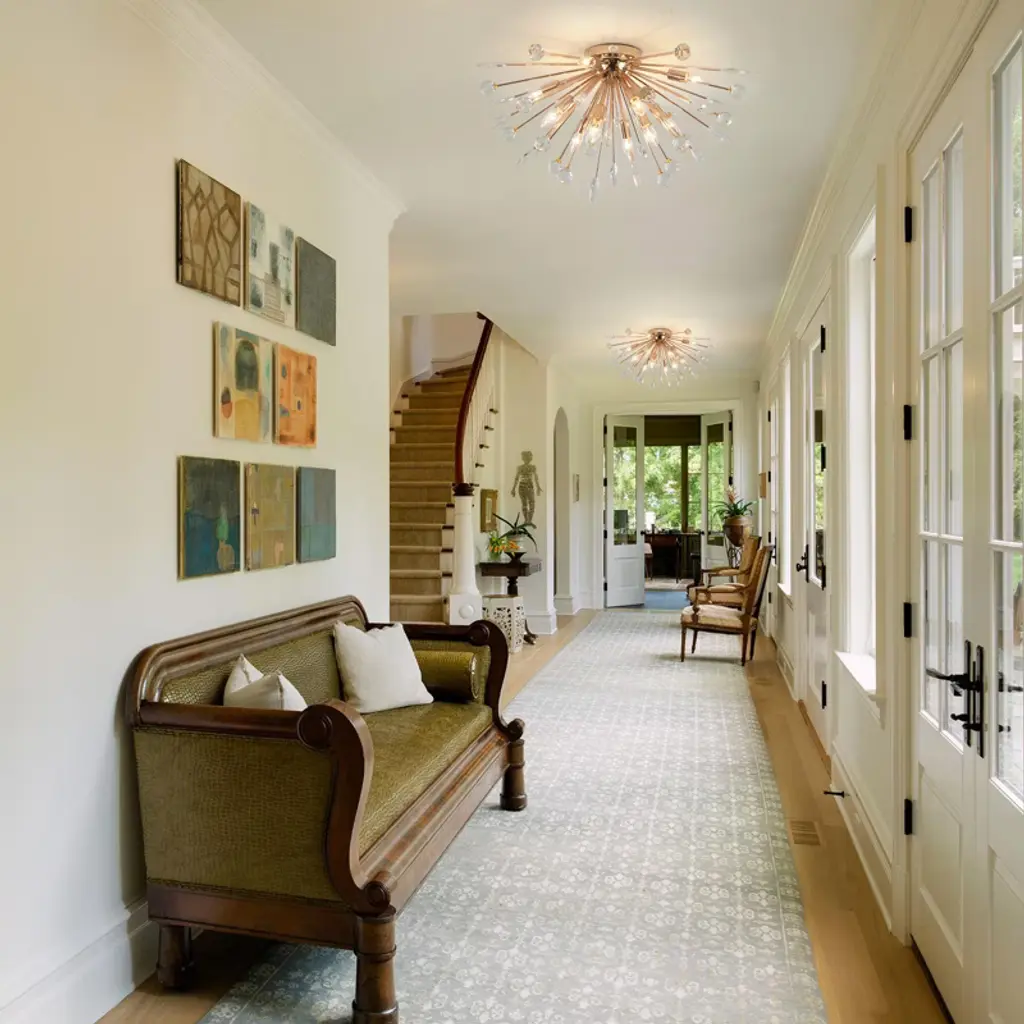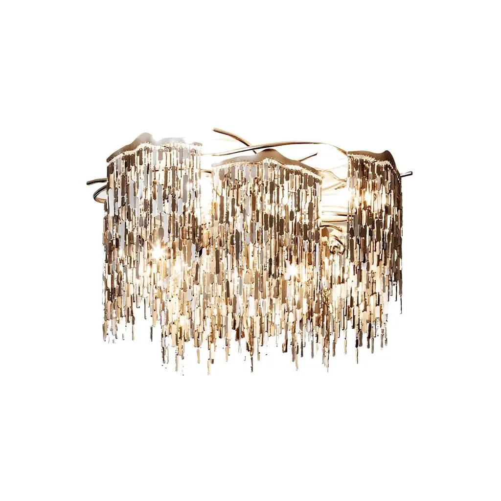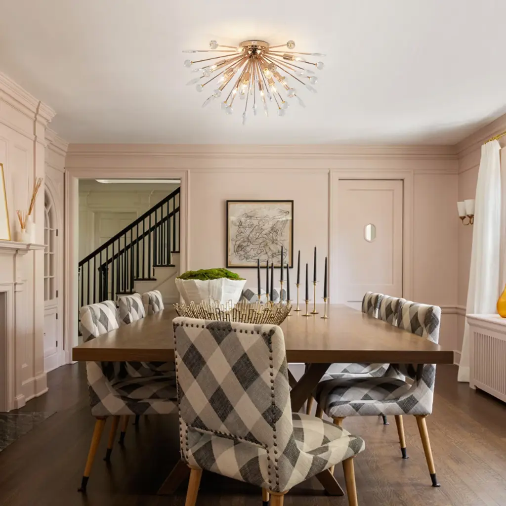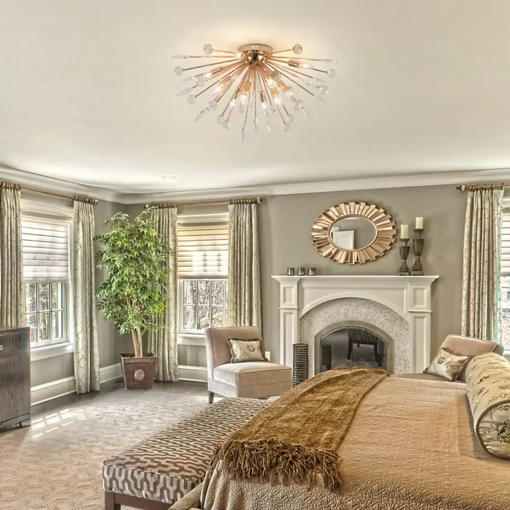Bring modern elegance and dynamic beauty into your space with this 12-light ceiling fixture, designed in a radiant dandelion style. It features 18 sparkling crystal spheres and 18 detailed leaf-shaped metal pieces that fan out from the center, adding depth and charm to any room. The twelve E12 sockets allow for flexible lighting choices (bulbs not included), while the flush mount profile keeps it compact and ceiling-friendly. Ideal for bedrooms, dining areas, or hallways seeking a glamorous statement piece.