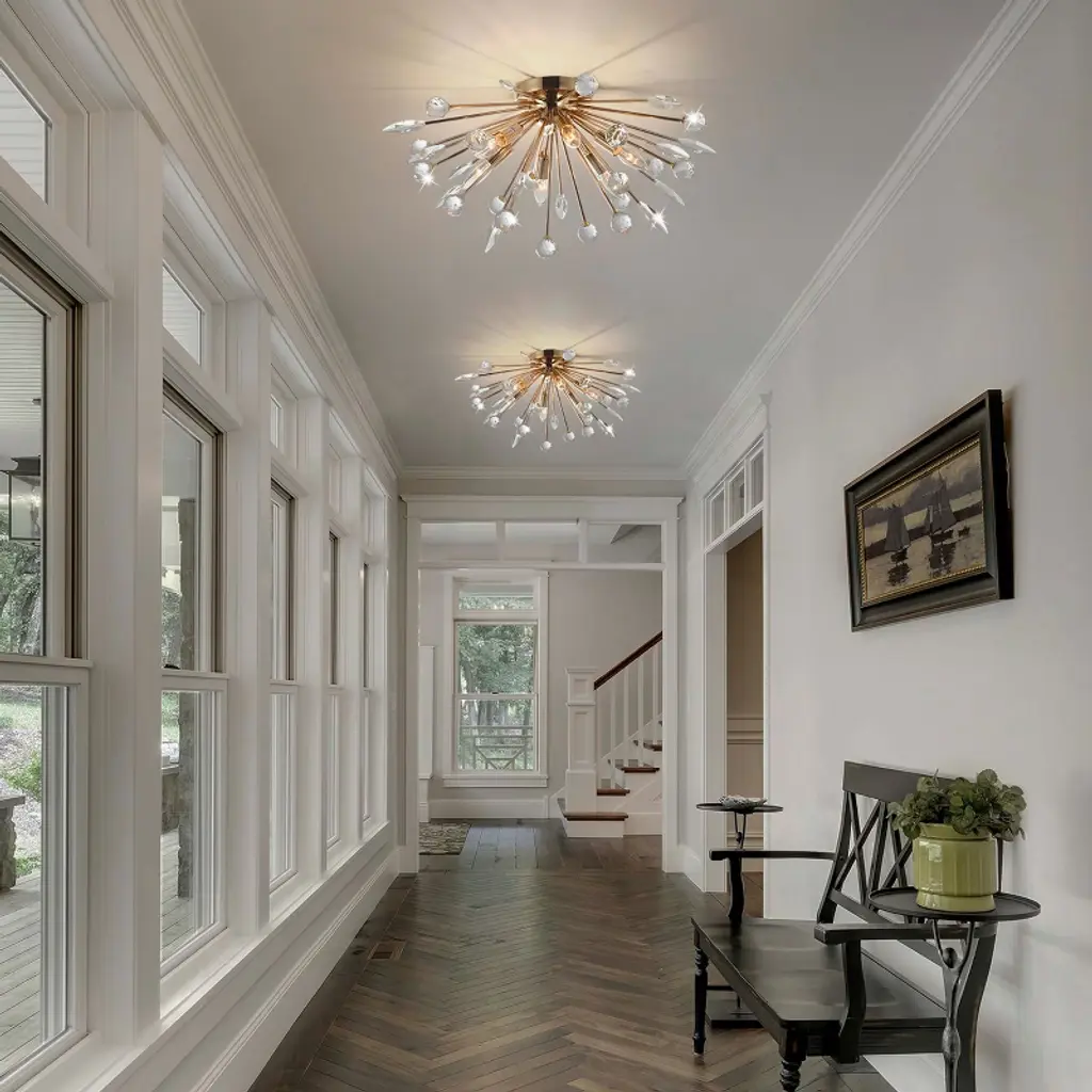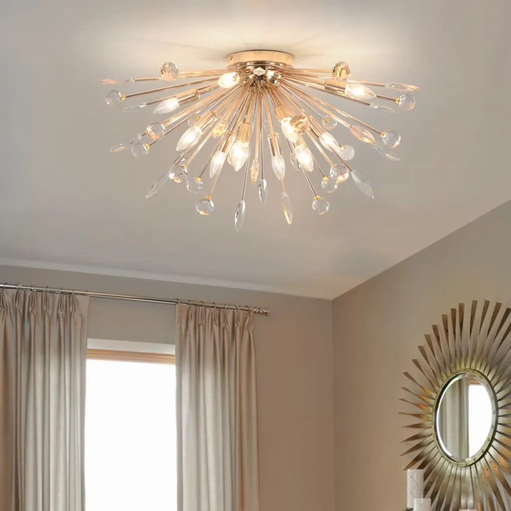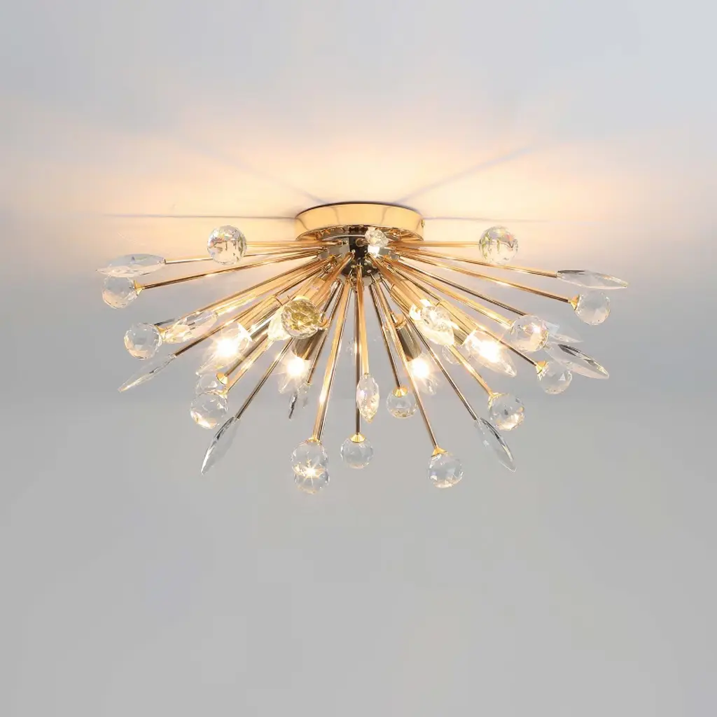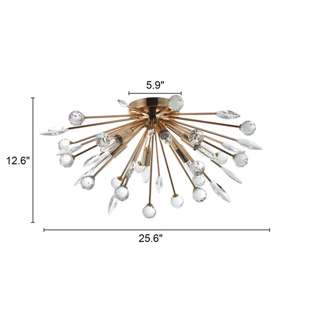 Illuminate your space with this 6-light 25 3/5" dandelion firework crystal flush mount ceiling light. Featuring an eye-catching burst design, this fixture creates a dazzling display of light and shadow. The crystal accents enhance its elegance, making it perfect for modern interiors. Easy to install and crafted for durability, this light adds a touch of luxury to any room.