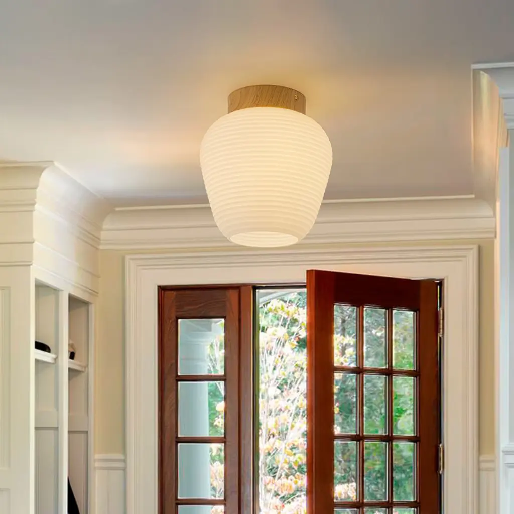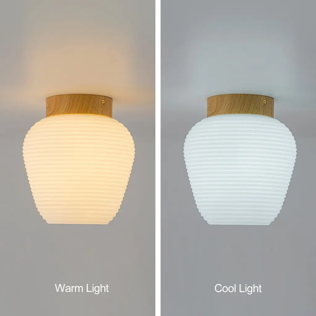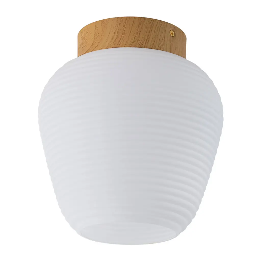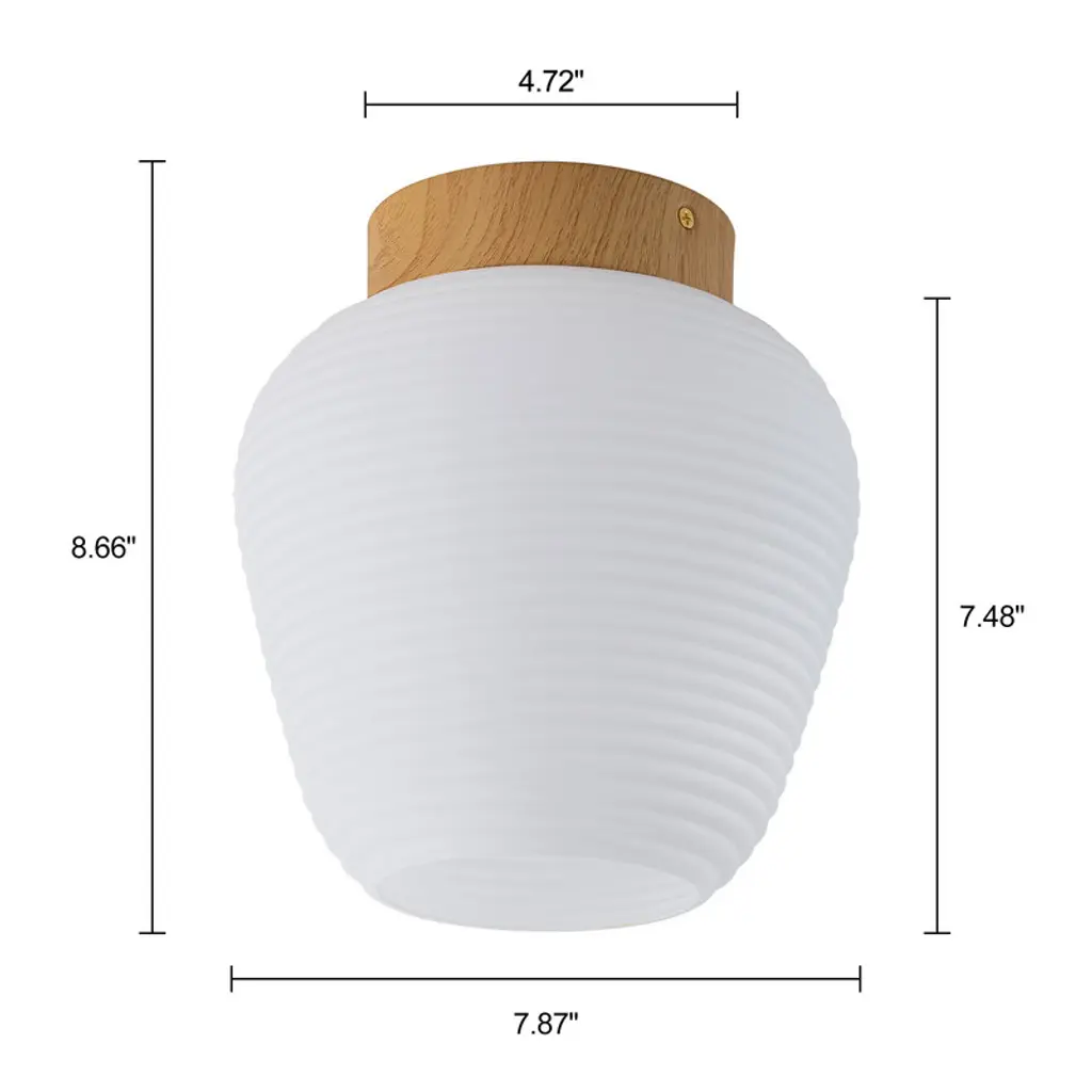 This flush mount ceiling light brings softness and subtle elegance to any room with its horizontally textured white jade glass shade. Inspired by the natural look of a silk cocoon, the design offers both organic texture and warm, diffused light. The compact fixture measures 7 3/4" wide x 7 1/2" high, with a total height of 8 3/5", making it ideal for low ceilings or smaller rooms such as entryways, hallways, or bedrooms. The faux wood grain ceiling plate (4 7/10" wide) adds a warm natural touch through a water-transfer finish. Fitted with a heat-resistant E26 ceramic socket, this light supports bulbs up to 60W (bulb not included).